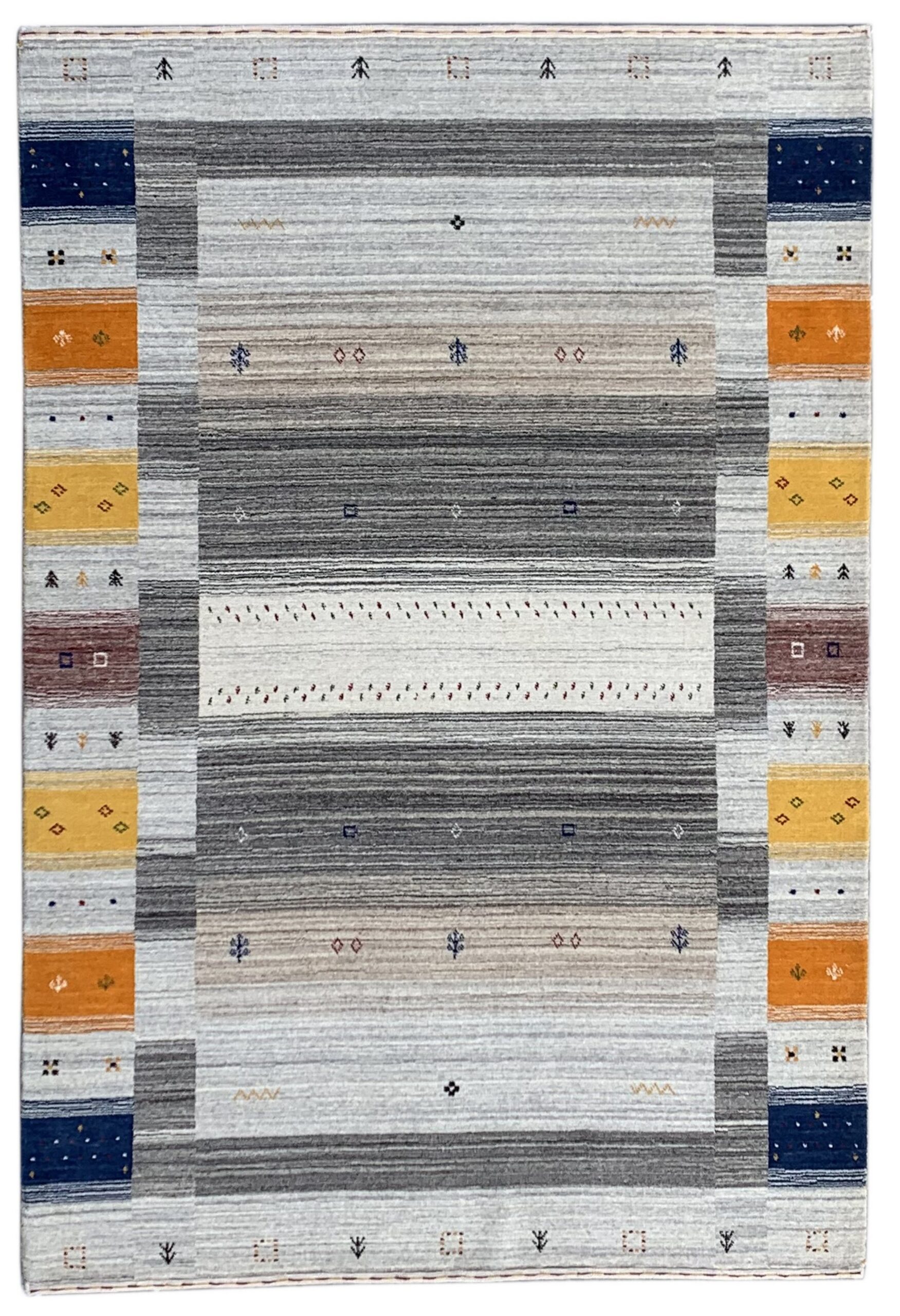 The central field utilizes a sophisticated, striated abrash effect, moving smoothly through shades of pale gray, taupe, and charcoal, providing remarkable depth and texture. This neutral ground is dramatically framed by vertical columns of saturated color—deep indigo, brilliant ochre, and warm saffron—making it a striking example of multicolor jewel tone rugs.