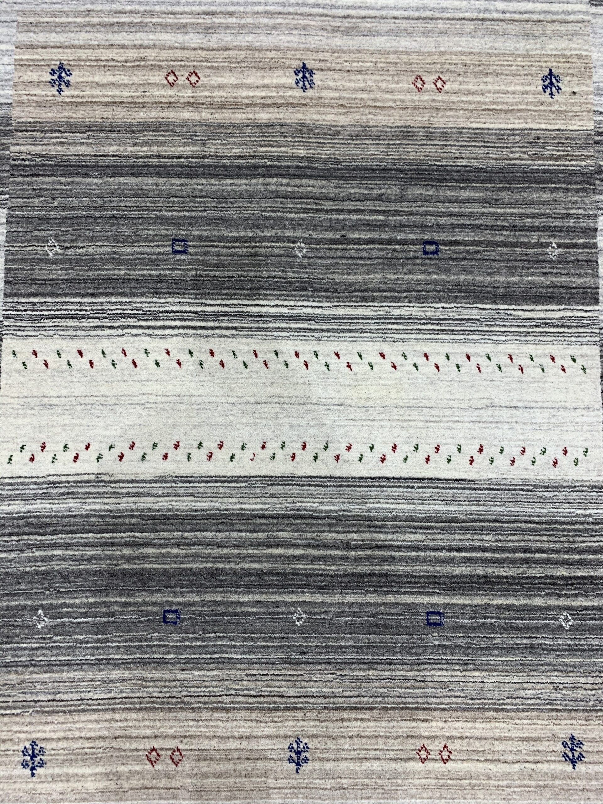 Hand-knotted from durable, luxurious wool, the rug’s construction ensures both a soft handle and lasting resilience. Scattered across the field are highly stylized, minimalist tribal motifs, including abstract diamonds and small tree forms, which nod subtly to nomadic heritage while maintaining a clean, modern aesthetic suitable for new area rugs.