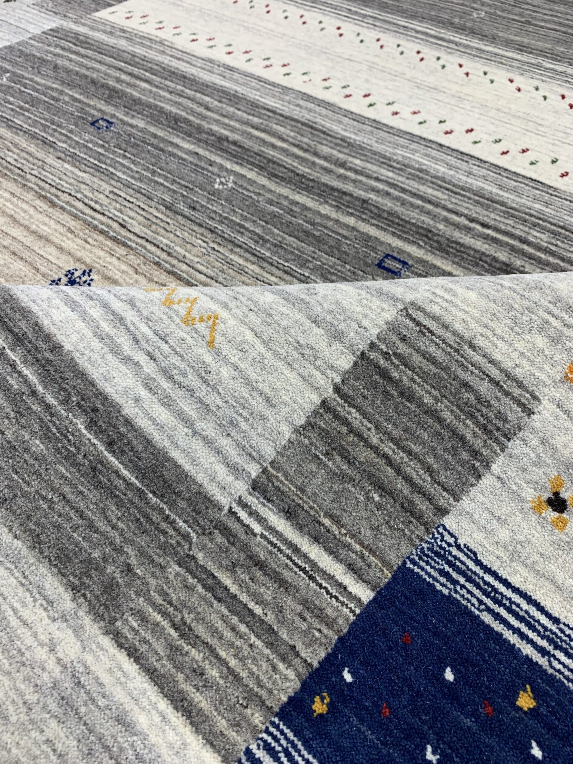 Classic Gabbeh Multicolor Hand Knotted Wool Rug, Country of Origin: India. This exceptional piece exemplifies the modern evolution of the Gabbeh style, combining traditional hand-knotting techniques with a contemporary color palette. Crafted in India, a region renowned for producing high-quality textiles, this rug showcases the masterful weaving traditions of Indian rugs.
