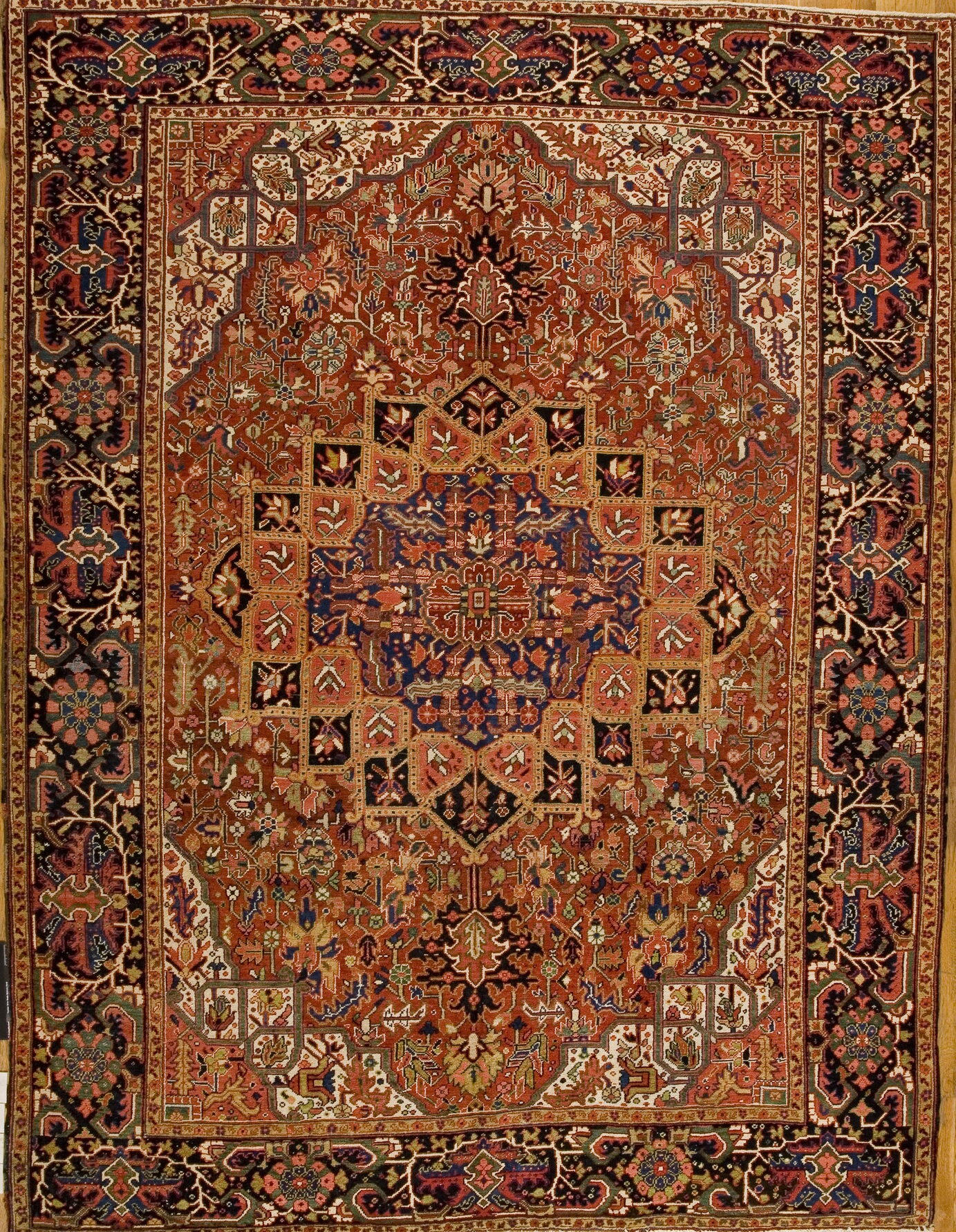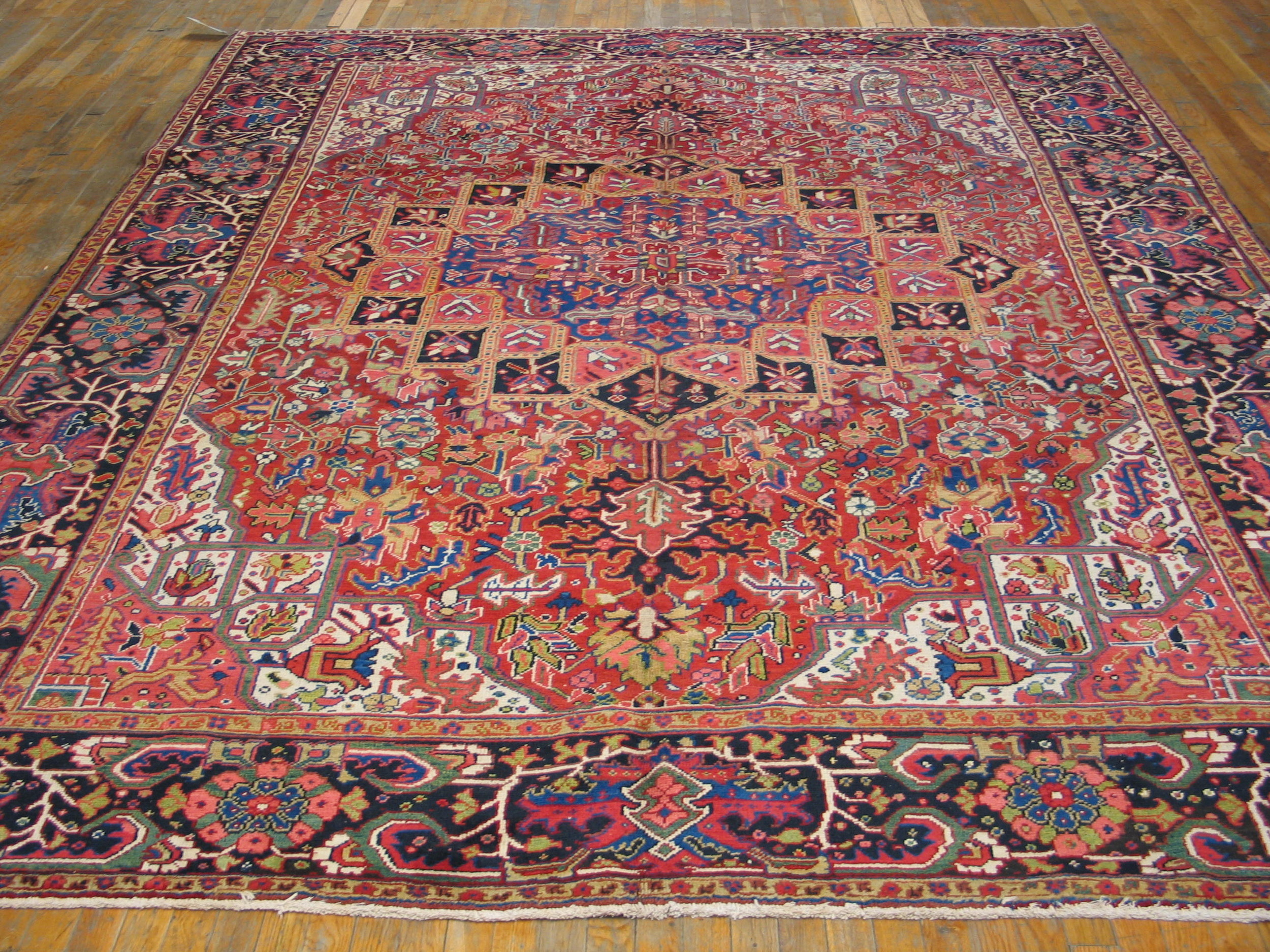 While the overall structure adheres to the rigid, rectilinear design principles of the region, the intricate detailing within the spandrels and the main border reveals complex, stylized floral patterns. This masterful balance between structure and organic detail is the defining hallmark of the finest Heriz rugs from this period.