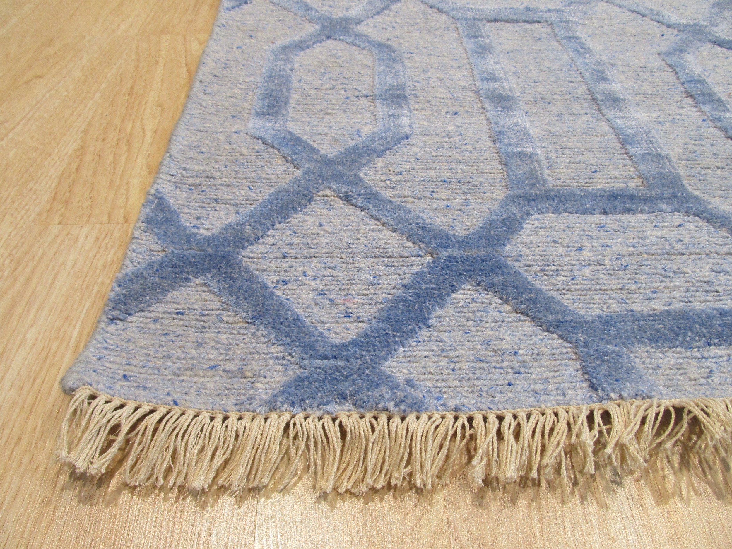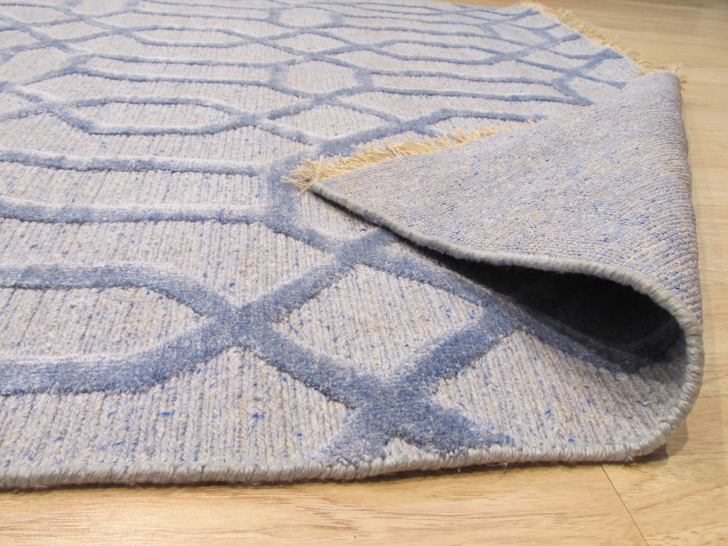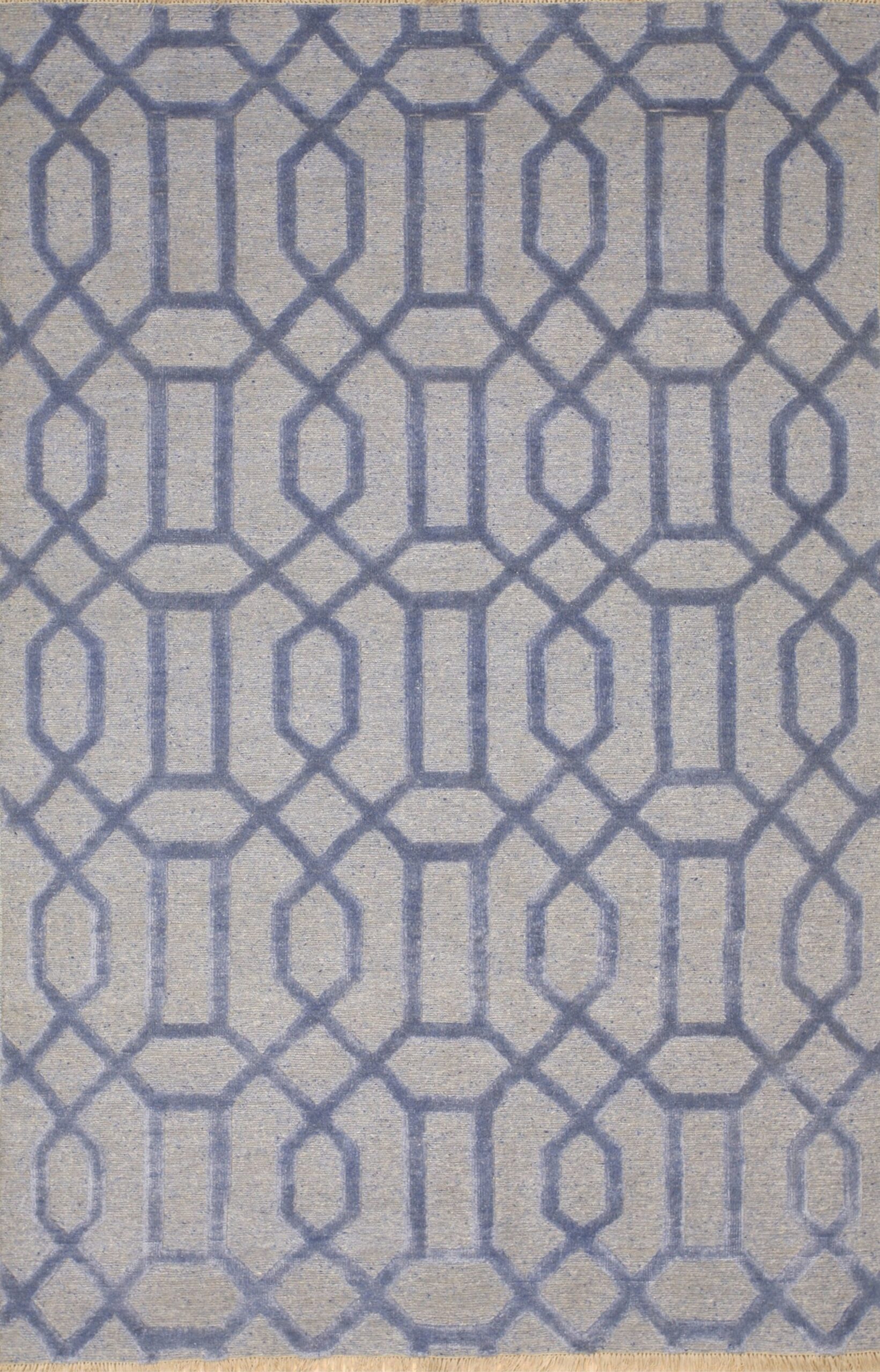 The design features an interlocking trellis pattern, rendered in a sophisticated two-tone palette. A deep, saturated blue defines the structural lines, set against a softer, heathered grey-blue ground, making it a standout among blue color rugs. This restrained use of color ensures the rug remains versatile while providing a powerful visual anchor in any room.