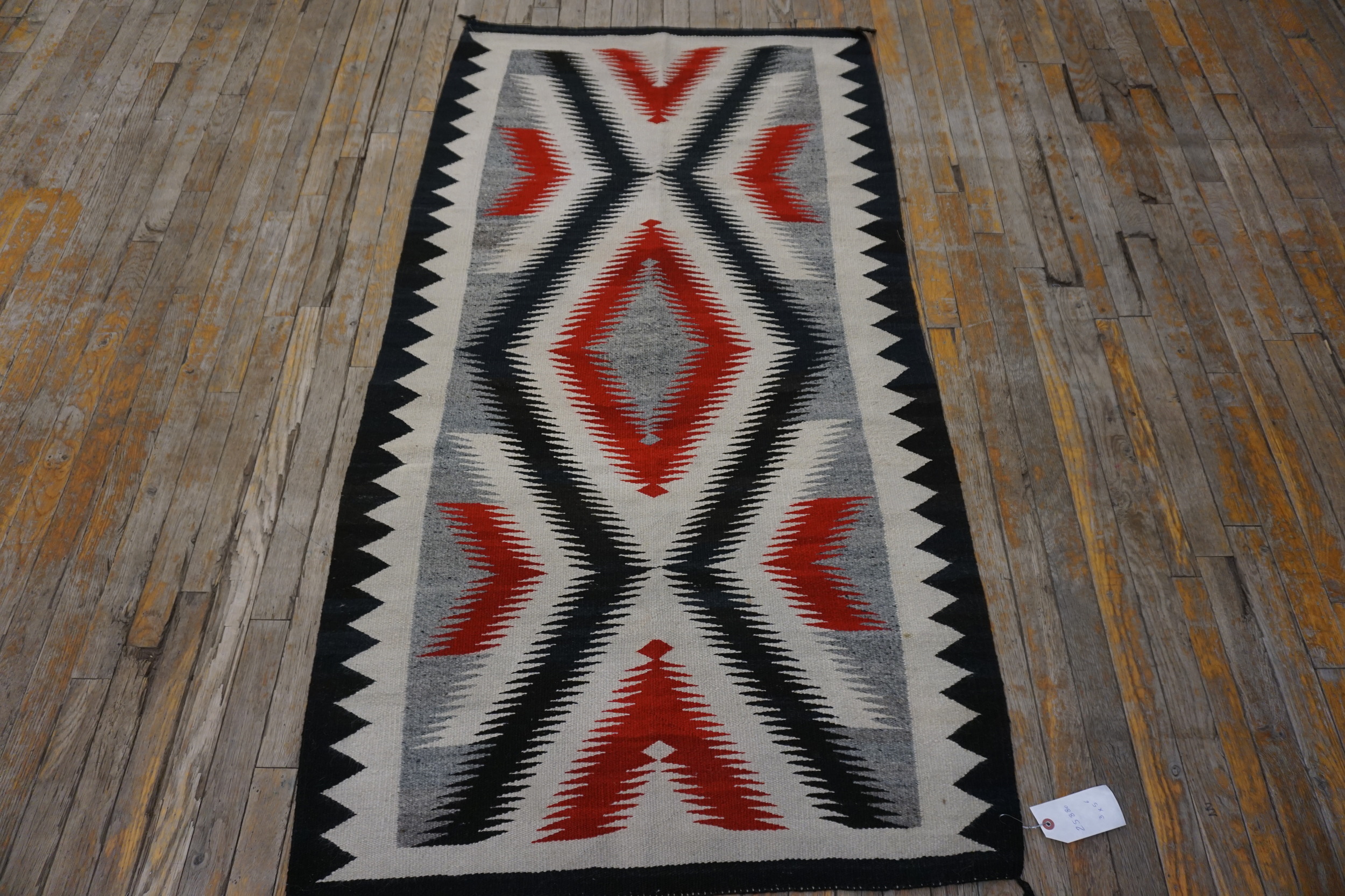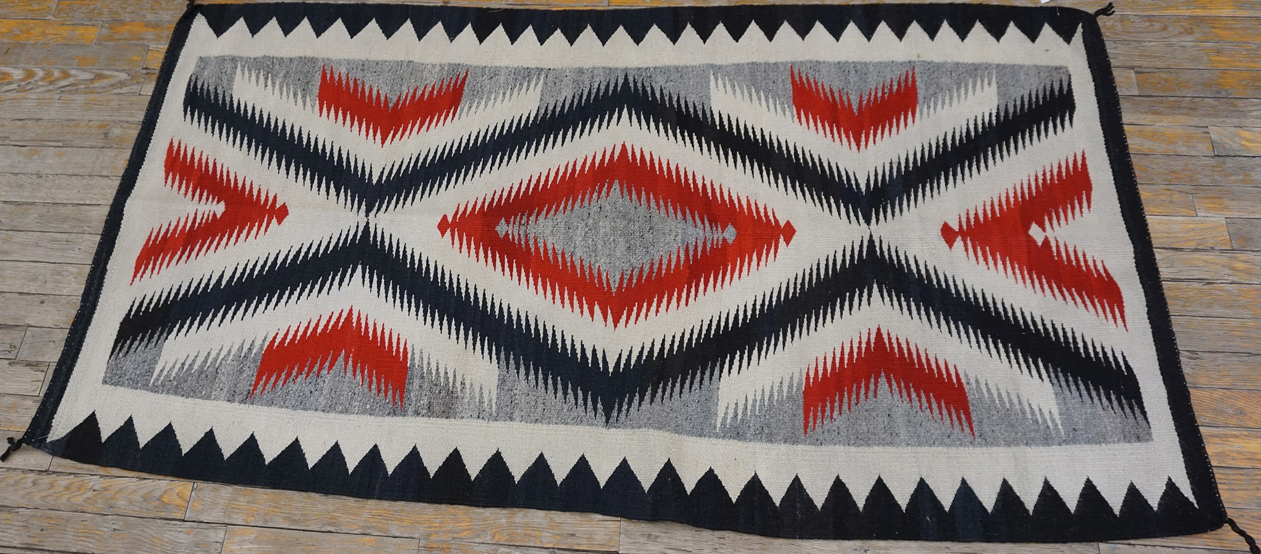 Woven entirely in wool, this rectangle rug offers durability and texture, characteristic of traditional Southwestern textiles. Its dimensions classify it as one of the small scatter size rugs, perfect for placement beside a bed, in an entryway, or layered over a larger textile, offering a concentrated dose of authentic American artistry from the 1930s.