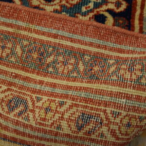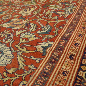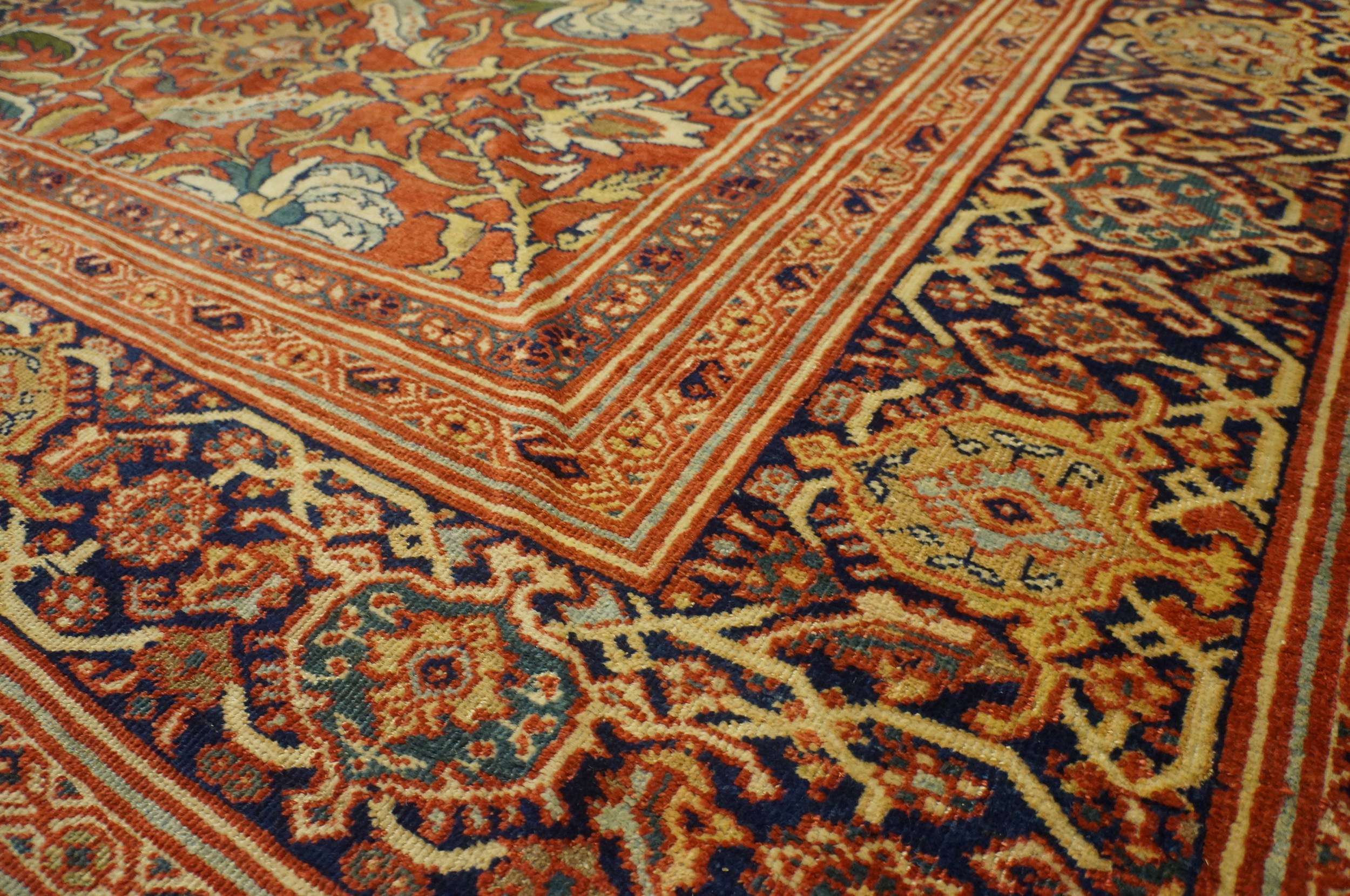A complex border system frames the central field, utilizing deep navy reserves filled with stylized medallions and geometric elements, providing a necessary contrast to the fiery field. The combination of robust structure and refined, classical Persian motifs ensures this rug remains a timeless centerpiece, embodying the enduring elegance of late Qajar-era weaving.