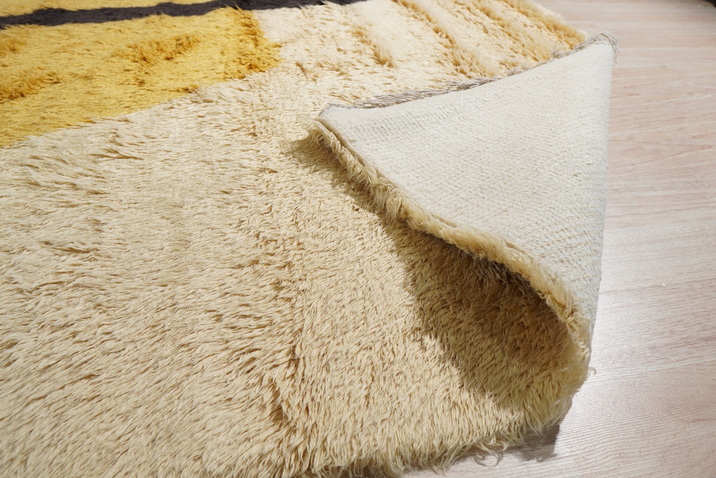 The design features bold, organic shapes set against a plush, cream-toned field. A rich, ochre-gold form dominates the center, beautifully highlighted by a thick, dark charcoal outline. This juxtaposition of soft texture and graphic structure provides sophisticated visual depth, offering a vibrant addition to any collection of yellow color rugs.