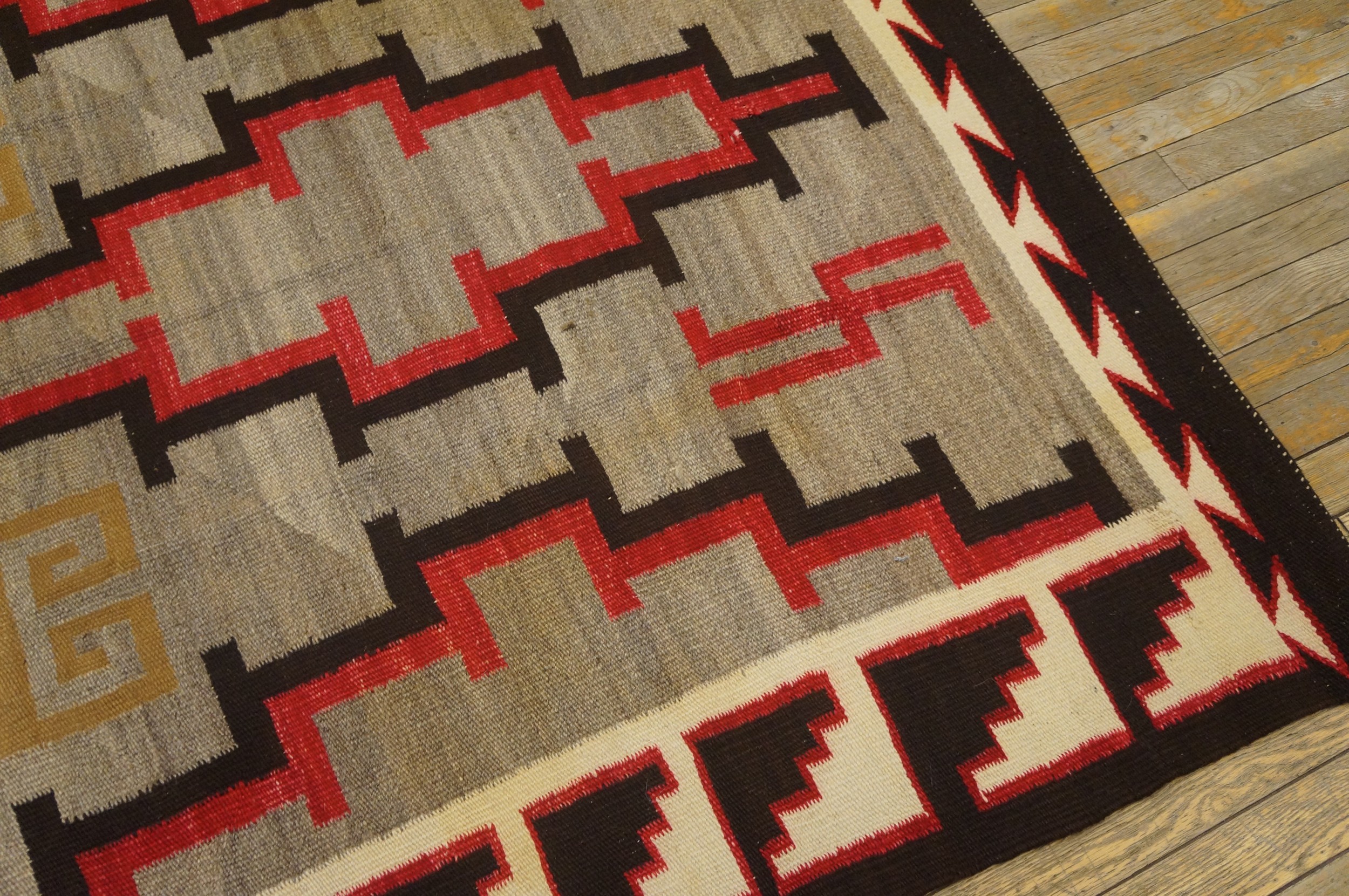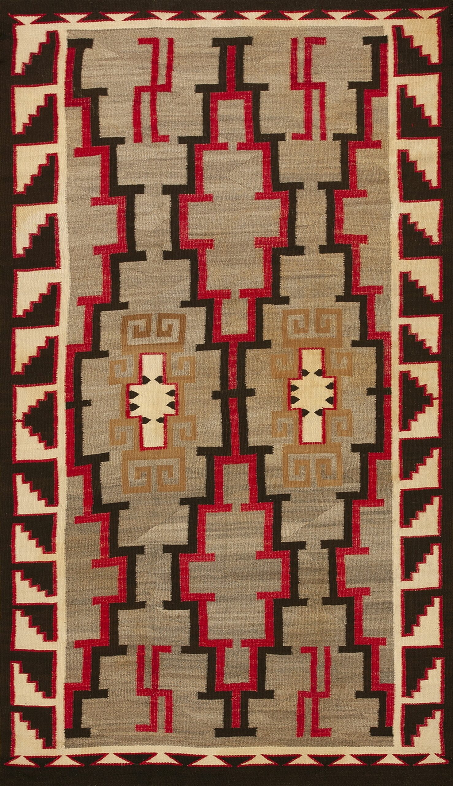 The striking palette utilizes a field of naturally variegated grey, providing a subtle, earthy backdrop for the bold, interlocking stepped motifs rendered in deep black and vibrant cochineal red. This dynamic interplay of color and line creates an impressive allover design that commands attention. The use of natural dyes contributes to the unique depth found within these gray color rugs.