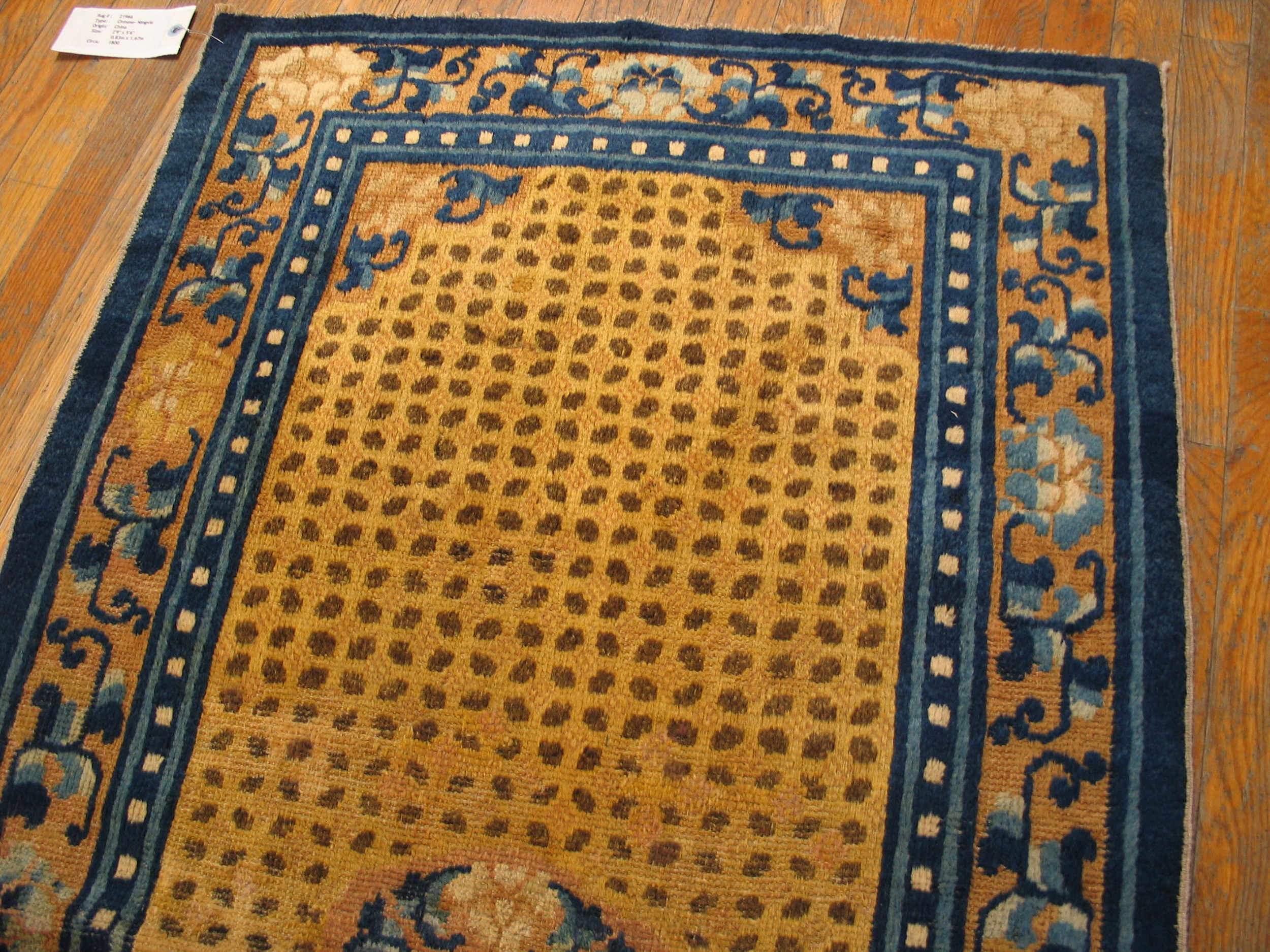 Antique Chinese – Ningxia Chinese Yellow 1800s Rug, Circa Date: 1800s. This exquisite piece represents the finest weaving traditions of the Ningxia region, renowned for its distinctive palette and refined craftsmanship. The saturated yellow field immediately draws the eye, providing a luminous foundation characteristic of desirable gold yellow orange color rugs.