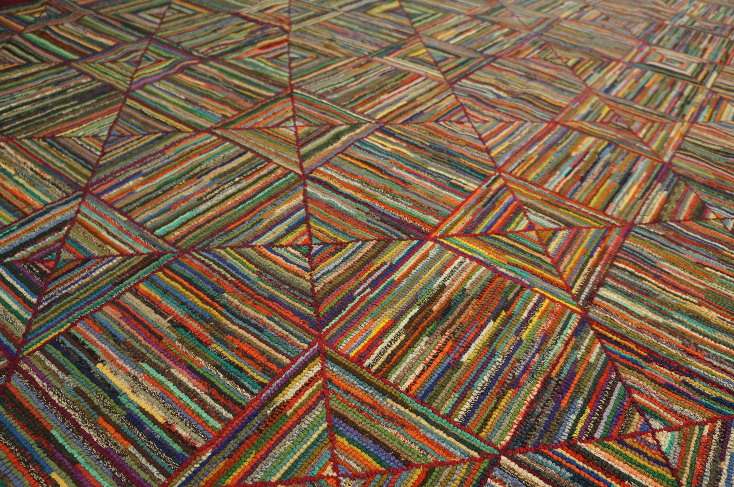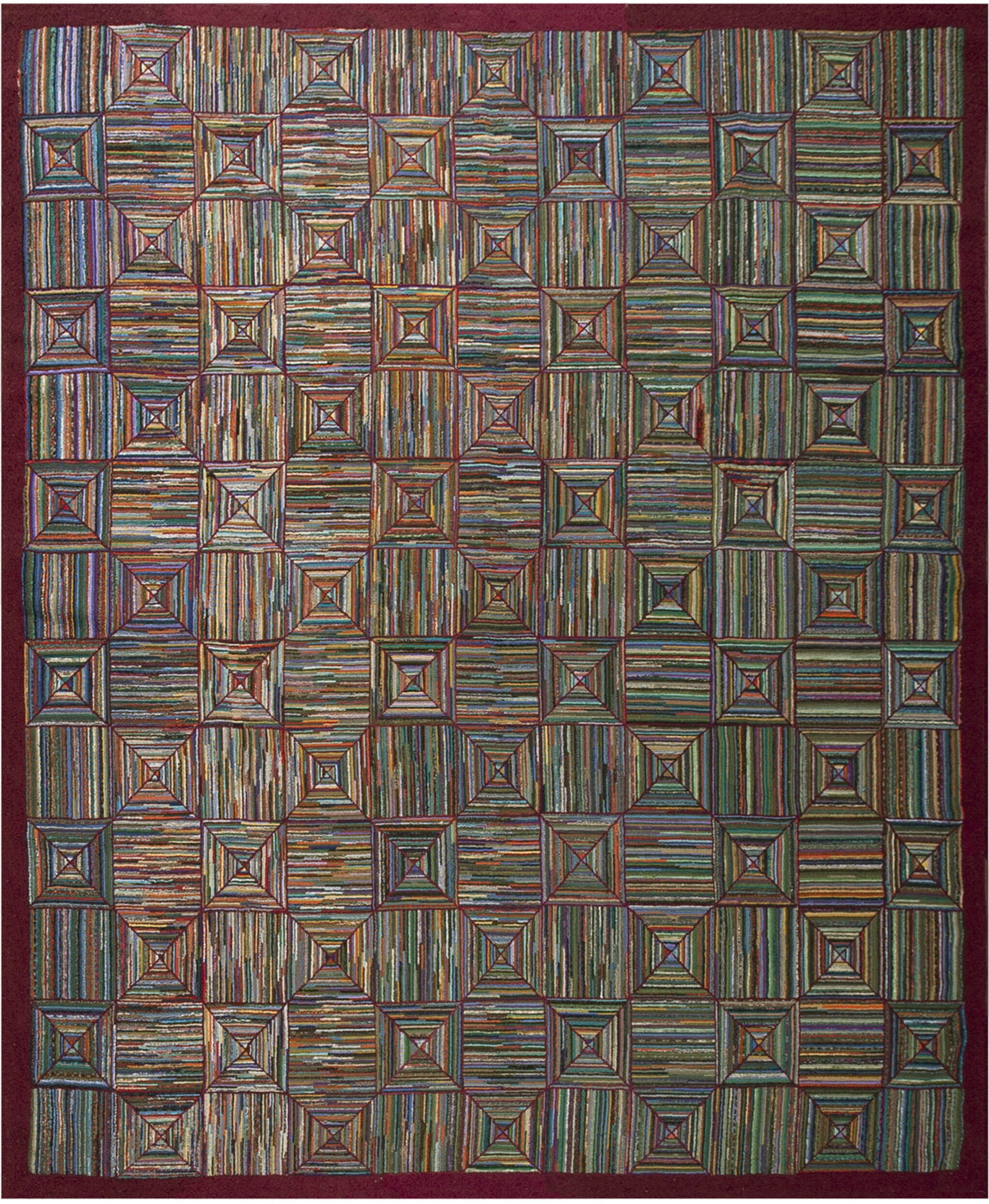 What truly distinguishes this piece is the masterful use of variegated color. Each individual strip of wool or fabric scrap contributes to a dense, shimmering surface, resulting in a complex and rich multicolor jewel tone palette that shifts subtly depending on the light. The deep, solid burgundy border provides a grounding contrast to the energetic field.