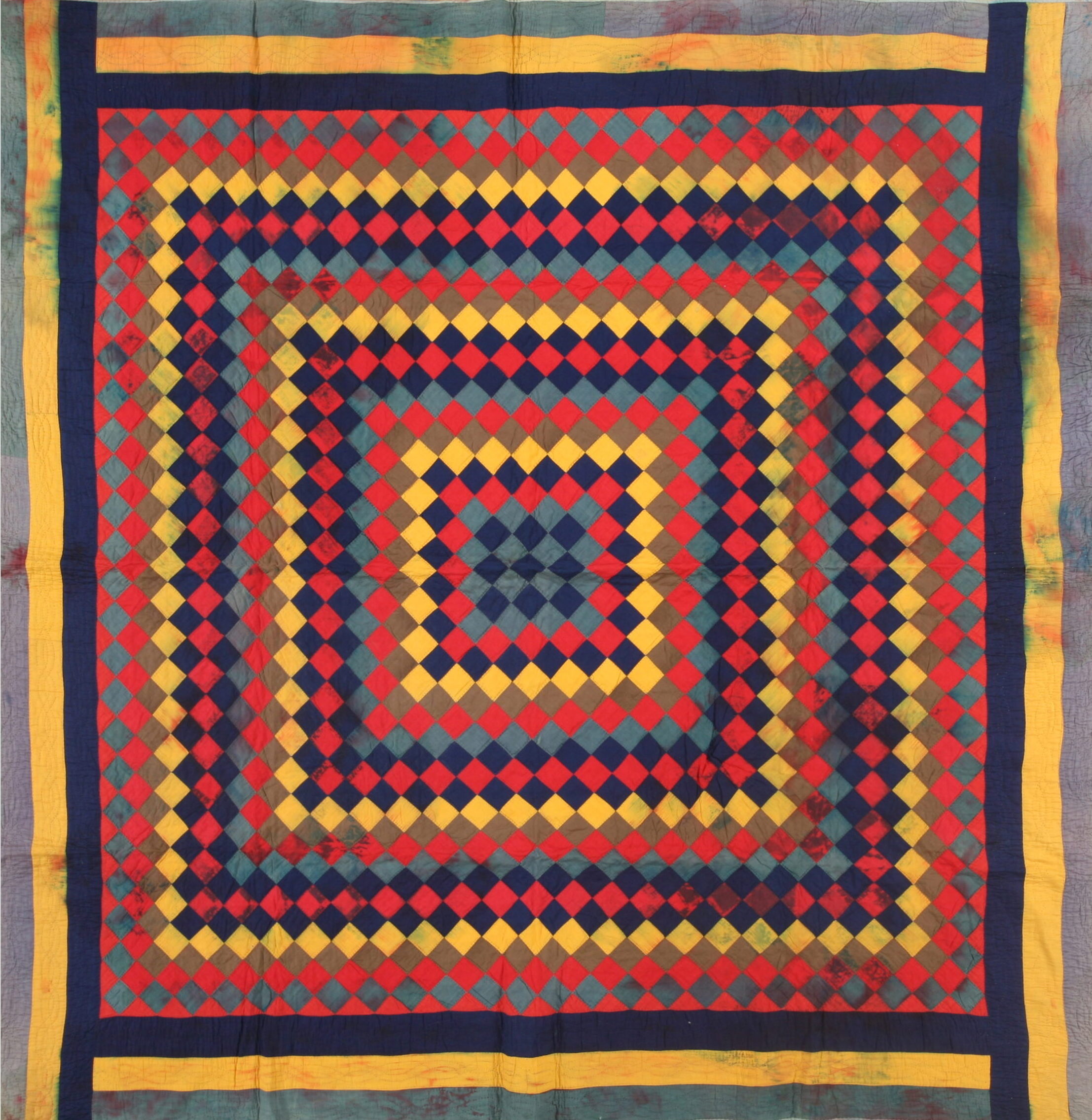The design is a masterful adaptation of the traditional American folk art aesthetic, specifically drawing inspiration from the patchwork technique. This rare quilt style rug features a dynamic, concentric diamond motif that radiates outward from the center. The palette is rich and saturated, utilizing bold primary colors and deep secondary hues, creating a striking composition of multicolor jewel tones.