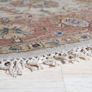 Comfortable Timeless Ivory Hand Knotted Wool Rug. This exquisite roundel presents a luxurious interpretation of classical Oriental motifs, meticulously rendered in soft, durable wool. The central field is dominated by a serene ivory color, providing a neutral yet rich canvas for the intricate botanical elements that define its character.