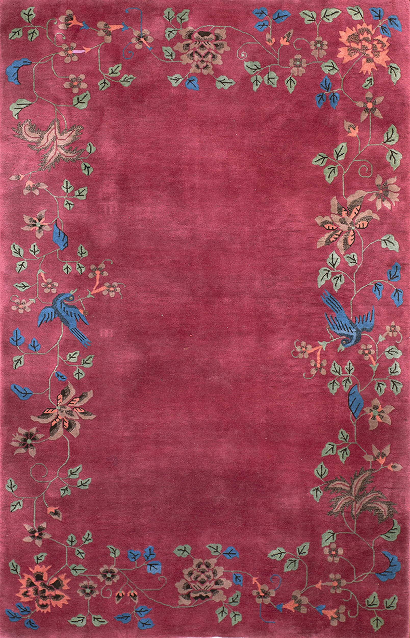 A graceful, asymmetrical border frames the composition, featuring winding vines, stylized blossoms, and charmingly rendered blue birds in flight. This restrained use of naturalistic motifs is typical of the sophisticated Art Deco interpretation of traditional floral rugs patterns, balancing Eastern iconography with Western geometric restraint.