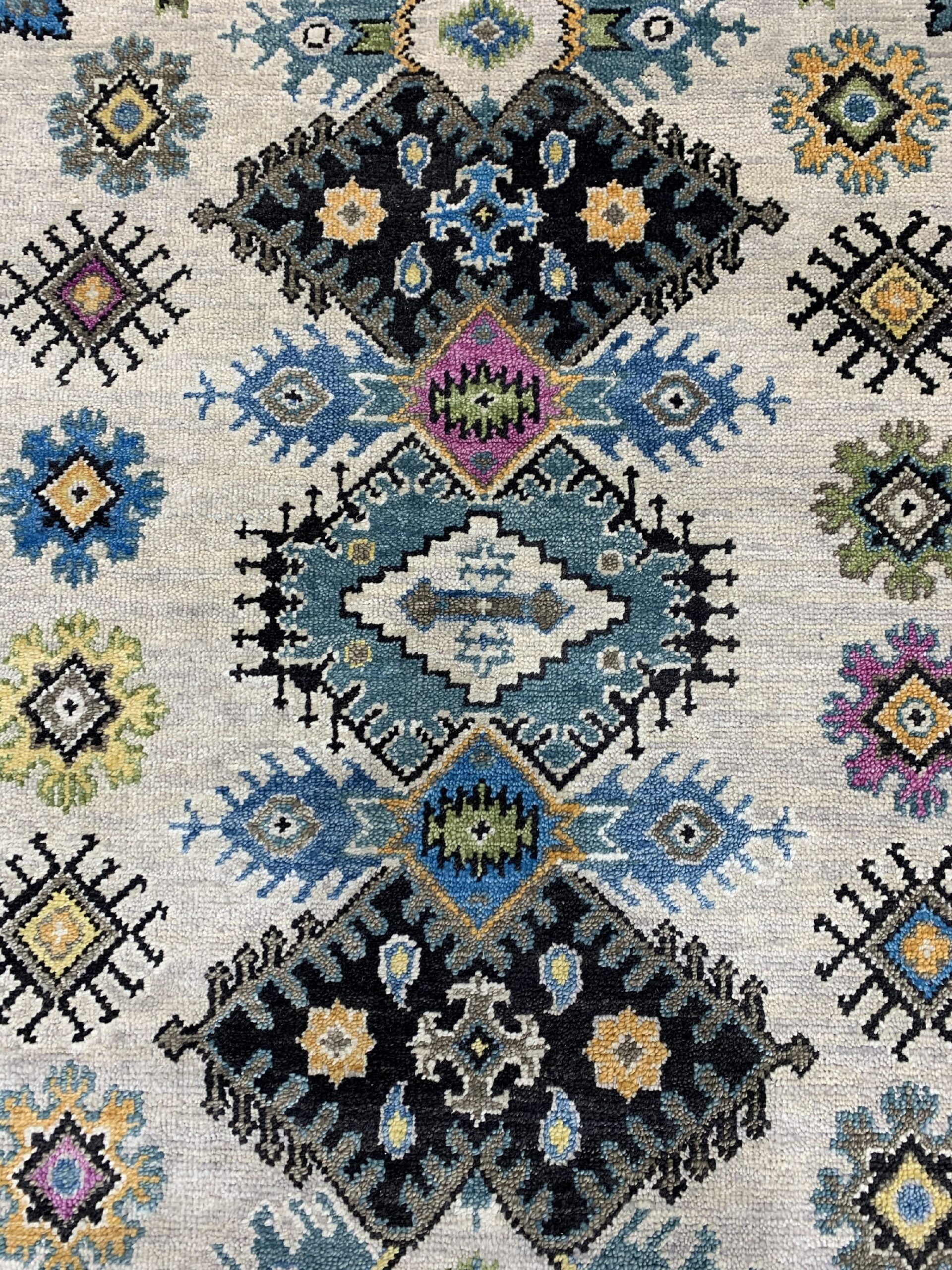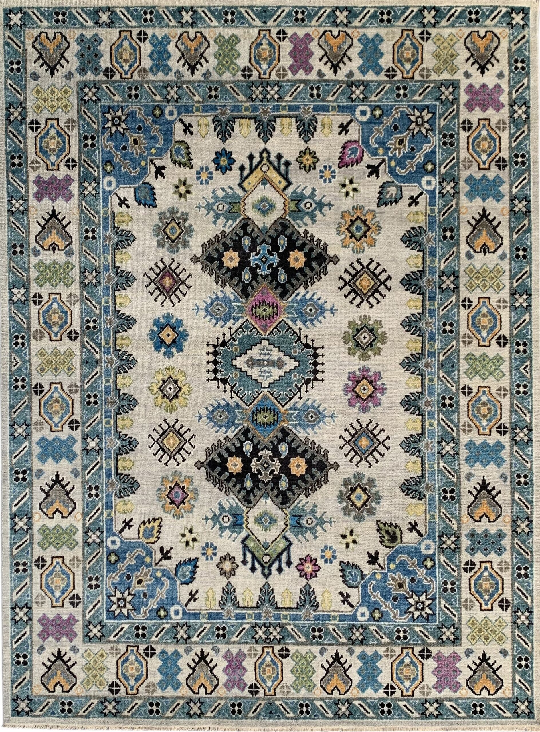 Featuring a dynamic central axis composed of stacked, stylized diamonds, the design balances graphic precision with organic flow. The wide, complex border frames the composition perfectly, ensuring that this piece commands attention, whether utilized as a primary anchor or one of several room size rugs in a grand interior.