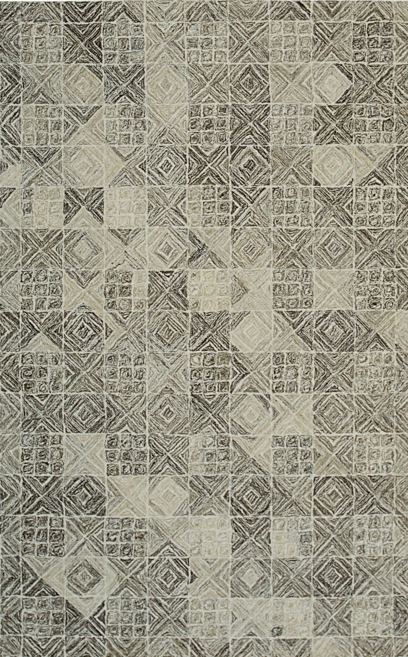 The design employs a sophisticated, monochromatic palette of charcoal, slate, and cream, creating depth through tonal variation rather than saturated hues. This geometric grid pattern, while subdued in color, offers visual complexity. It provides the versatility of a neutral piece while still offering the intricate visual interest often found in multicolor jewel tone palettes.