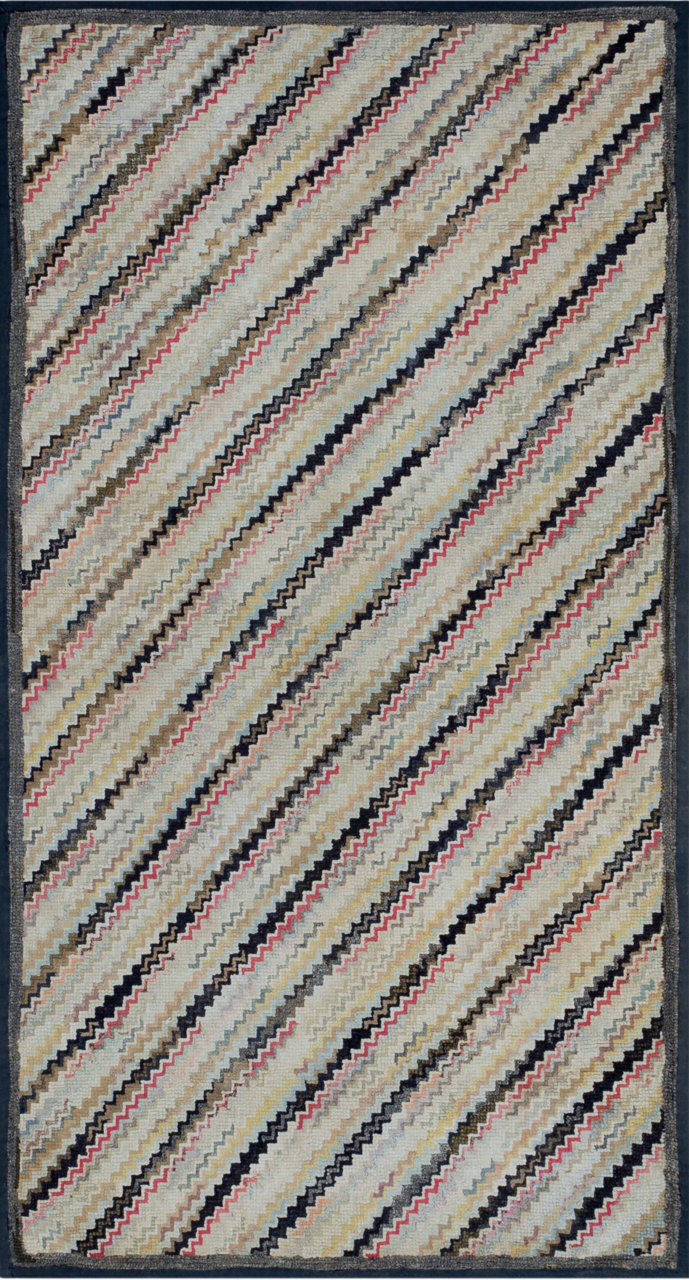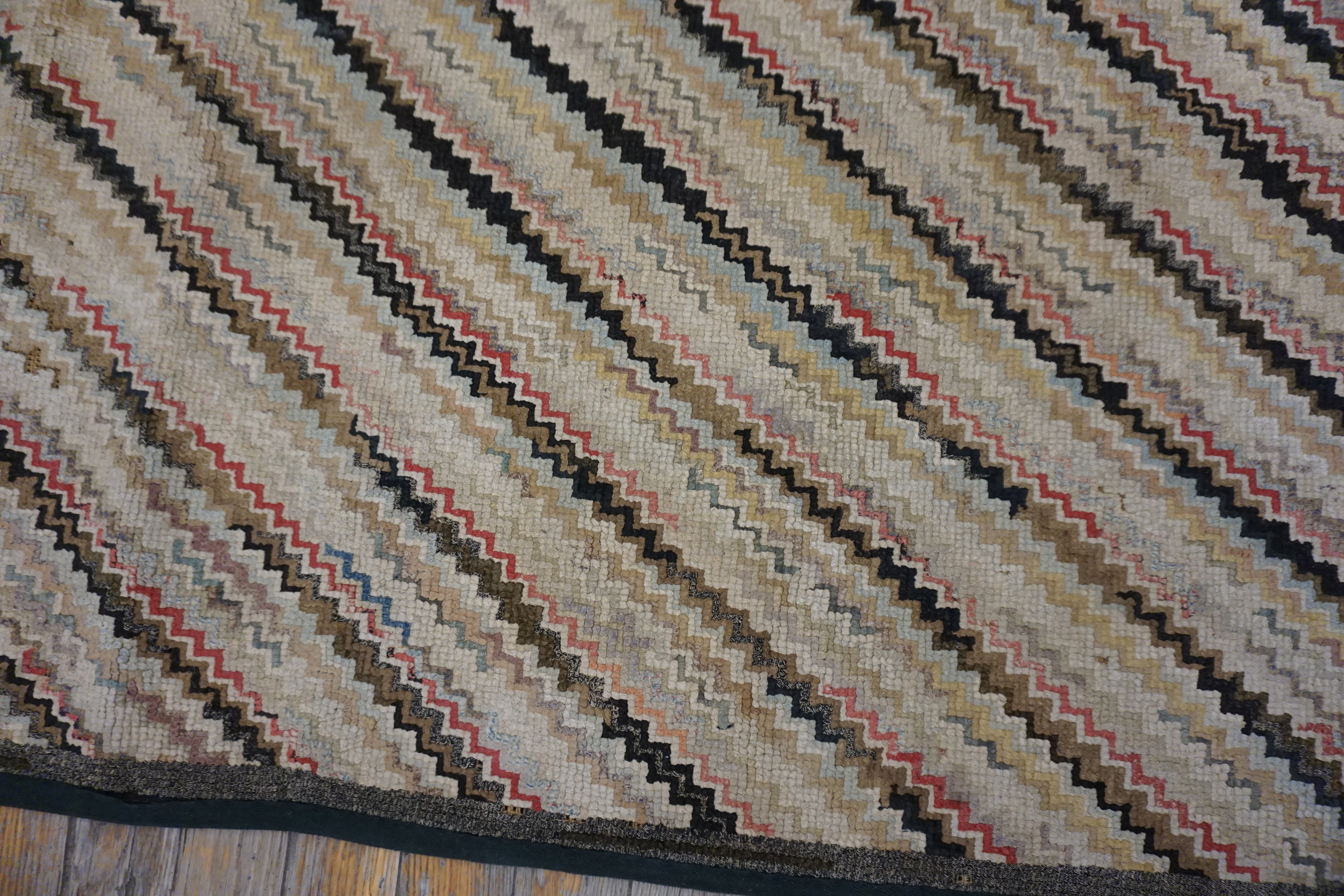 Dating to the 1880s, this rug is a testament to the enduring appeal of American textile craftsmanship. Such early examples are highly sought after by collectors of antique rugs for their unique character and historical significance, offering a sophisticated, yet rustic, counterpoint to modern interiors.