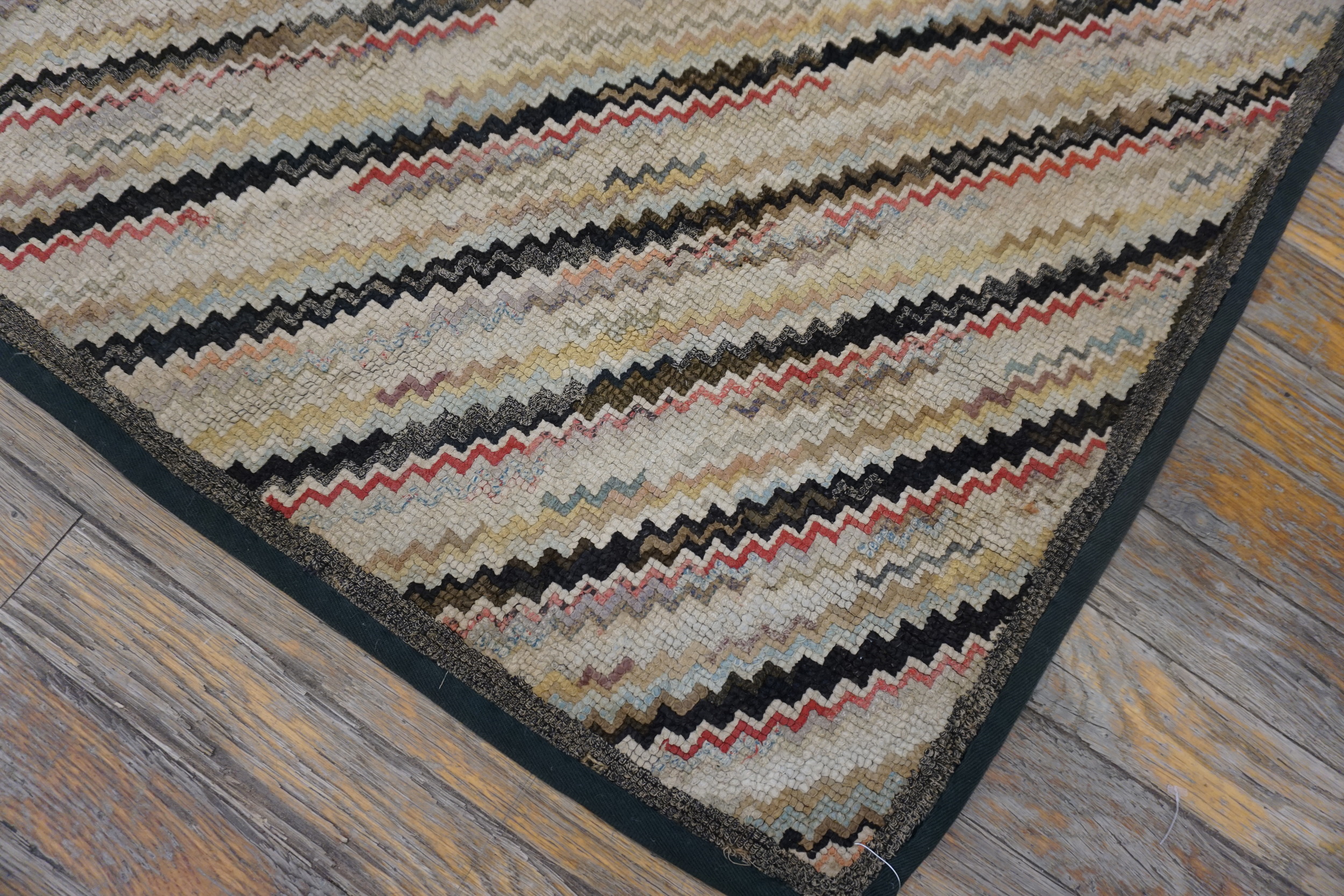 Hand-hooked wool construction gives the surface a dense, nubby texture, characteristic of utilitarian pieces made for daily use in early American homes. Its dimensions classify it as a small scatter size rug, perfectly suited for placement in a hallway, in front of a hearth, or as an accent piece to define a small space.