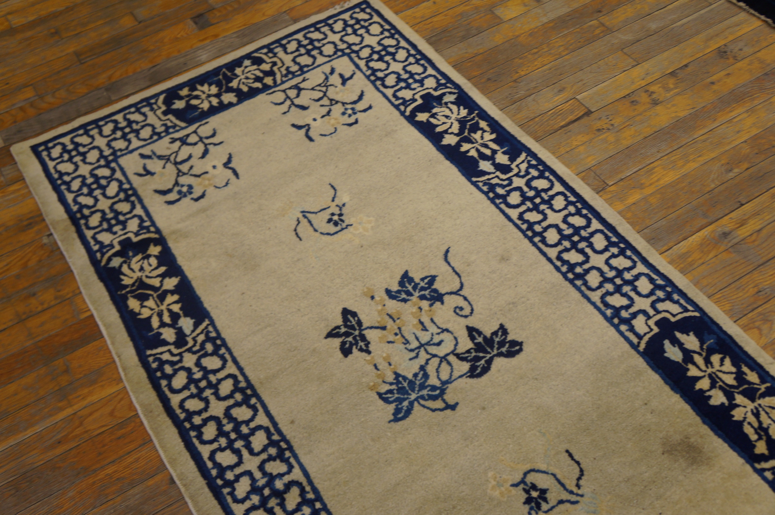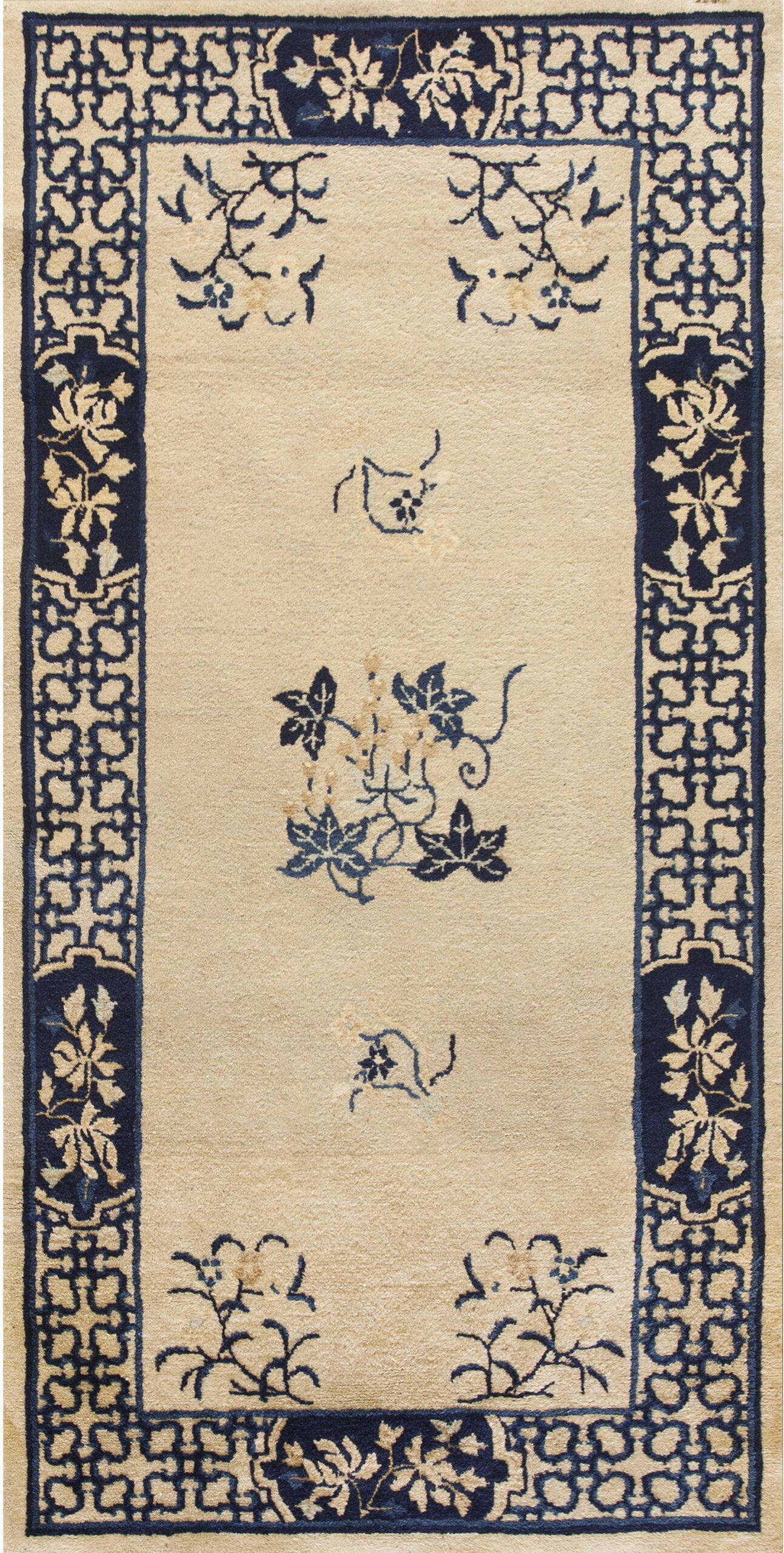 Antique Peking Chinese Floral Wool Hand Knotted Pile 1900s Rug, Country of Origin: China, Circa Date: 1900s. This exquisite example of early 20th-century weaving presents the refined aesthetic typical of peking rugs. Characterized by a sparse, elegant design philosophy, this piece showcases the masterful use of negative space that defined the best of the era.