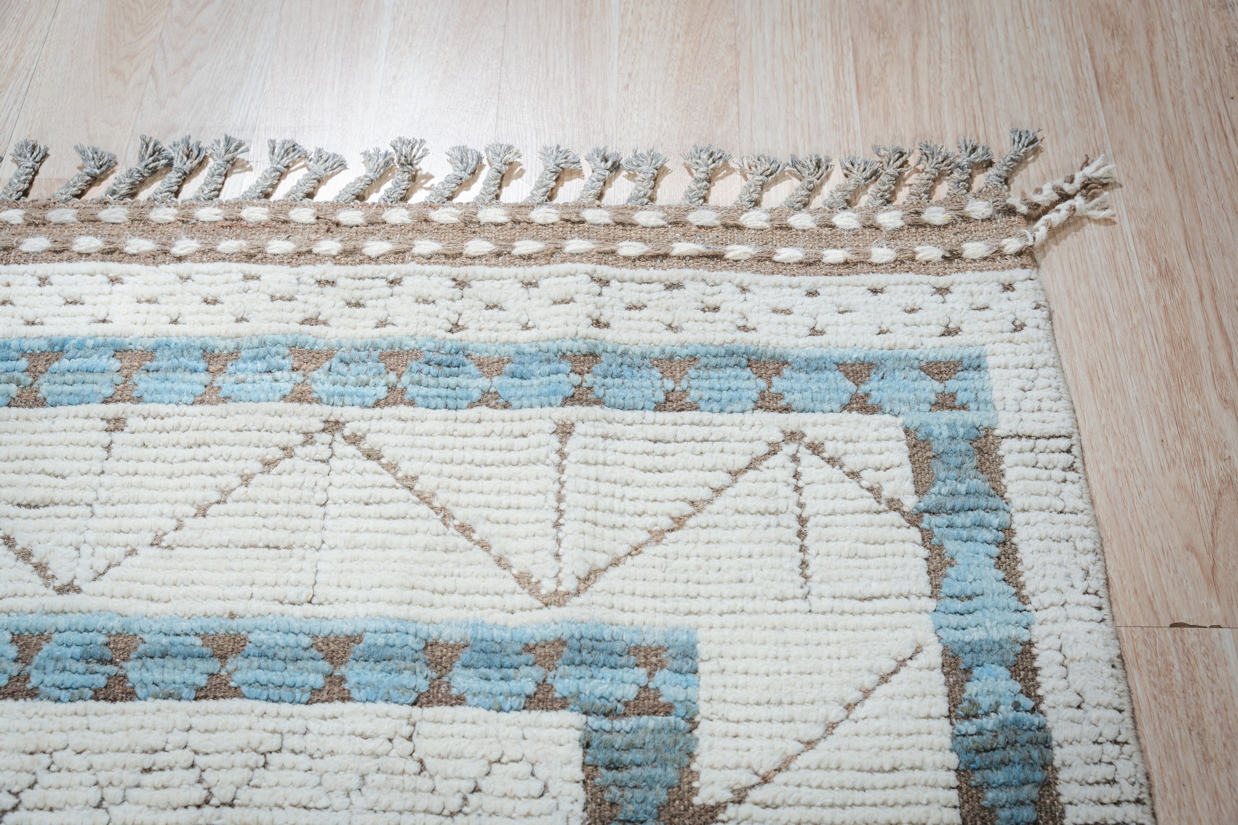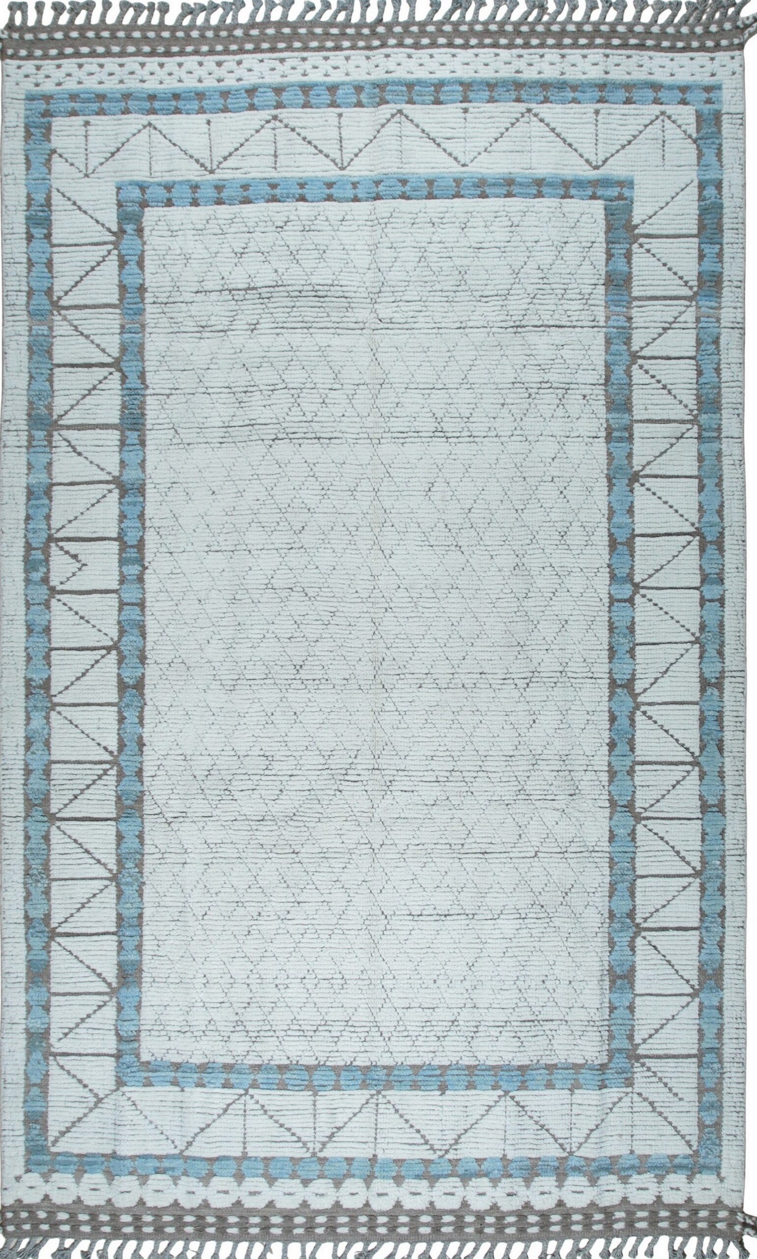 A striking contrast is introduced through the structured border, utilizing bands of soft sky blue and muted taupe grey. This graphic delineation provides visual weight and structure, elevating the piece beyond simple texture. As a testament to evolving interior design, this rug represents the finest examples of new area rugs crafted today.