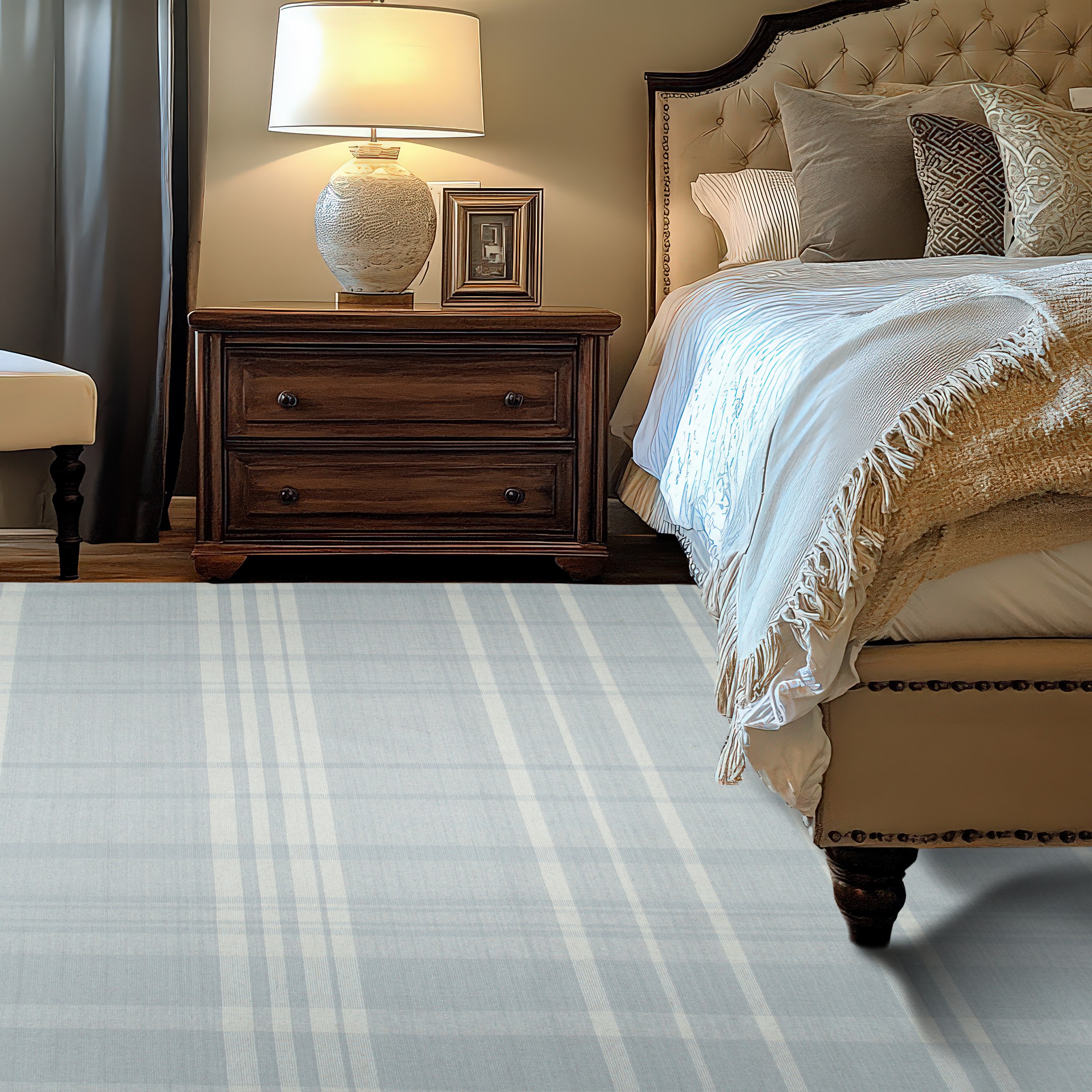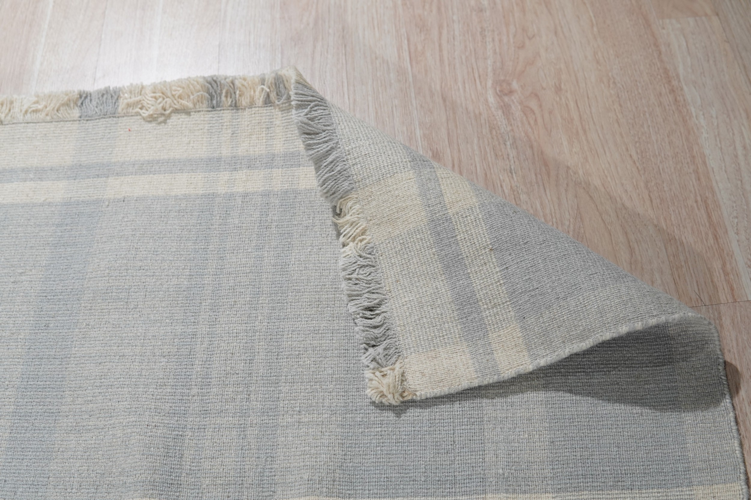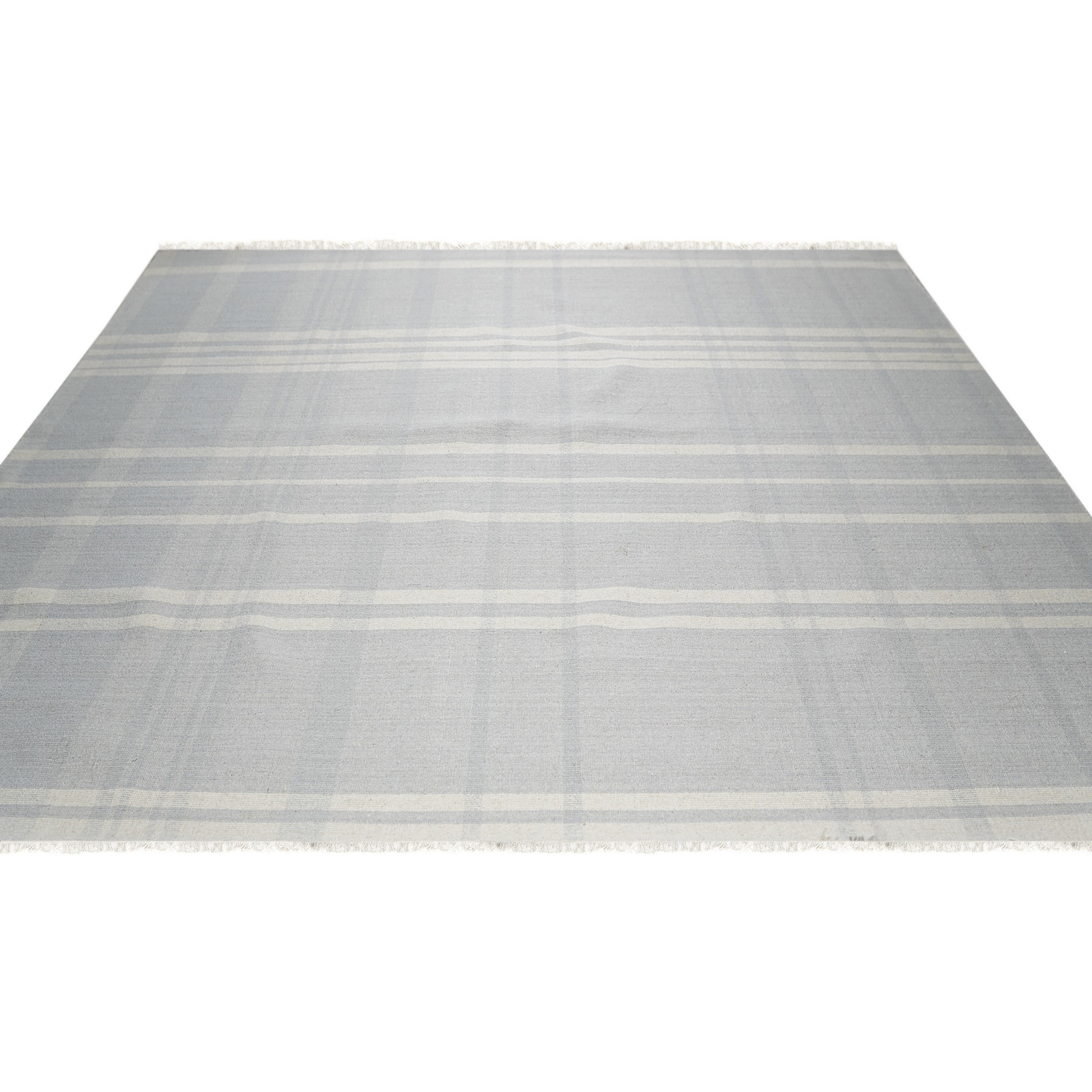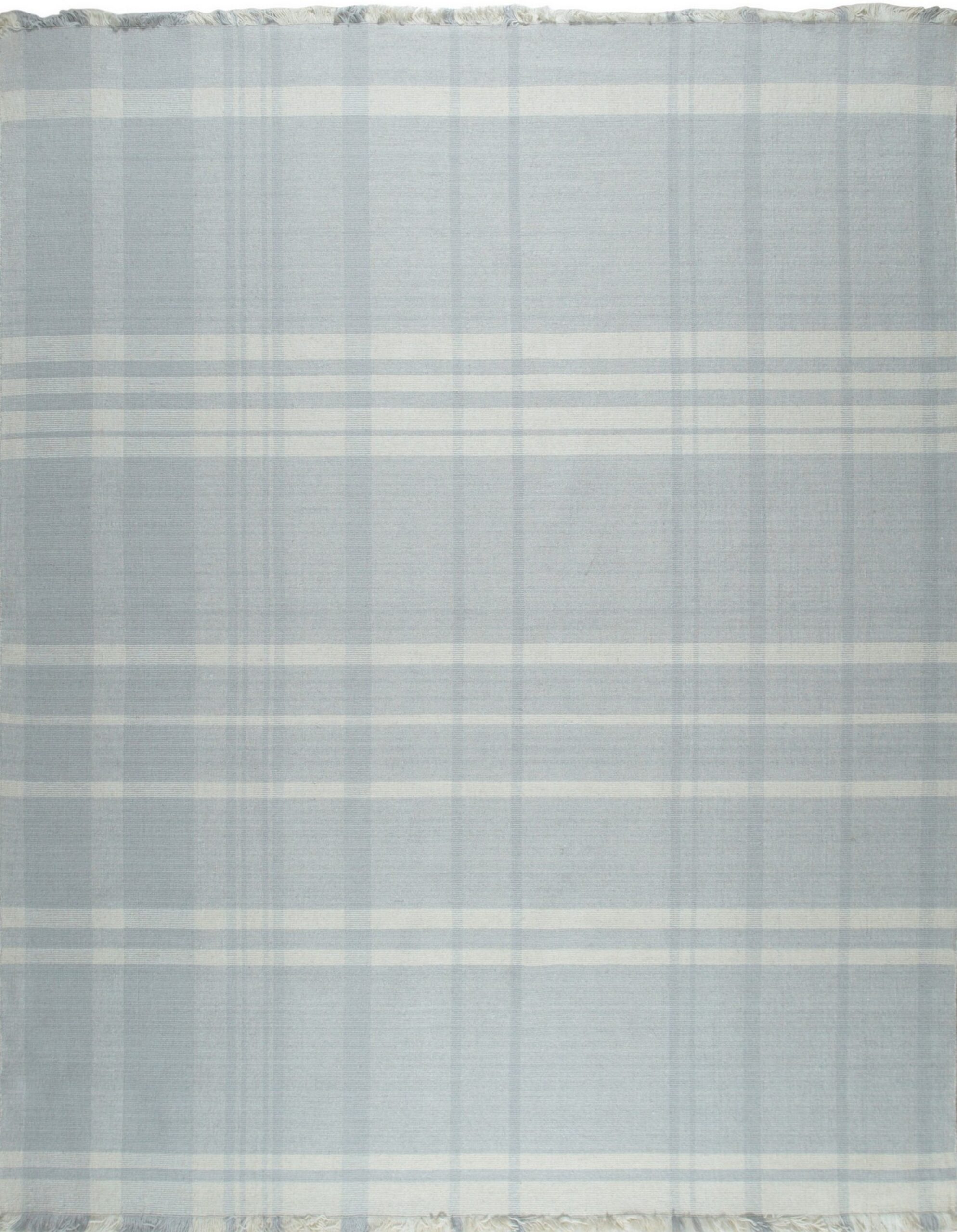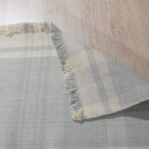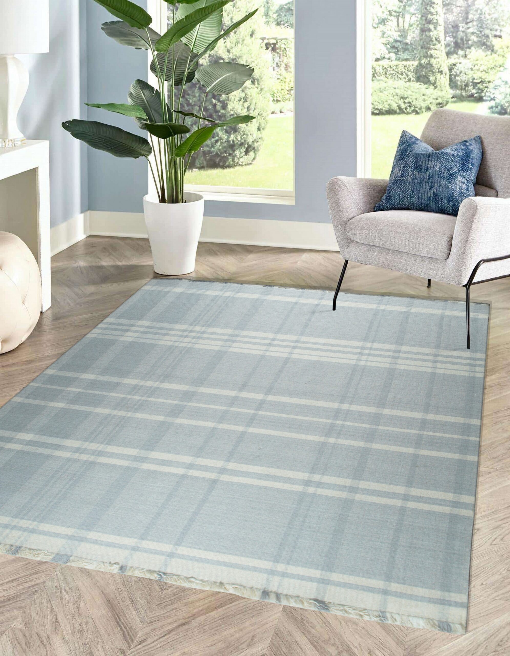 The Fiona rug features a striking, oversized plaid motif rendered in a tranquil palette of soft blue-grey and luminous white. This controlled use of color ensures the rug remains versatile while providing a subtle graphic anchor to the room. The clean, bright aesthetic aligns perfectly with our curated selection of white color rugs designed to enhance natural light.