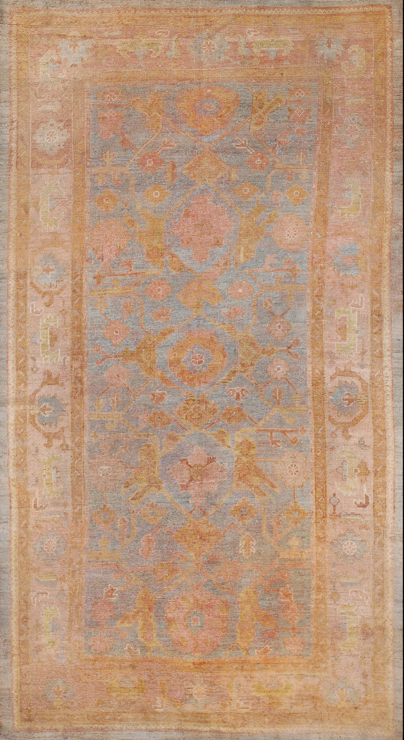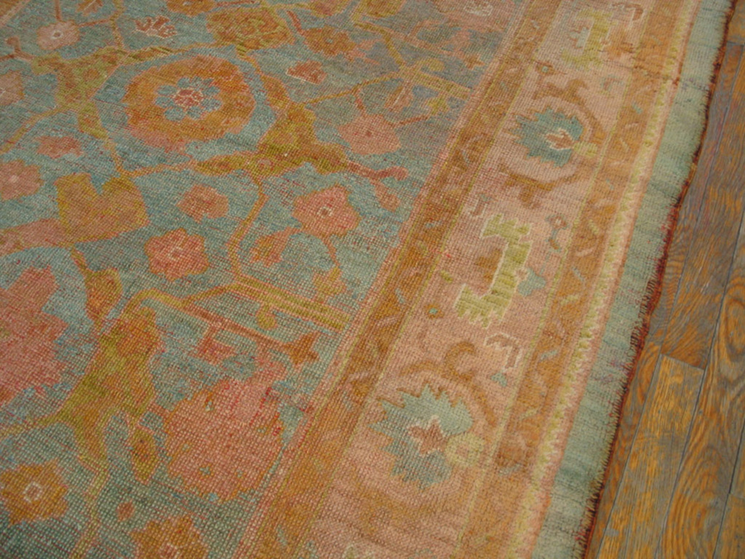 The design features large, stylized floral medallions set against a field that has softened over time to a pale, ethereal grey-blue. This particular coloration, while featuring a blue color rugs foundation, is balanced by the use of faded salmon, coral, and ochre tones in the primary motifs. The classic, open composition is characteristic of Oushak rugs, known for their decorative appeal and adaptability to Western interiors.
