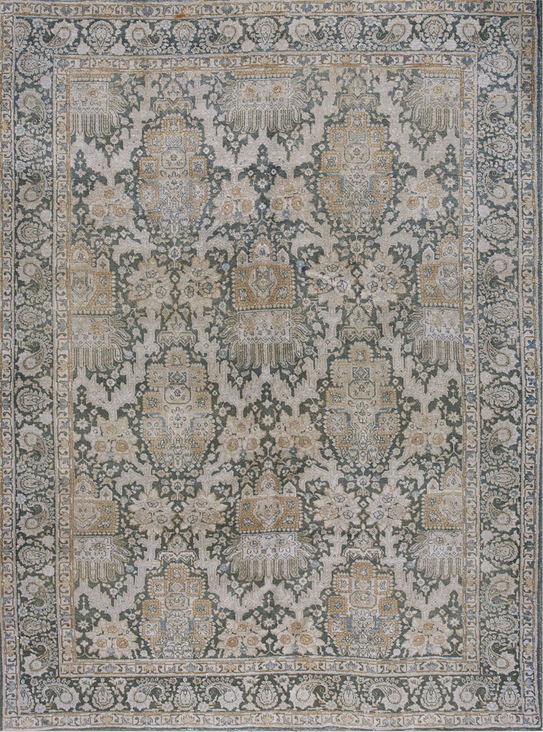 The palette is notably sophisticated, moving away from traditional saturated reds and blues toward a refined, monochromatic scheme. The field utilizes a soft, pale beige that allows the deep sage and muted gold motifs to emerge subtly. This piece is an excellent study in the use of gray color rugs to achieve an atmosphere of quiet luxury and historical depth.