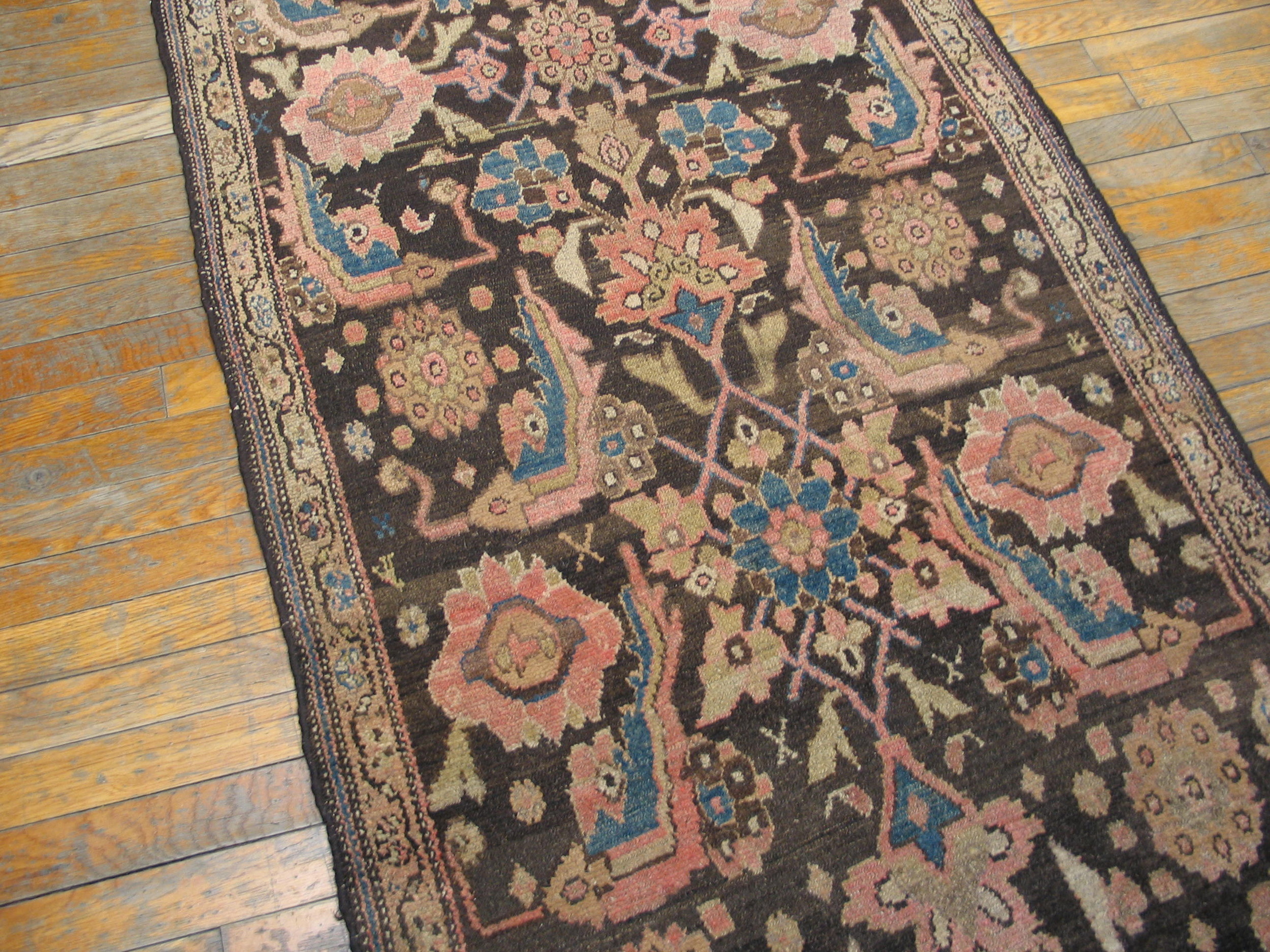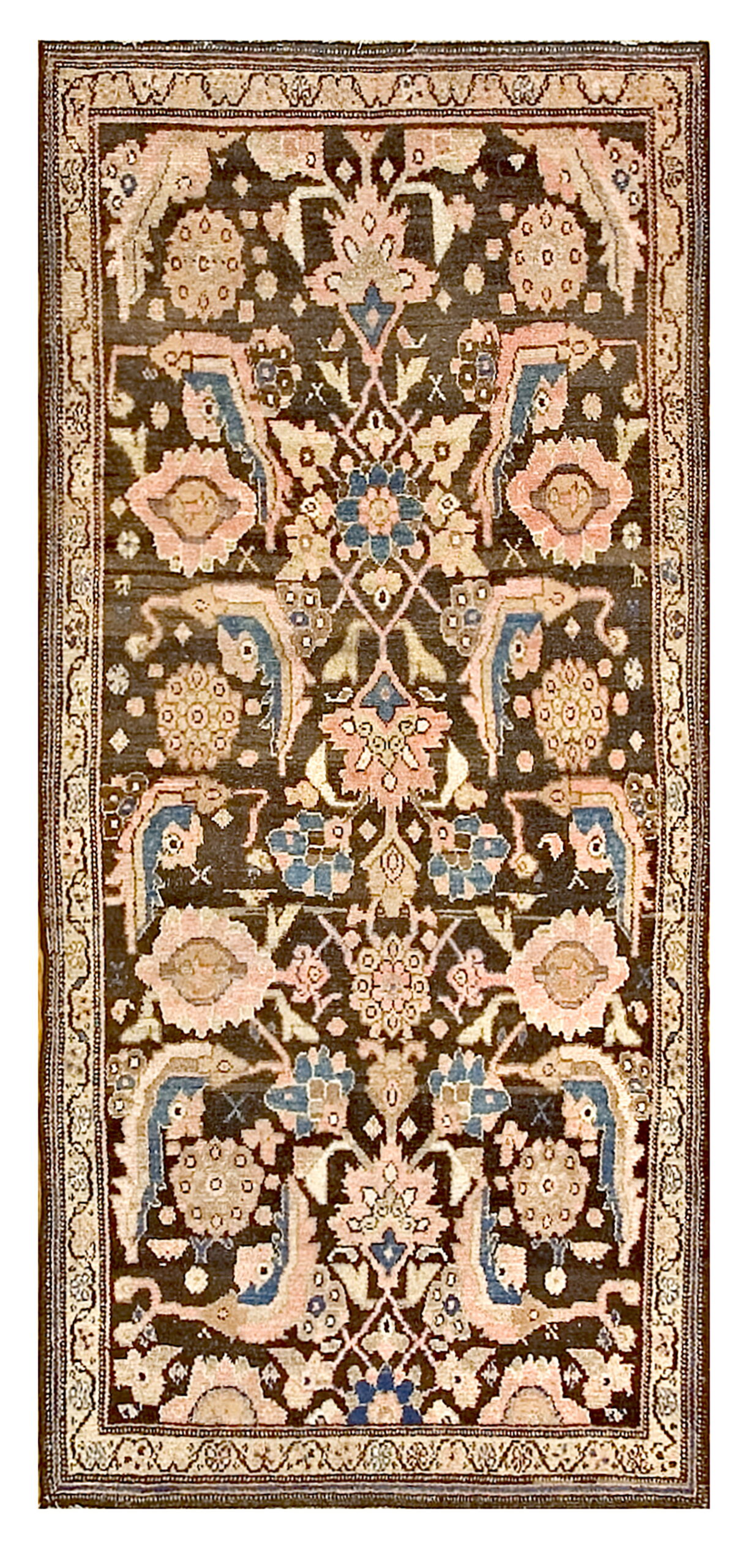 The palette is defined by a rare, rich chocolate brown field—a highly desirable color that provides a dramatic backdrop for the intricate design. The dense, repeating structure utilizes an allover pattern of stylized palmettes and blossoming vines, rendered in soft rose, cream, and subtle indigo accents.