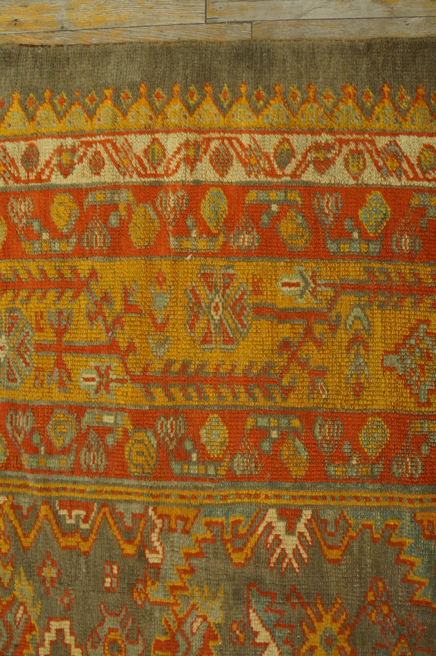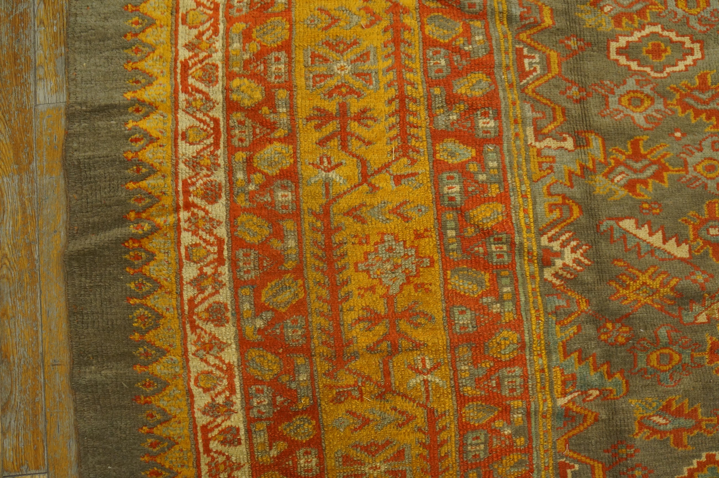 Framed by a striking, multi-layered border system dominated by brilliant mustard yellow and rust red, the rug offers a powerful visual contrast to the muted field. Its substantial dimensions classify it as a true room size piece, perfectly suited to anchor a formal living space or dining room with historical gravitas.