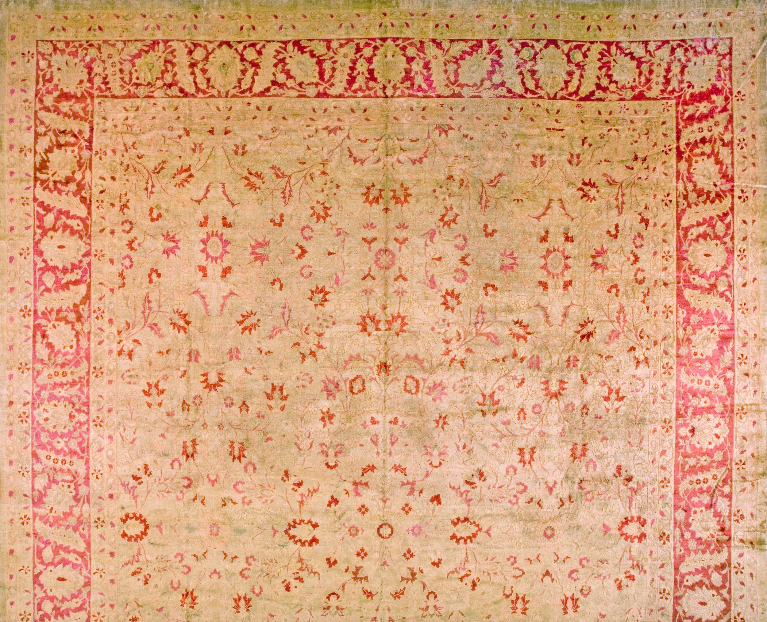 The design employs a graceful, large-scale floral and vine composition, executed in an allover pattern that repeats seamlessly across the entire surface. This continuous flow prevents the eye from resting on a central medallion, offering instead a dynamic yet balanced visual texture. Such expertly woven antique rugs are highly sought after for their enduring quality and classic aesthetic.