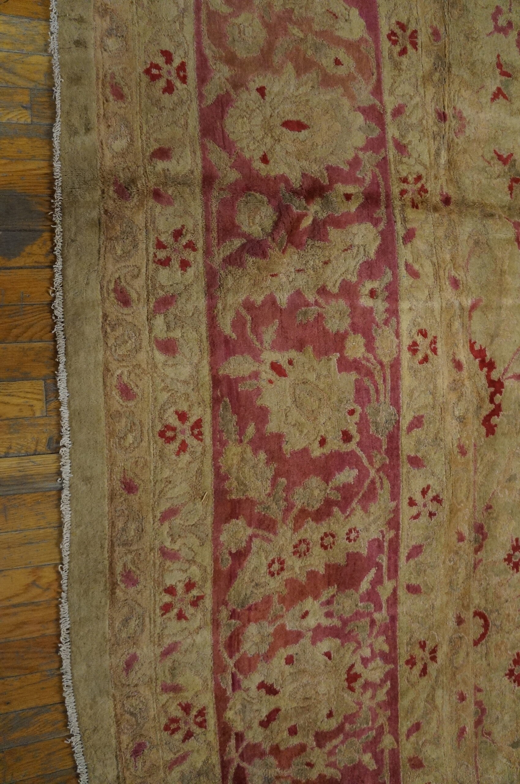 The field is defined by a luminous, warm ivory color, which has mellowed beautifully over time to acquire a subtle golden patina. This neutral ground provides a perfect counterpoint to the rich, earthy terracotta and rust tones used in the primary design elements, creating depth without sacrificing restraint.