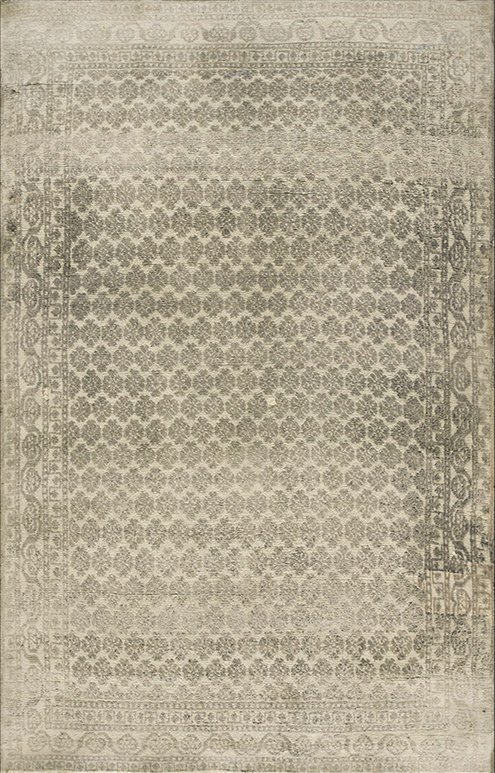 The tonal variation is perhaps the rug’s most compelling feature, utilizing shades of soft taupe and slate grey against a pale, almost ivory ground. This deliberate minimization of color ensures that the focus remains entirely on the texture and the complexity of the knotting, a hallmark of highly desirable antique rugs from this era.