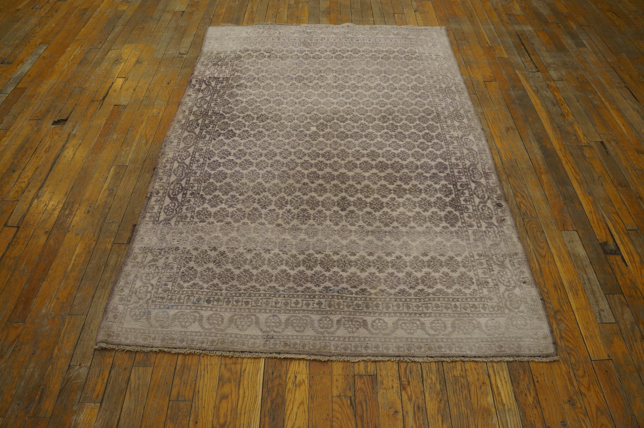 The composition employs a dense, repeating pattern across the entire field, classifying it as an allover rug design. This intricate arrangement of stylized floral elements is characteristic of the refined weaving traditions of Indian rugs, which often blend classical Persian motifs with a distinctively subtle, almost architectural structure.