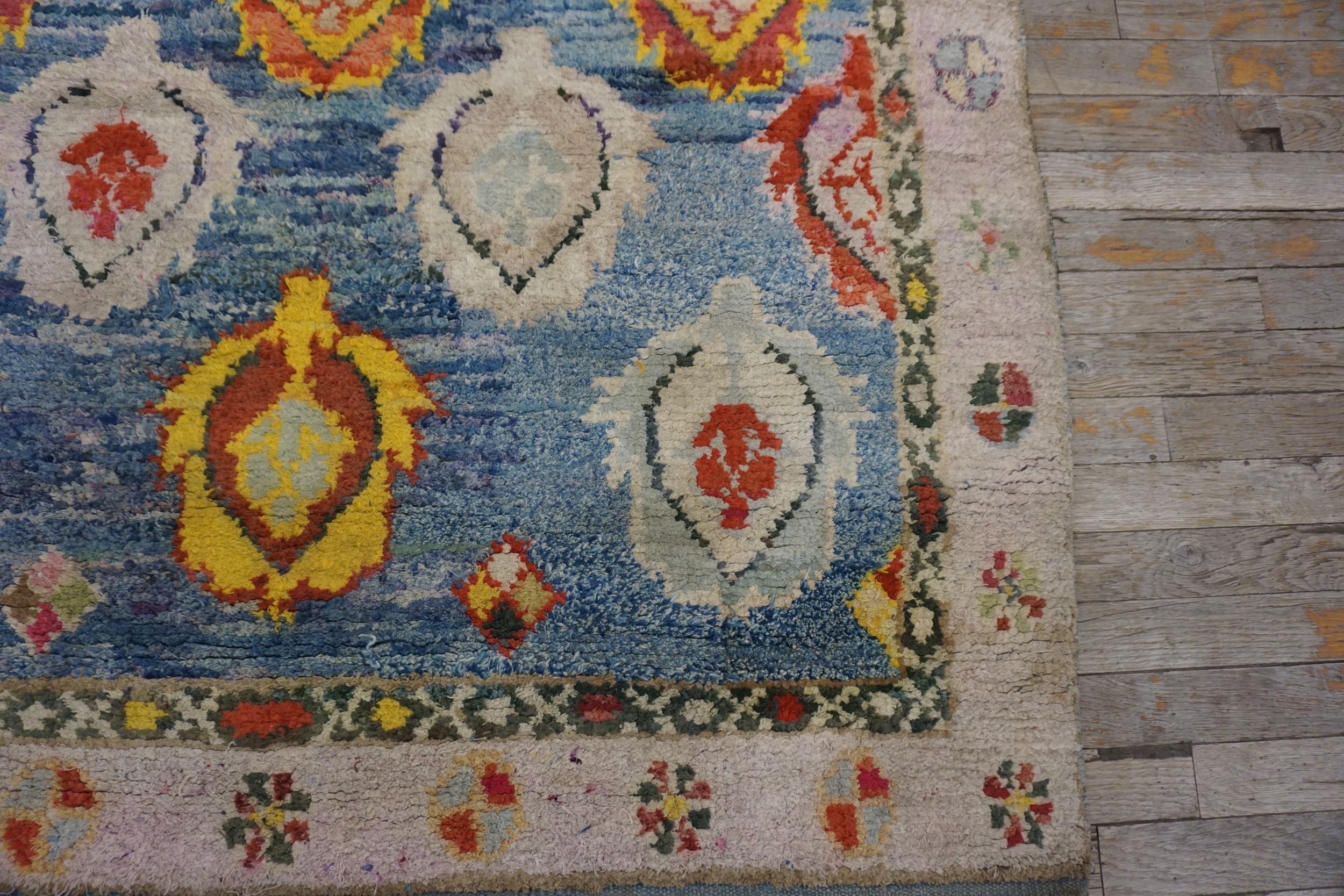 The field is dominated by a brilliant, almost cerulean hue, providing a dynamic backdrop for the repeating motifs. This saturated use of color makes it a compelling example within our collection of blue color rugs, offering a refreshing departure from the deeper indigo tones often associated with traditional Agra production.