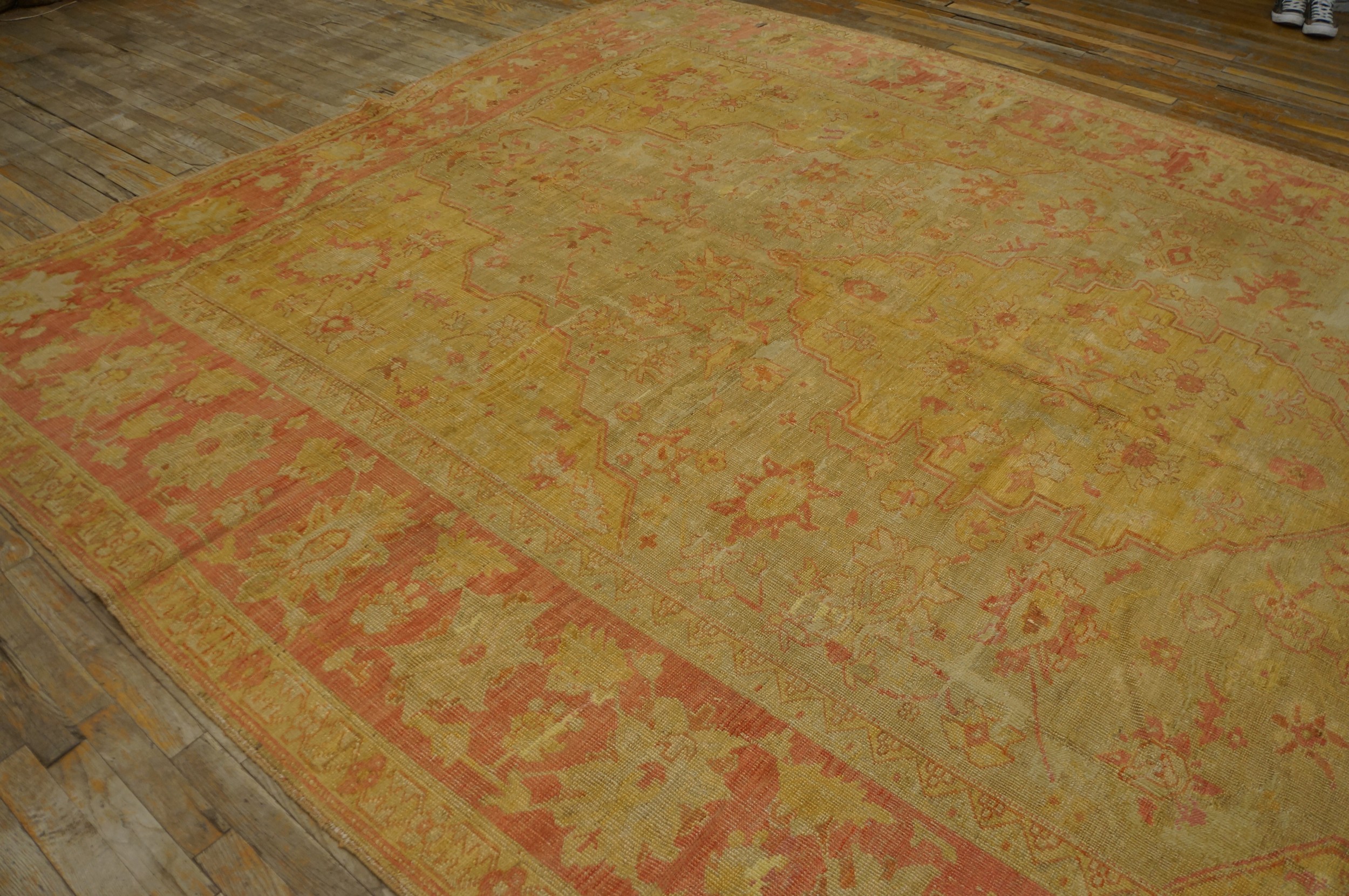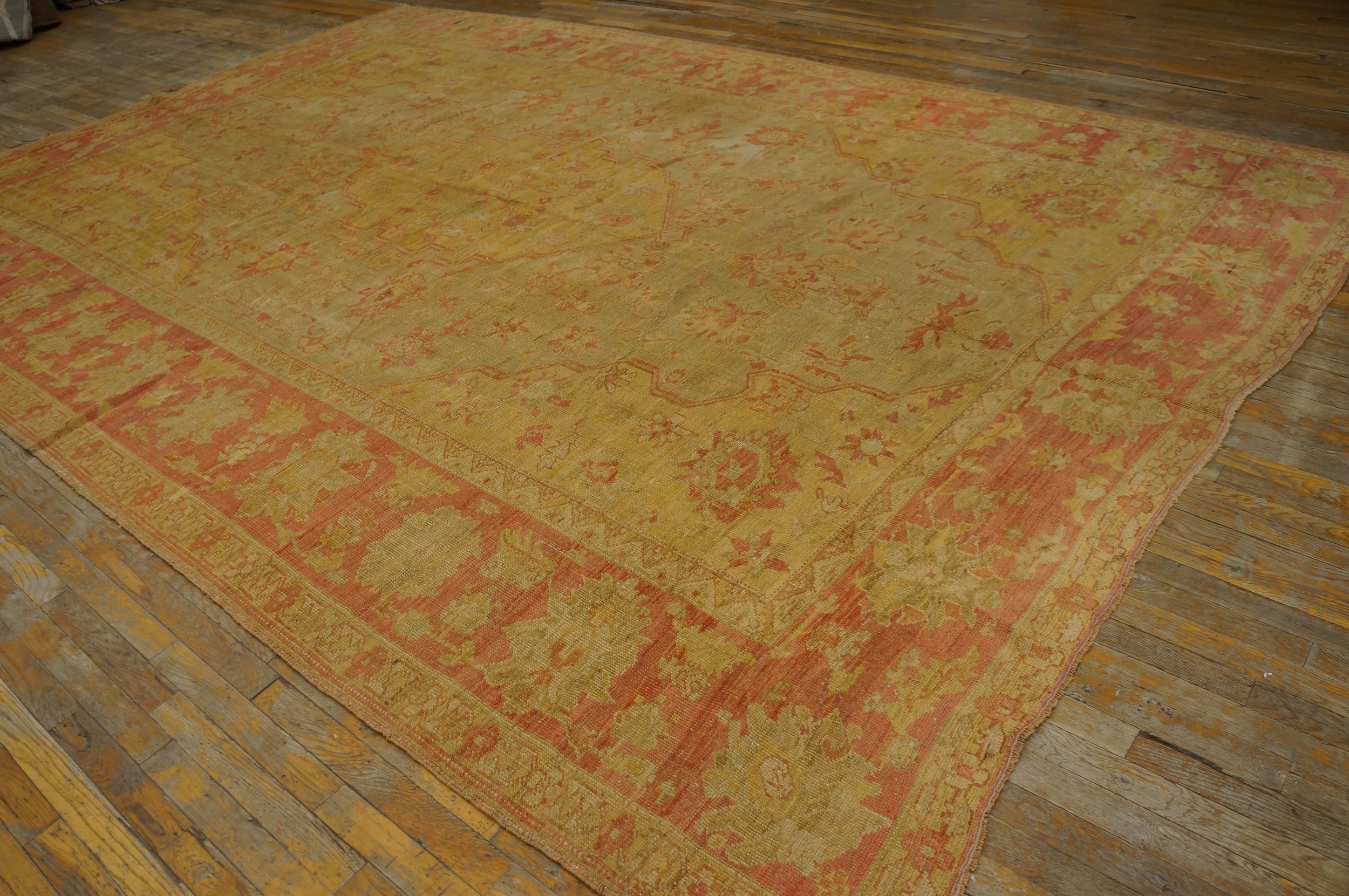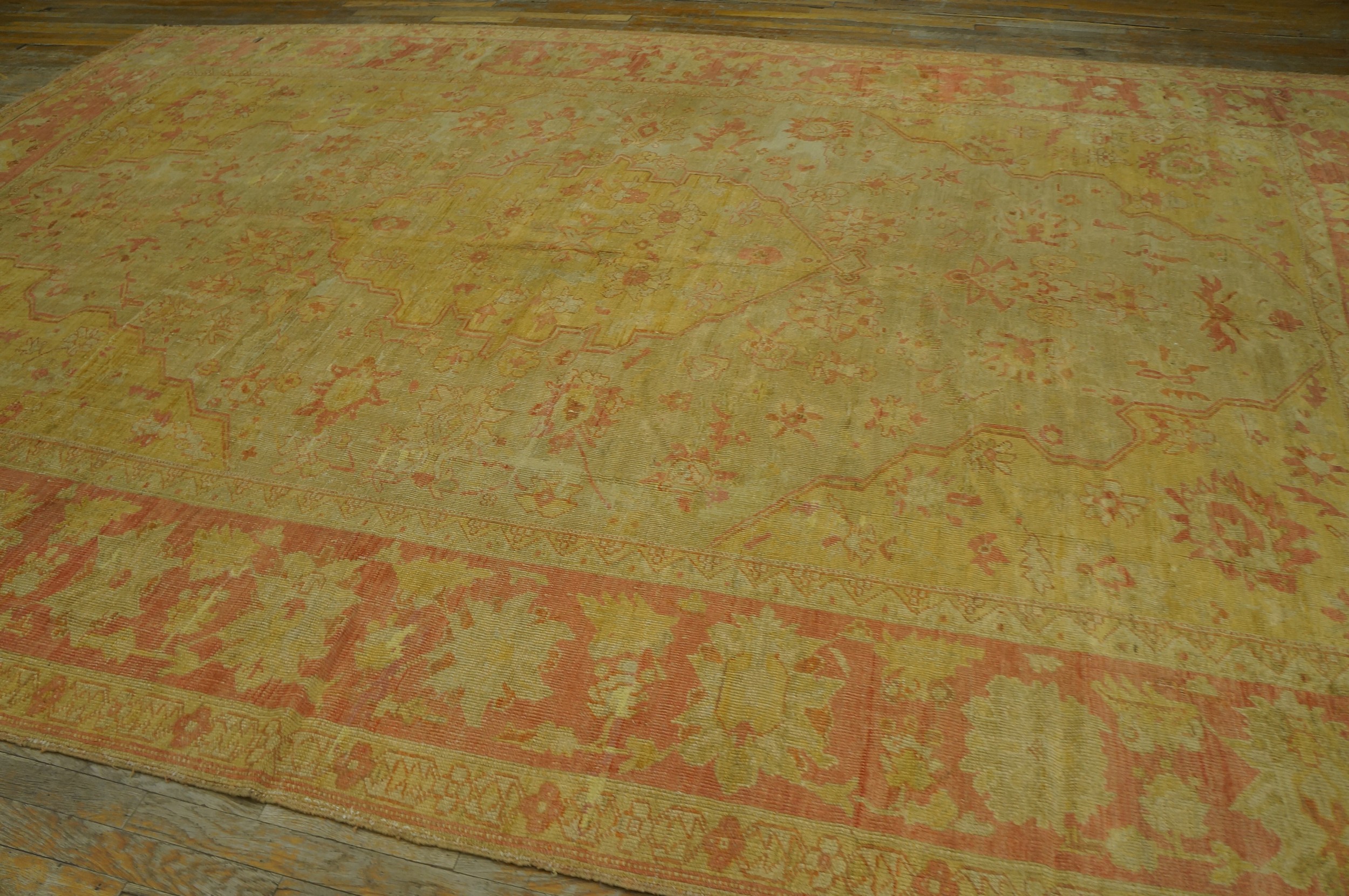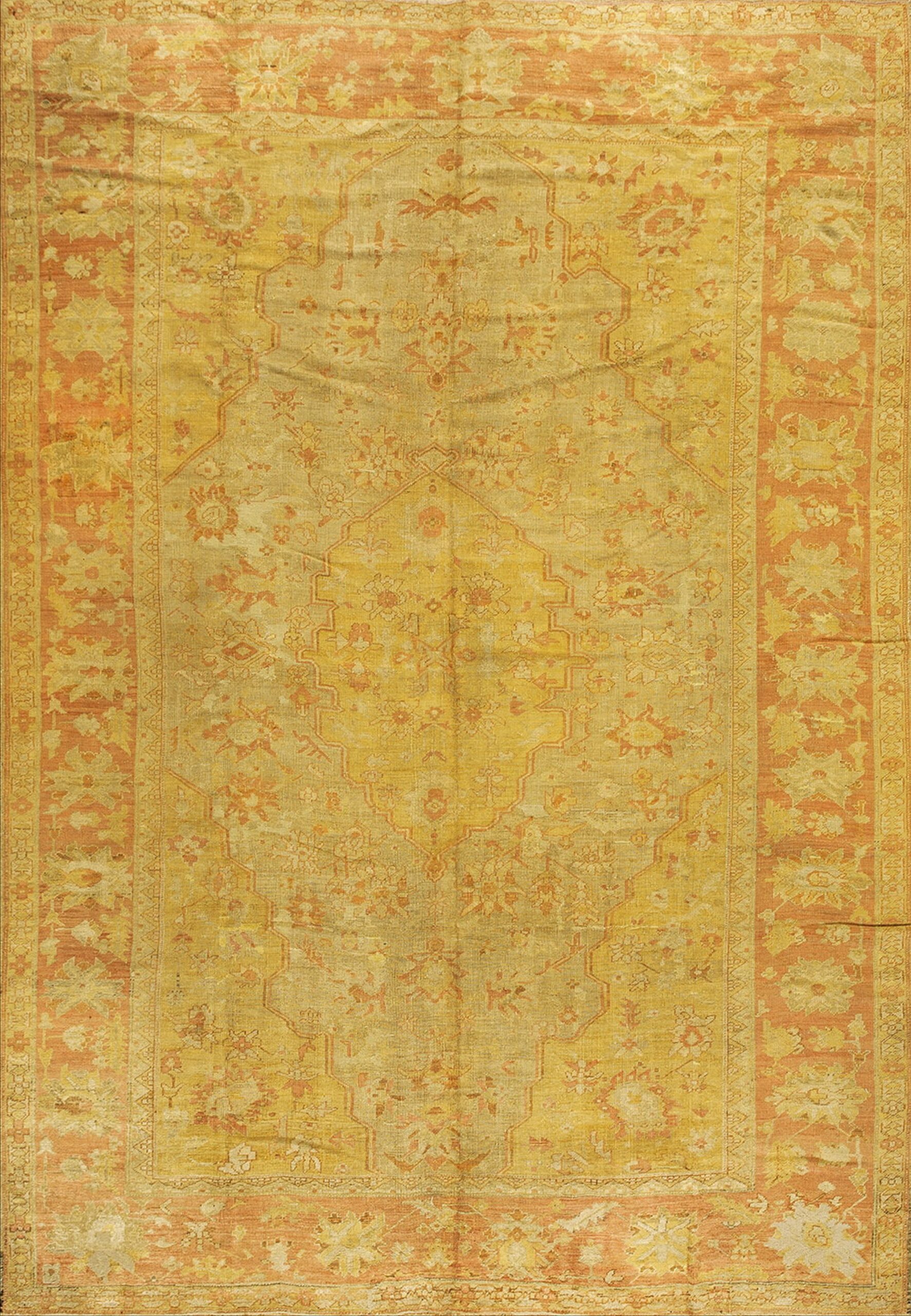 Antique Oushak Room Size Wool Ivory Rug, Circa Date: 1890s. This magnificent example of late 19th-century Anatolian weaving features the characteristic grand scale and open field design for which Oushak production is renowned. Its soft, sun-mellowed palette makes it a superb addition to any collection of antique rugs.