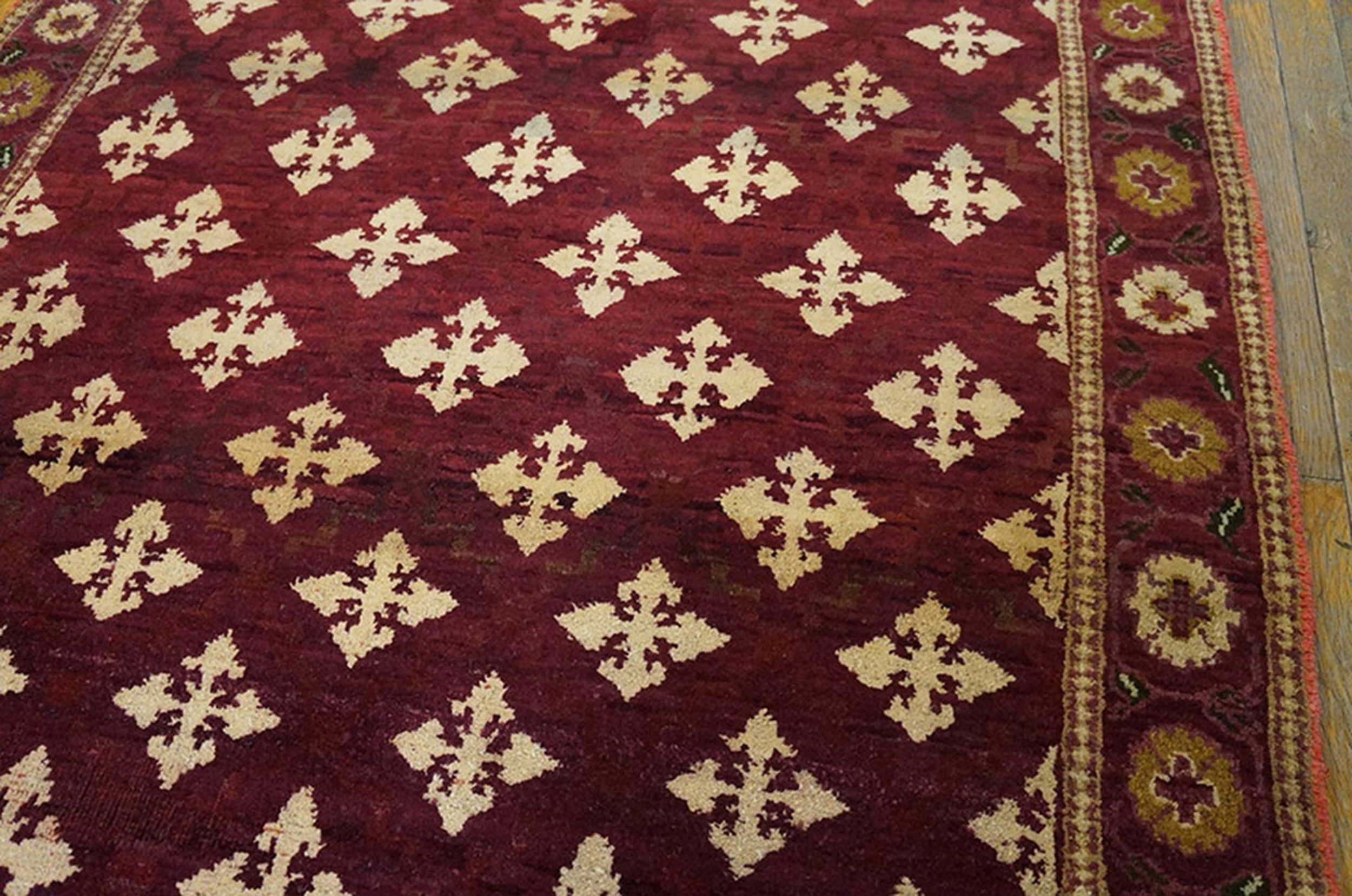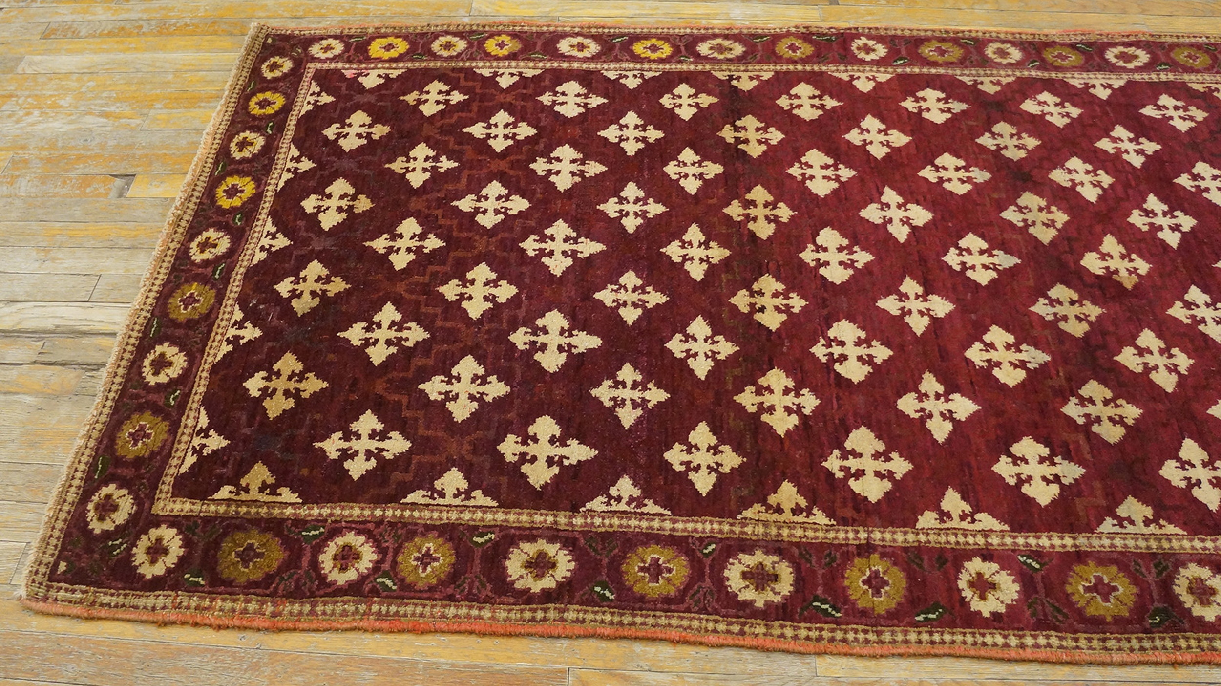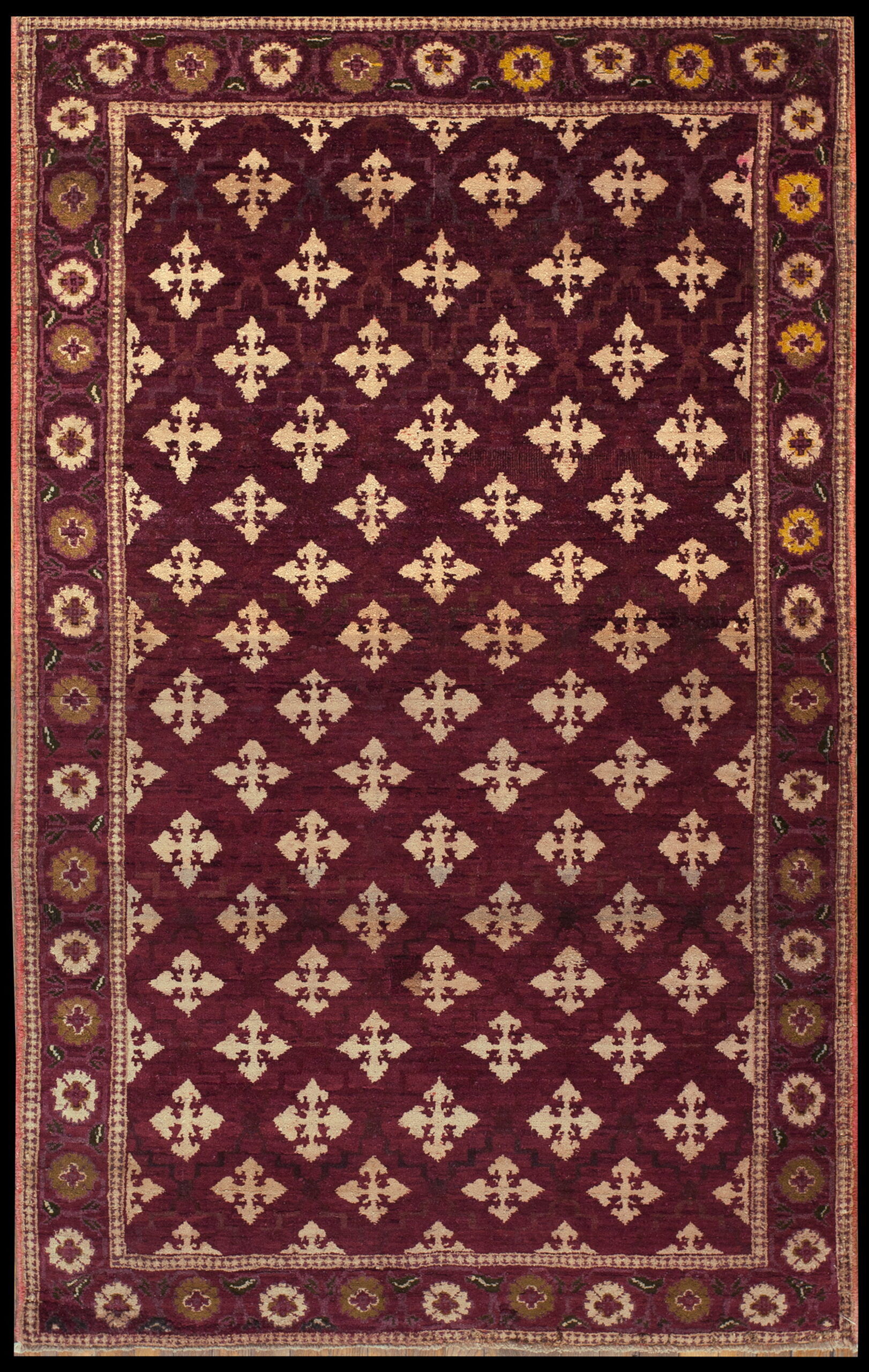 Framed by a detailed border featuring alternating circular rosettes and small floral elements, this piece retains the grandeur associated with classical Indian weaving traditions. As a genuine example of antique rugs, this Agra scatter offers both historical provenance and enduring decorative appeal.