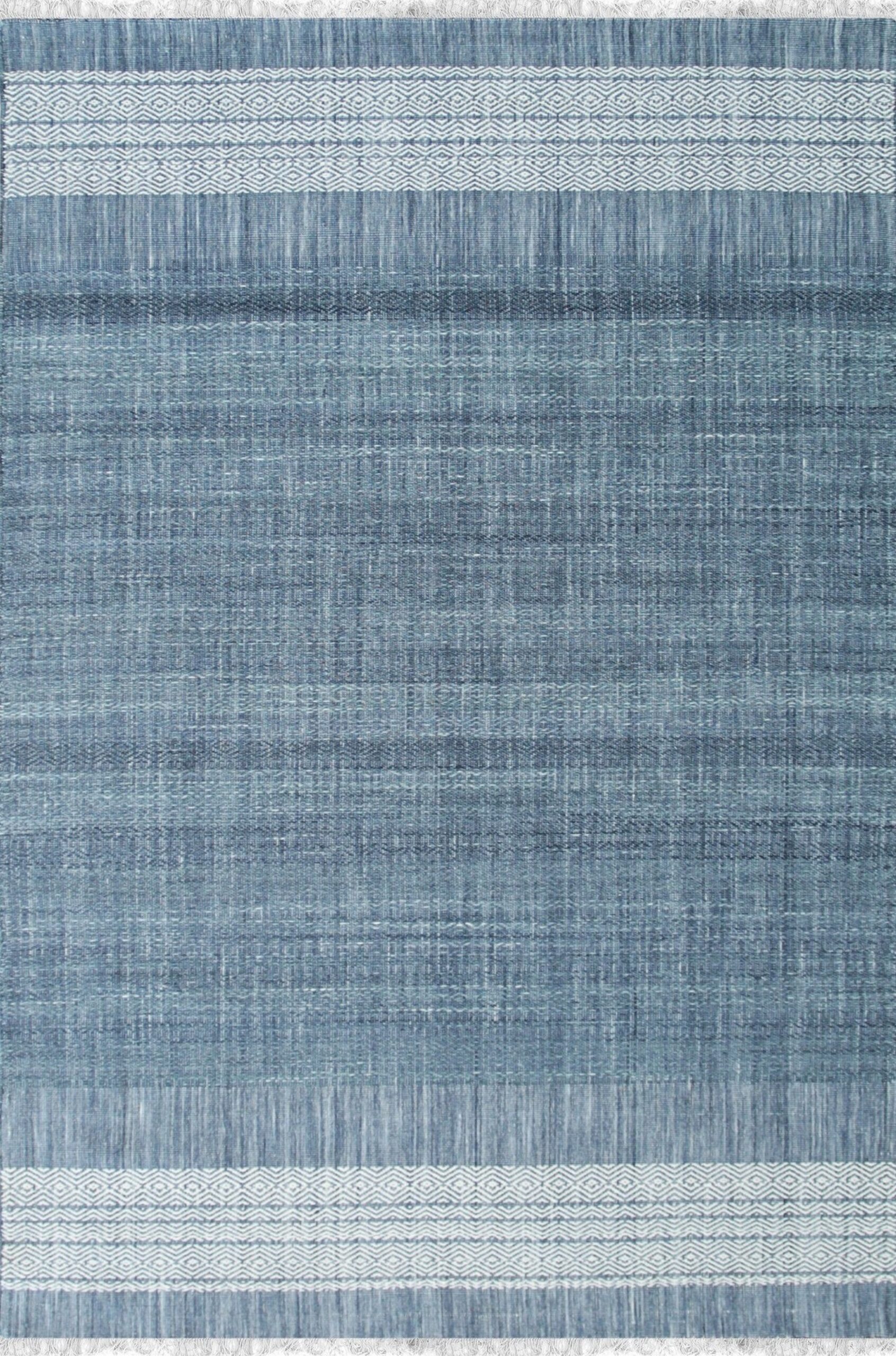 The primary field showcases a heathered, denim-like texture achieved through varied yarn shades, providing depth without visual clutter. The subtle interplay of indigo and sky tones creates a dynamic texture, placing this textile among our finest blue color rugs.