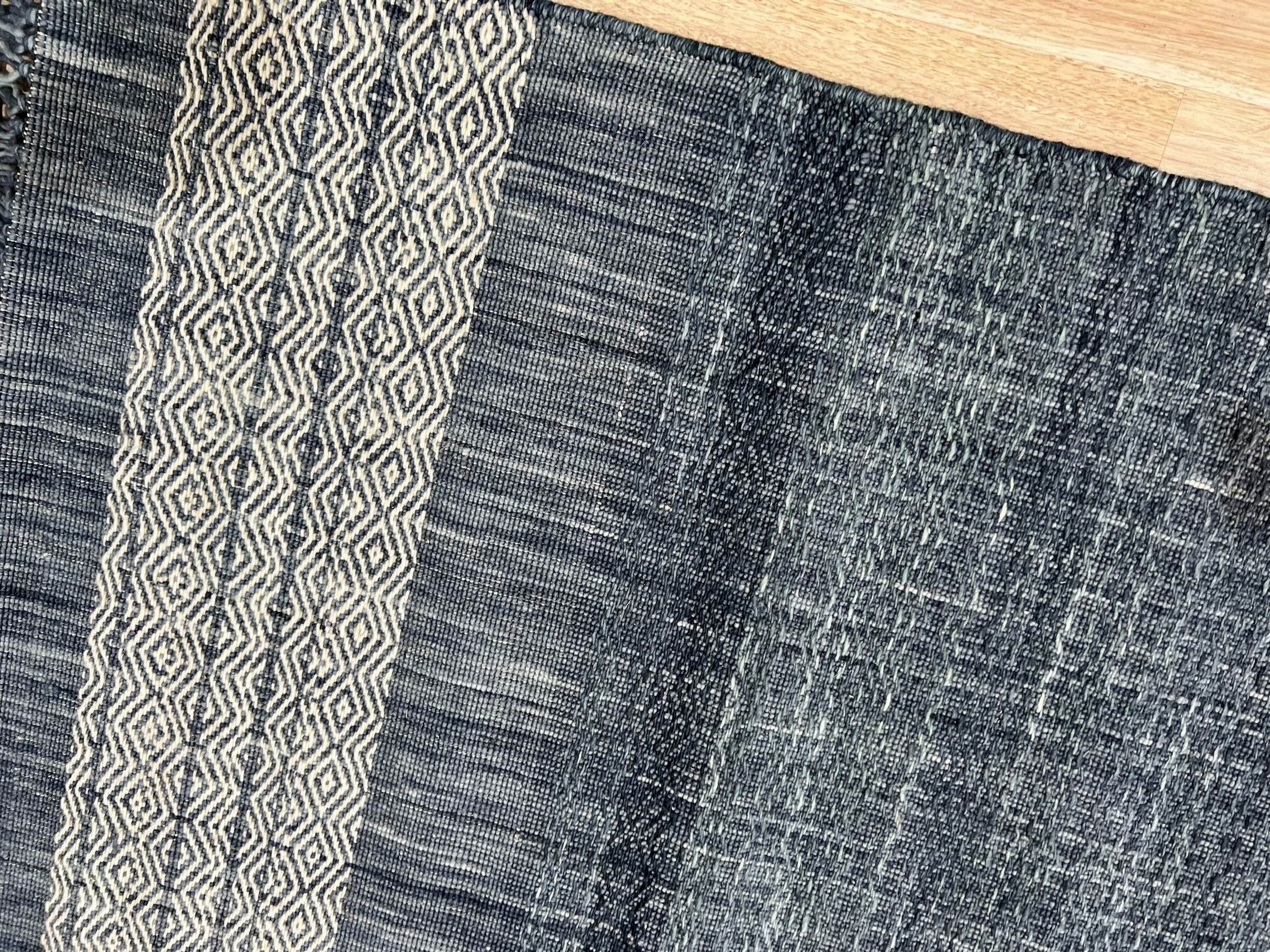 Distinct geometric bands frame the ends of the rug, utilizing a lighter contrasting thread to introduce a crisp, rhythmic pattern against the solid blue ground. While versatile in placement, the elongated structure and durable flatweave construction make it an exceptional candidate for hallway runner rugs.
