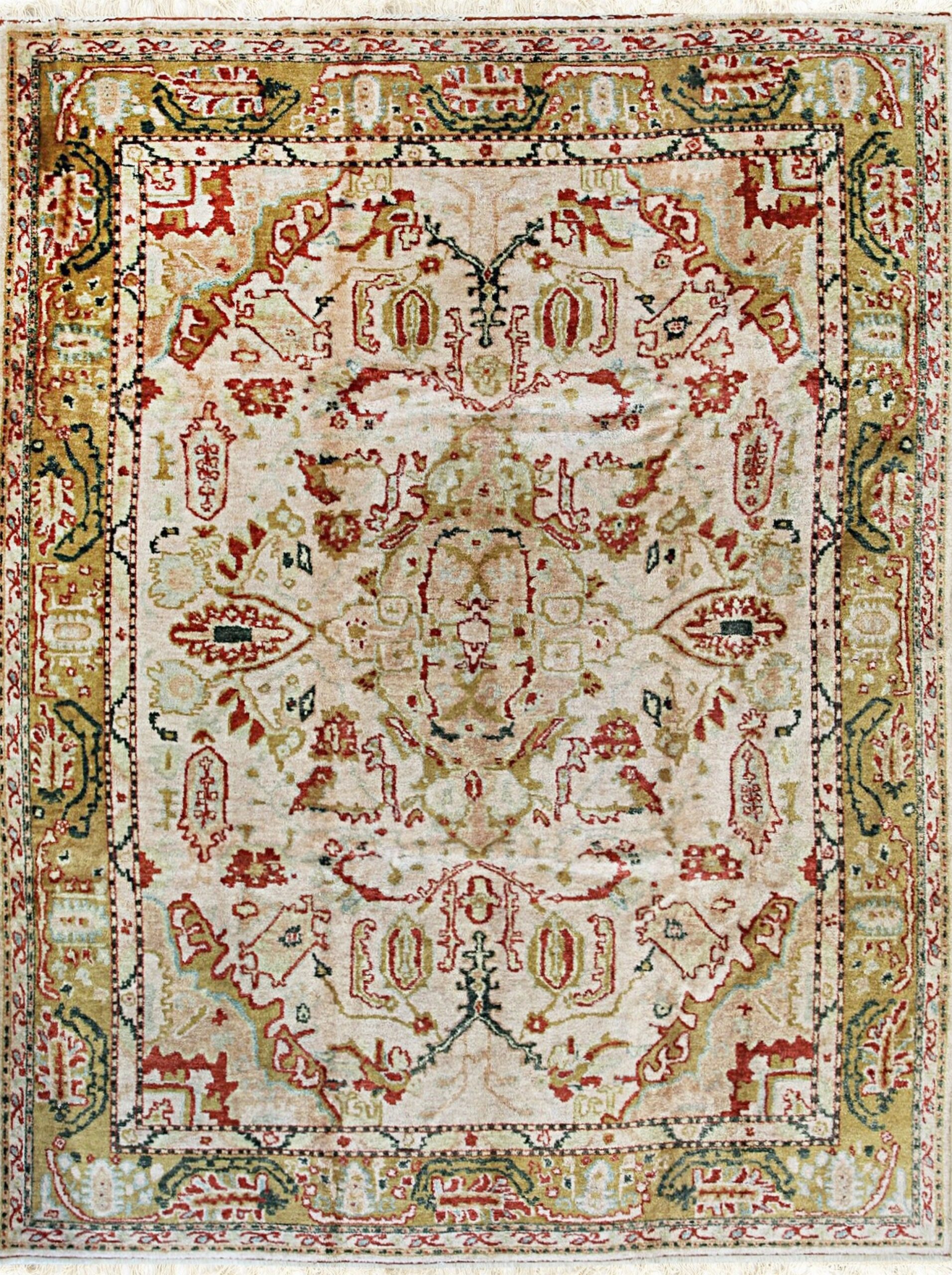The palette is grounded in serene tones of ivory and beige, providing a gentle backdrop for the stylized, large-scale medallions and palmettes. Secondary colors—including deep terracotta red, soft sage green, and muted gold—are used sparingly to define the traditional all-over pattern, ensuring the rug remains light and airy.