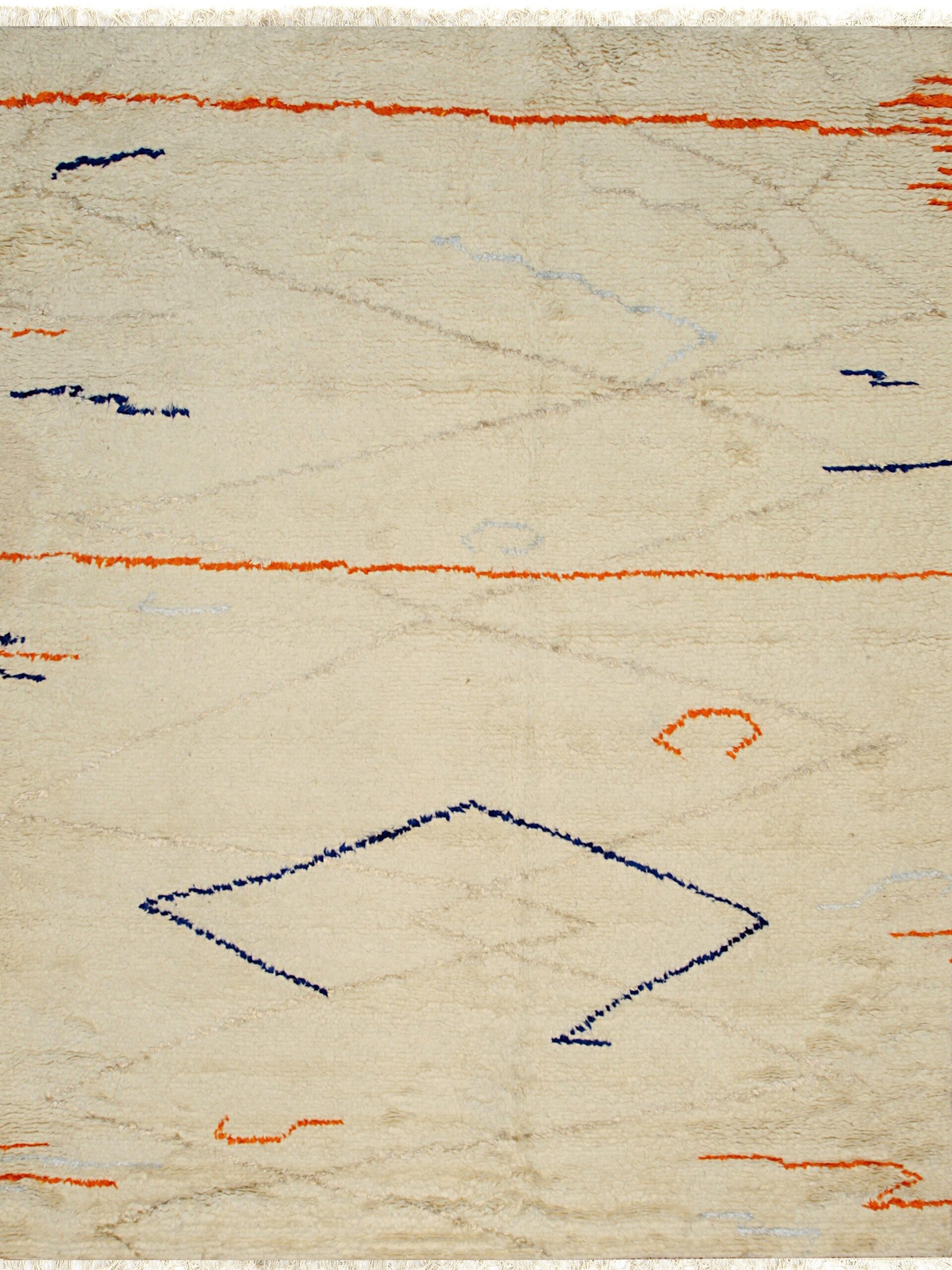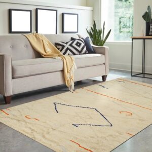 The field is dominated by a rich, natural beige, providing a neutral canvas that effortlessly integrates into modern interiors. This sophisticated palette anchors the design, placing it firmly within the desirable category of ivory and beige rugs. Abstract, spontaneous geometric elements—dashes, diamonds, and flowing lines—are rendered in striking midnight blue and vibrant tangerine, offering unexpected visual punctuation.