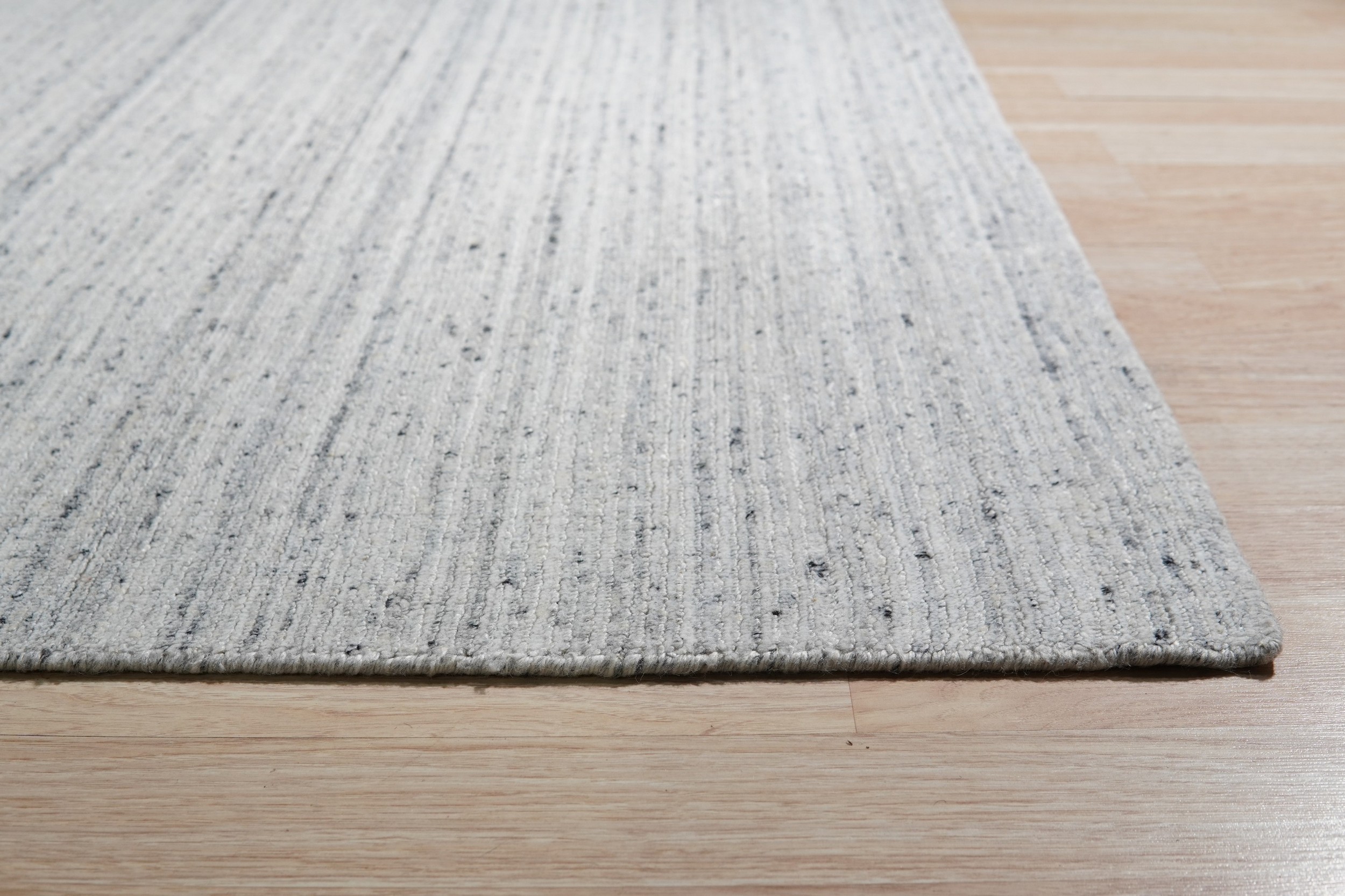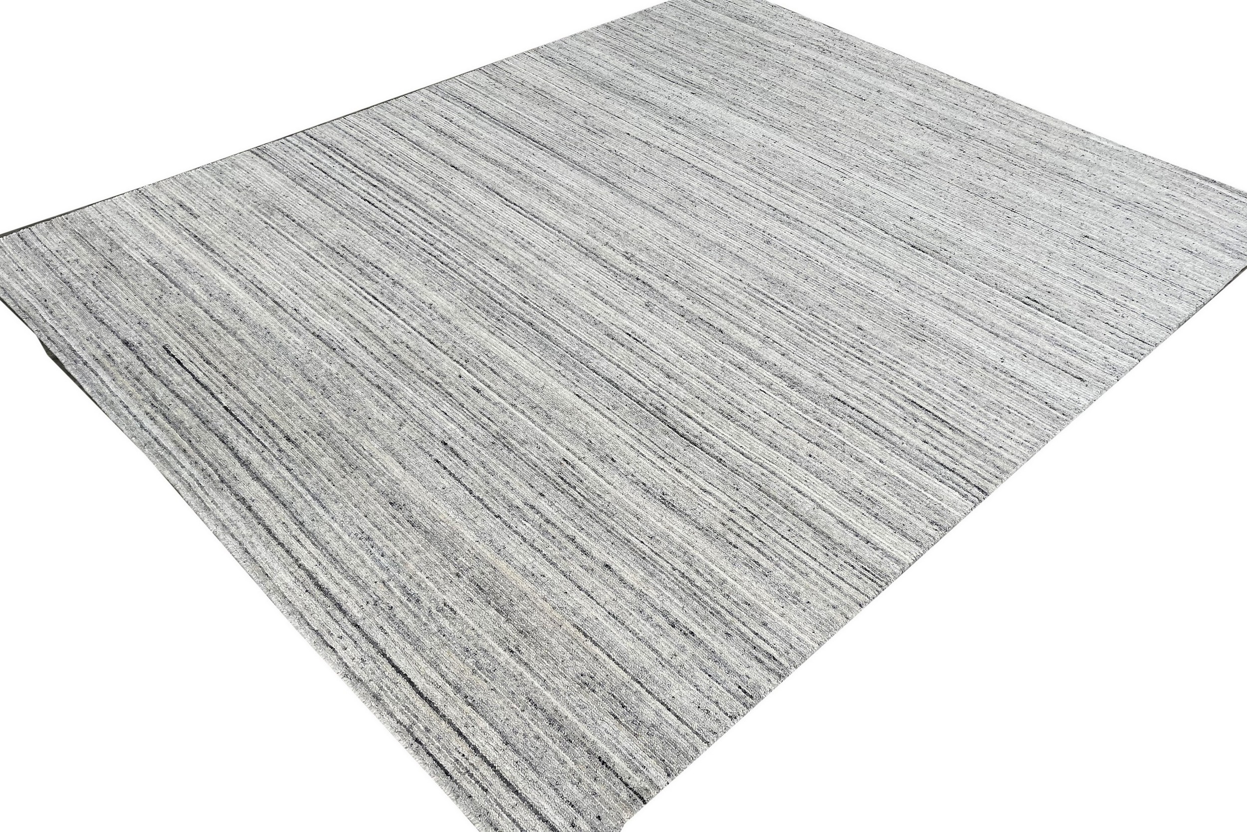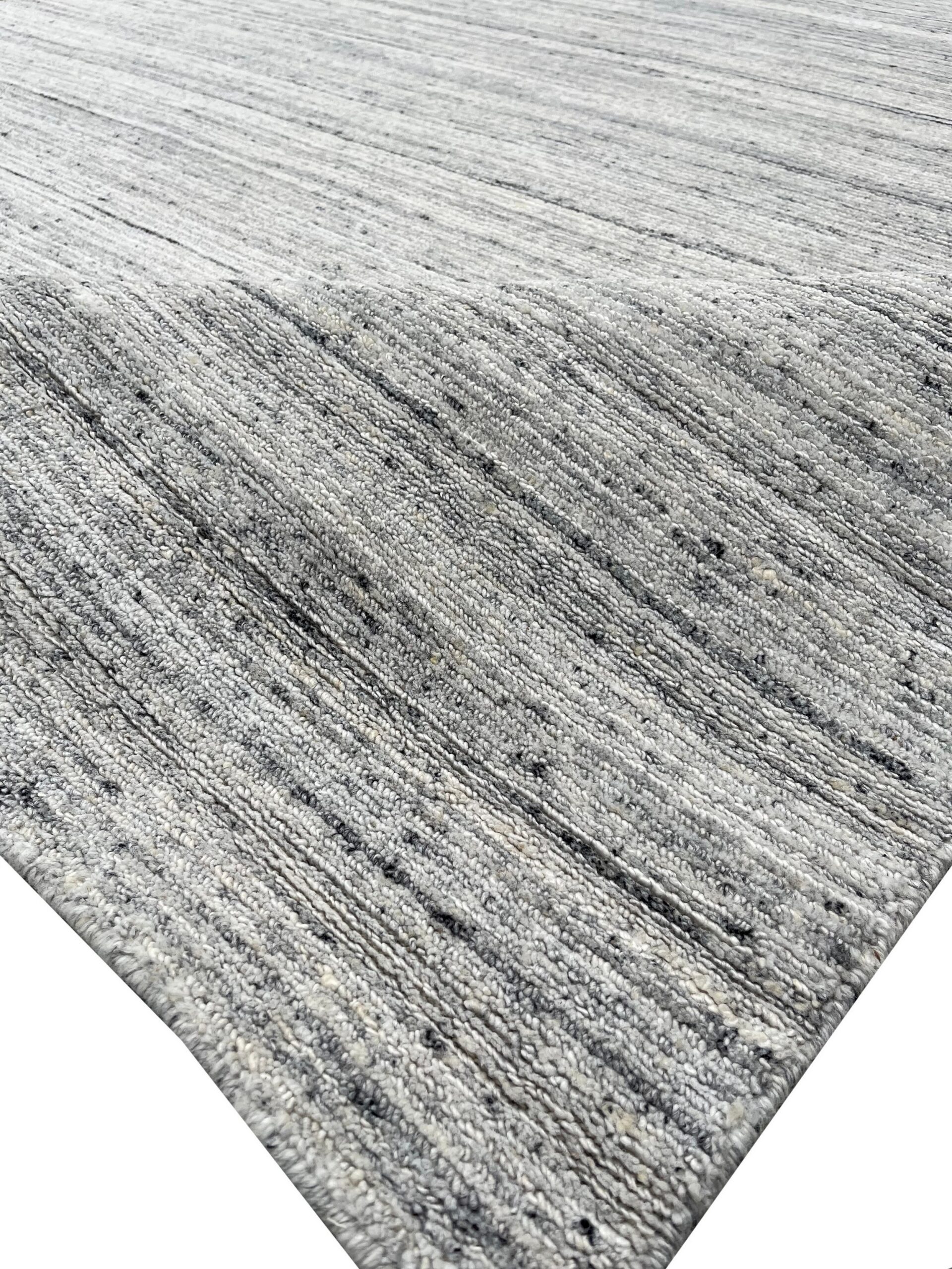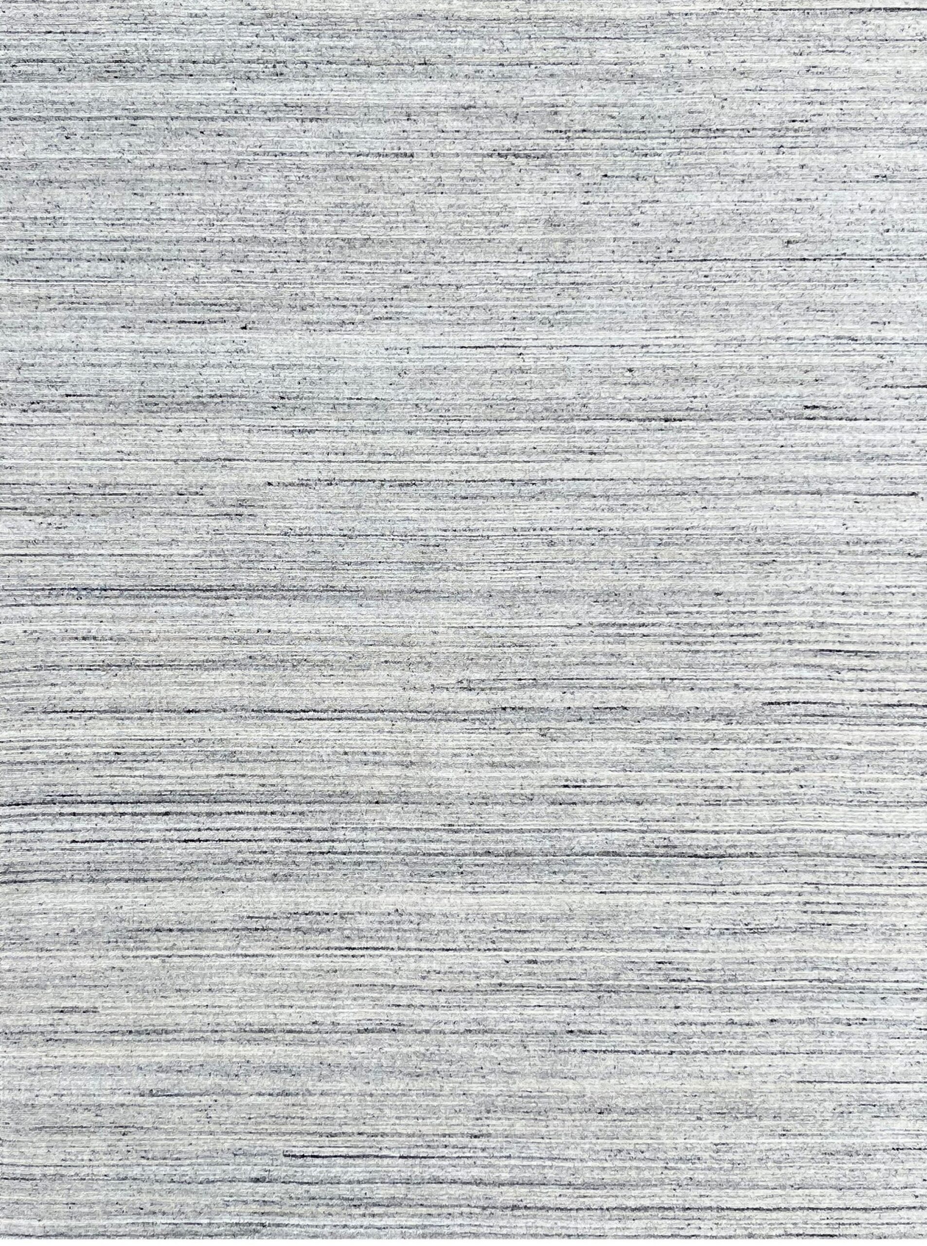 Delicate Striped Silver Handmade Wool Rug, Country of Origin: India. This exceptional piece offers a restrained, contemporary aesthetic defined by its subtle linear texture. The hand-knotted construction ensures durability while providing a soft, luxurious underfoot experience, typical of high-quality Indian rugs.