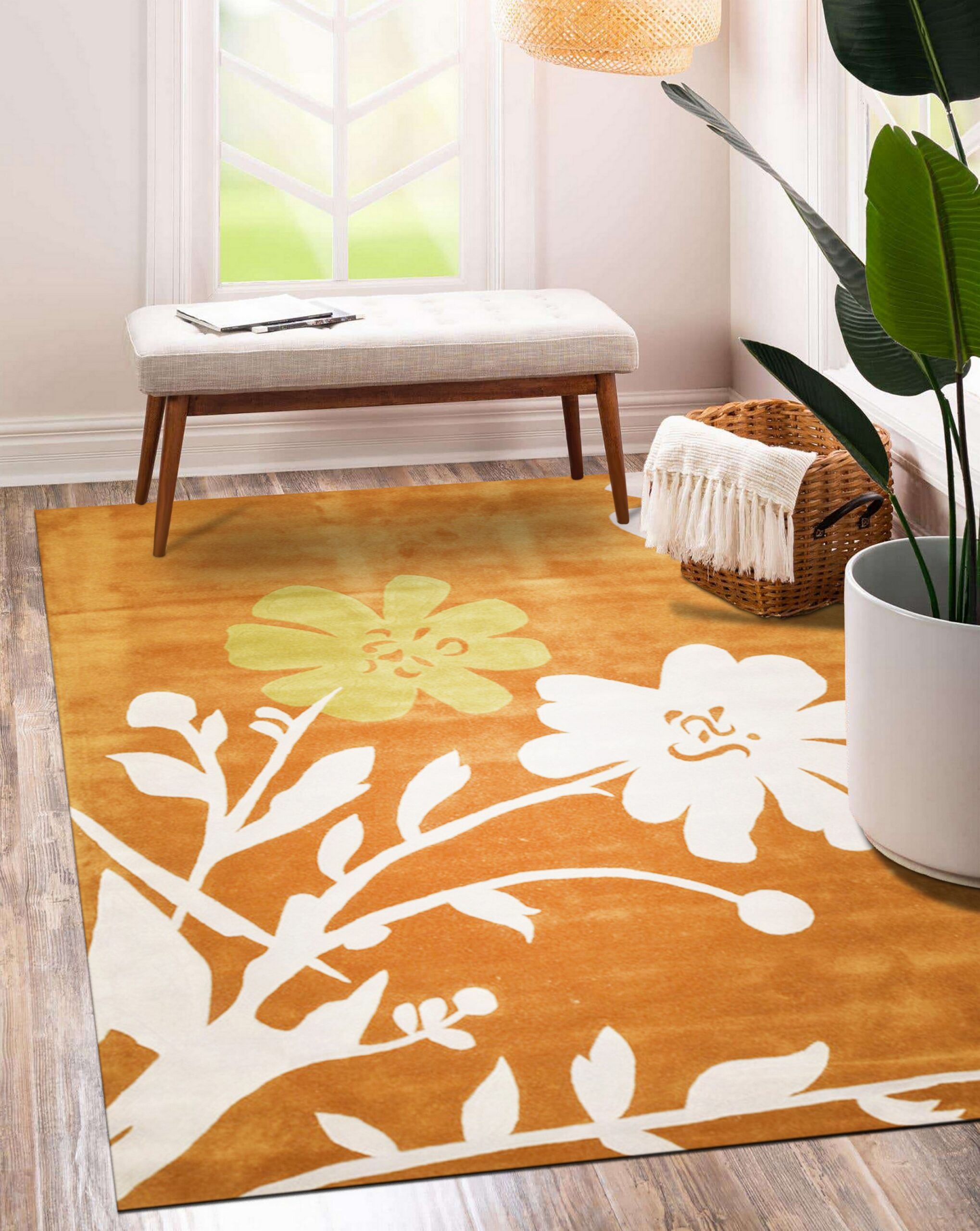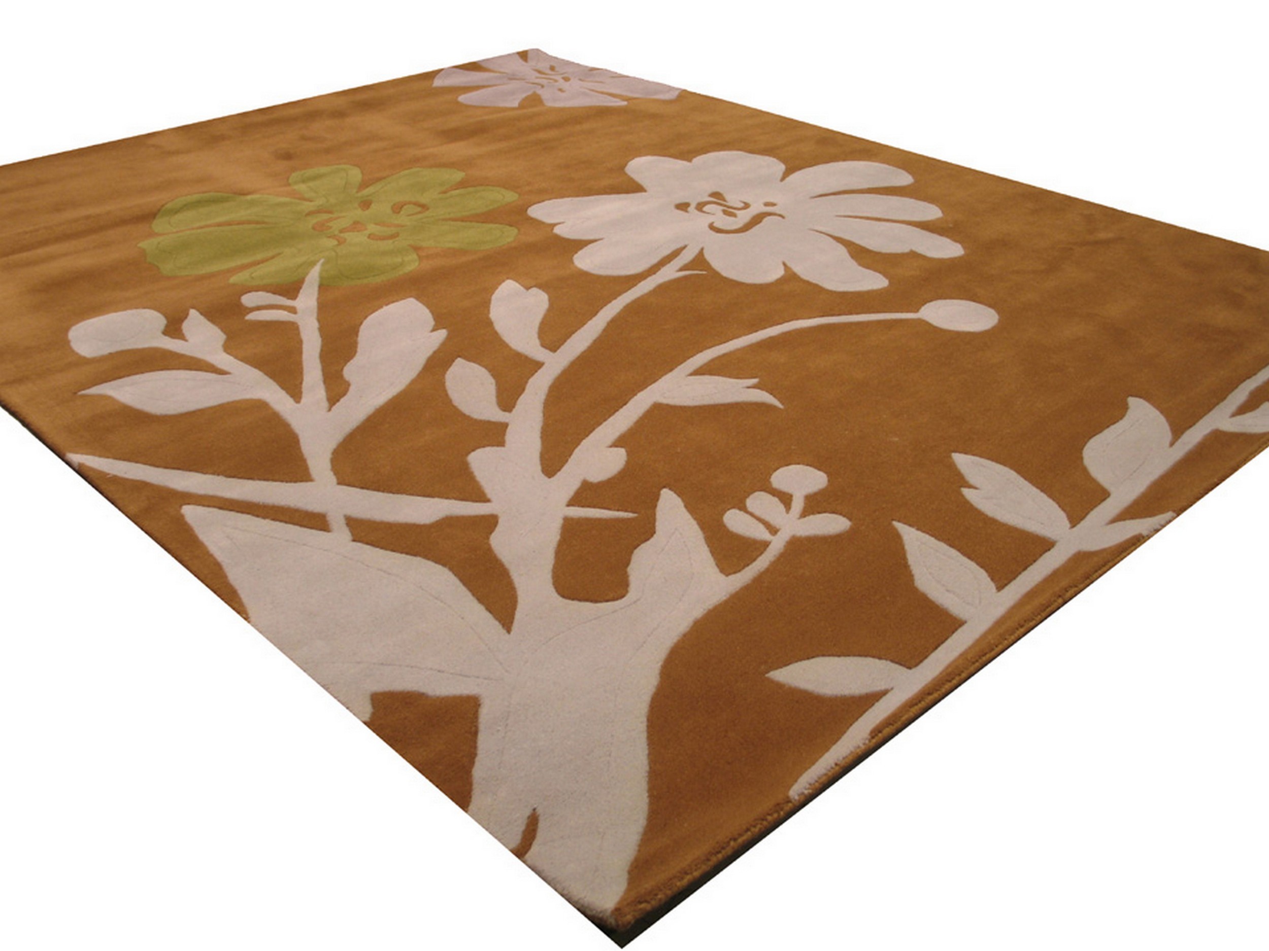 Delicate Stylish Brown Hand Tufted Wool Rug, Country of Origin: India. This striking contemporary piece offers a bold, graphic interpretation of nature. Hand-tufted from luxurious wool, the design features oversized, stylized blossoms that float across a rich caramel field. The craftsmanship reflects the long-standing textile traditions of Indian rugs.