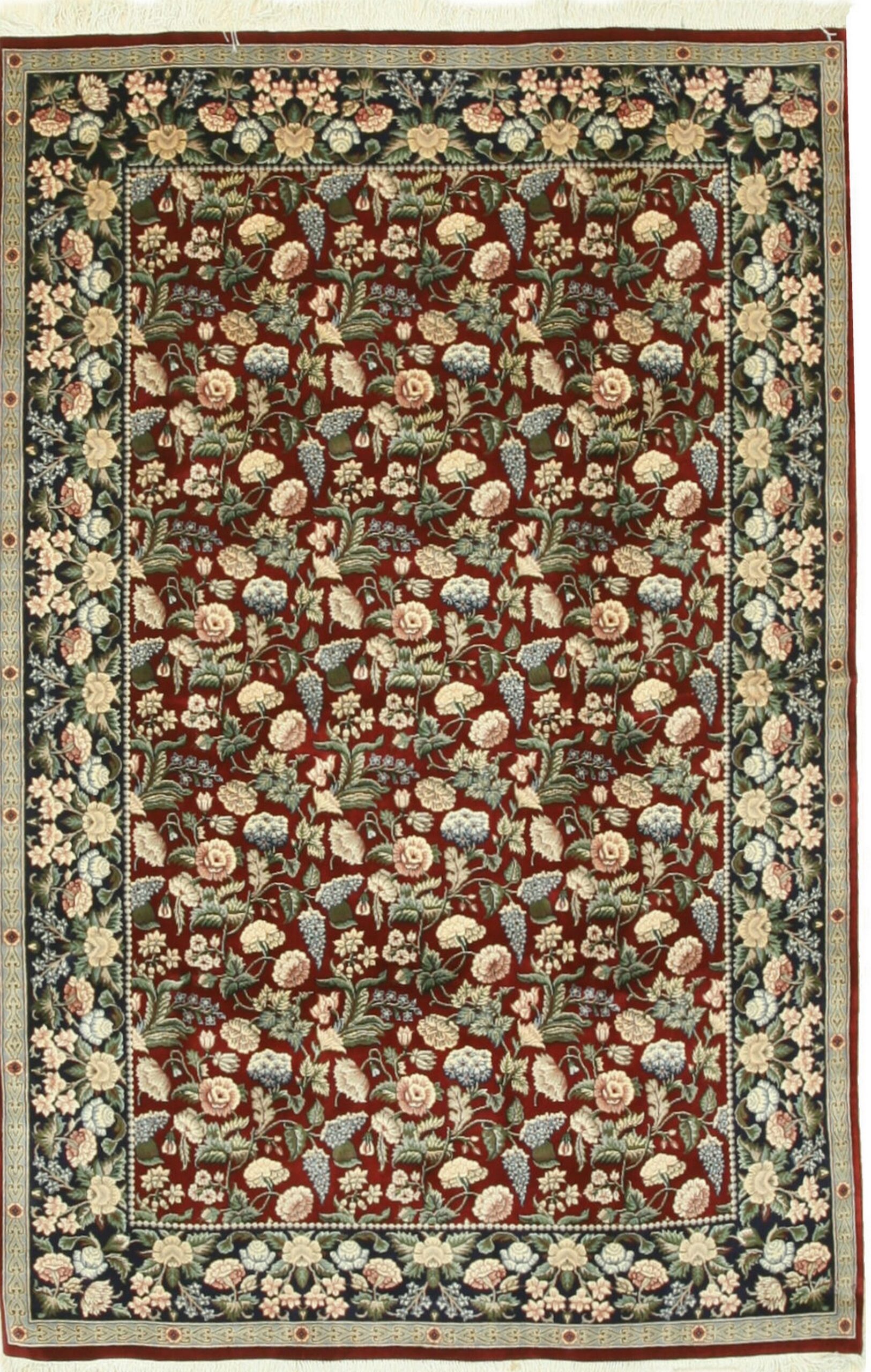 Delicate Traditional Multicolor Hand Knotted Wool Rug, Country of Origin: Pakistan. This exquisite hand-knotted wool piece showcases the enduring quality and craftsmanship associated with Pakistani rugs. The design interprets classical European garden motifs, rendered in a dense, all-over pattern that speaks to timeless elegance.
