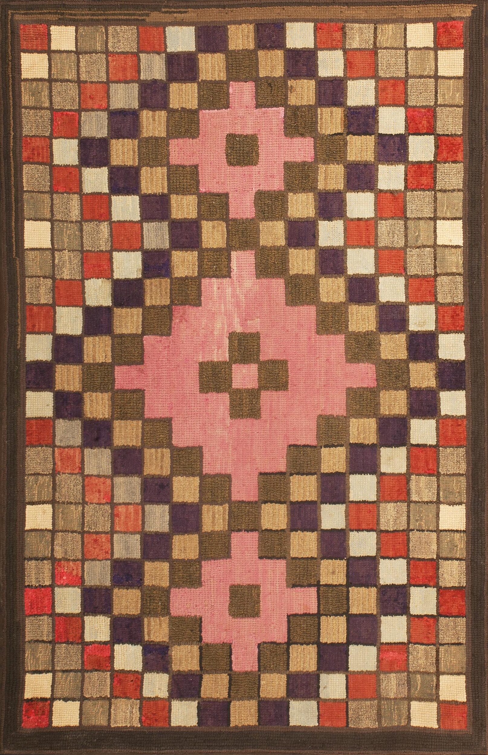 The design is a masterful study in graphic geometry, eschewing traditional borders for an intense, allover geometric pattern composed entirely of small, meticulously hooked squares. A striking central diamond, rendered in a faded rose pink, anchors the composition against a dynamic field of earth tones, deep purples, and sporadic bursts of brick red and cream.