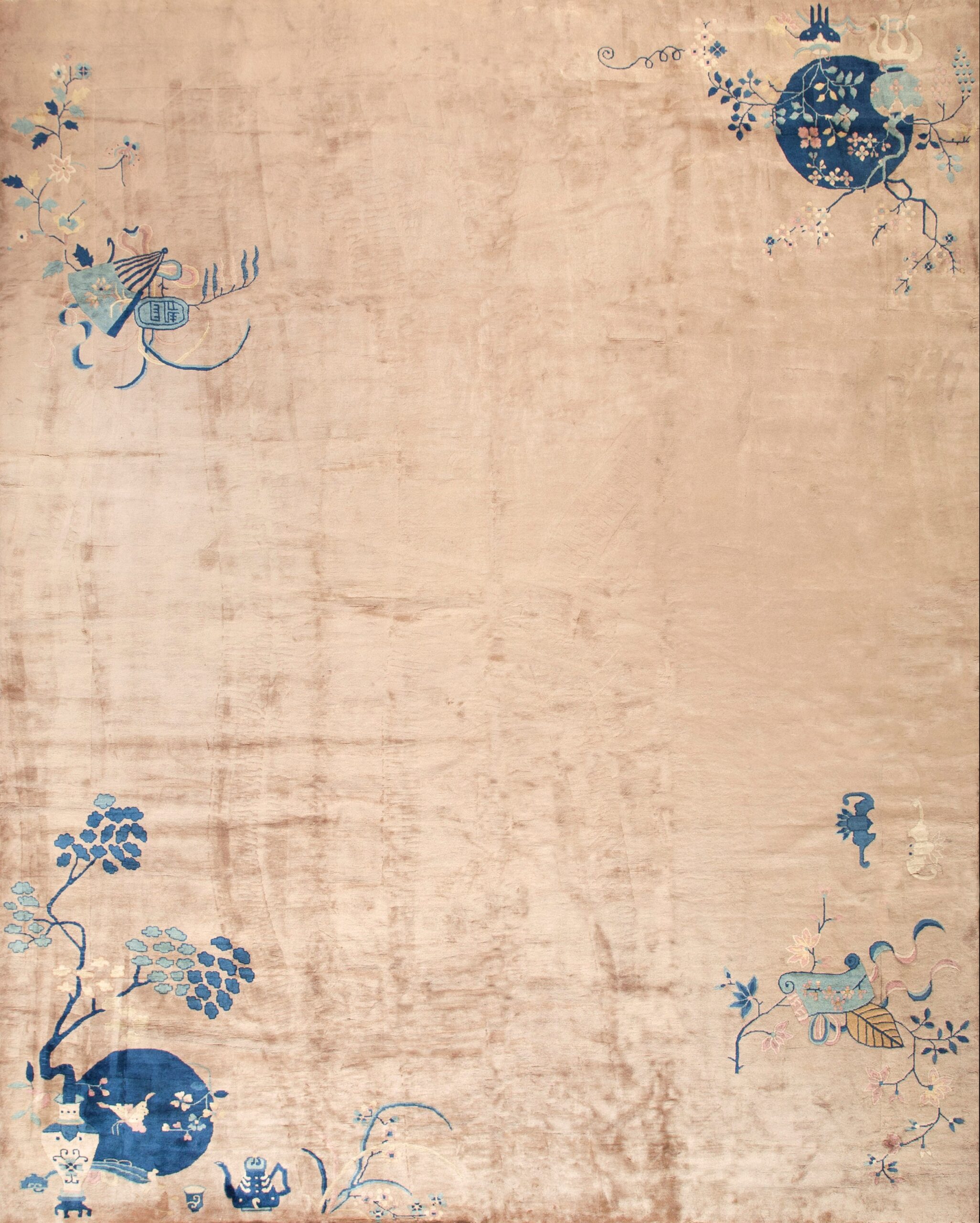 The borders are often minimal or utilize a contrasting solid-color band to provide a sharp, architectural “frame” for the expansive field. To possess this Antique Chinese Art Deco Open Field rug is to own a piece of 20th-century design history. It bridges the gap between the ancient artistic traditions of the East and the avant-garde spirit of the West—transforming any grand space into a sanctuary of historical gravity, playful elegance, and serene, modern grace.