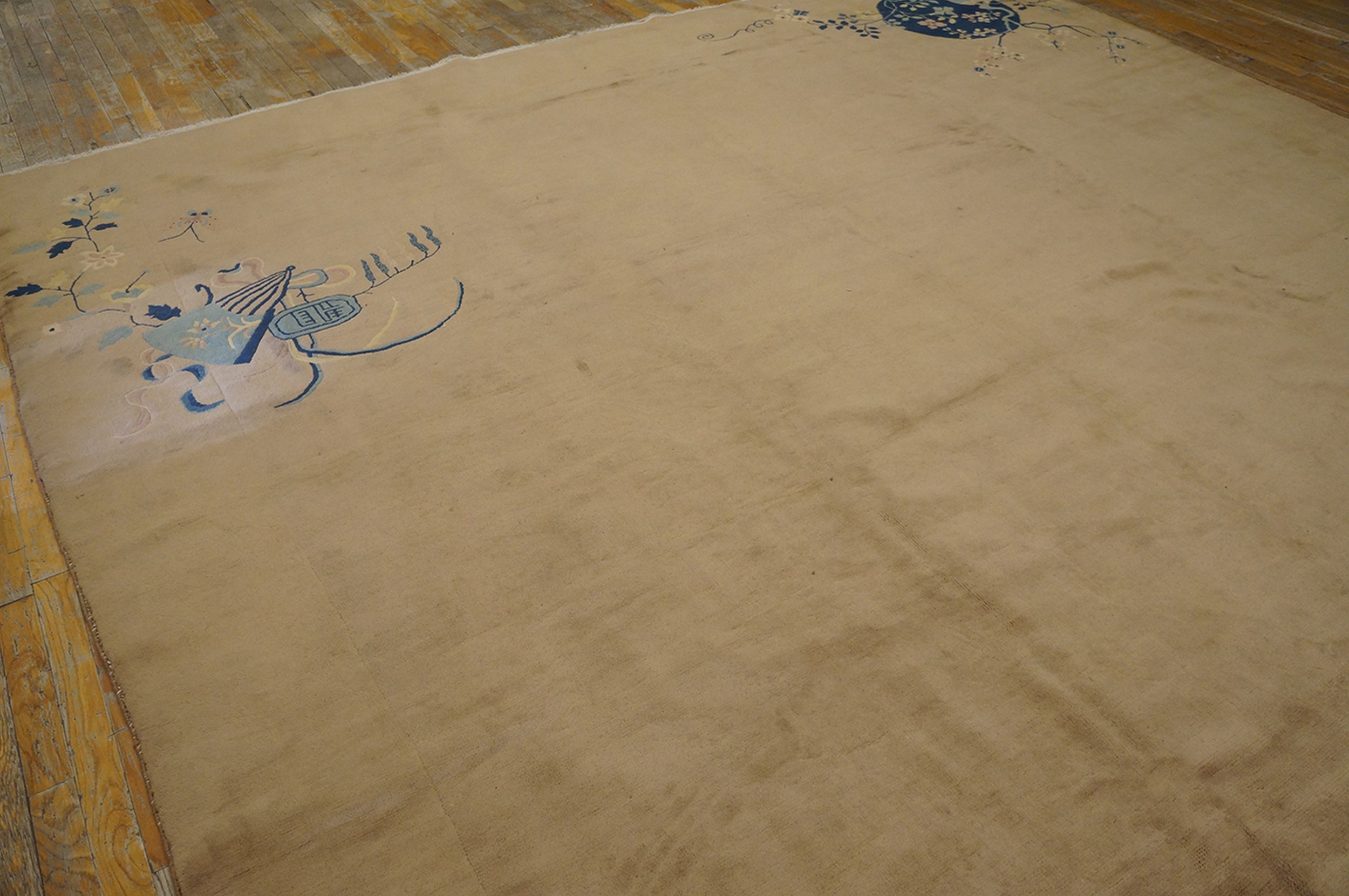 Technically, this Art Deco rug from China is prized for its exceptionally thick, “plush” pile and substantial, “heavy” handle. The wool used during this period was often a high-grade “Lustre Wool,” known for its long fibers and high lanolin content. This results in a surface that is not only incredibly durable but possesses a silky, reflective sheen. A defining feature of these rugs is the deep hand-carving or “incising” technique, where the weaver hand-clipped the wool around the decorative motifs to create a three-dimensional, sculptural effect, making the colorful blossoms “pop” against the open field.