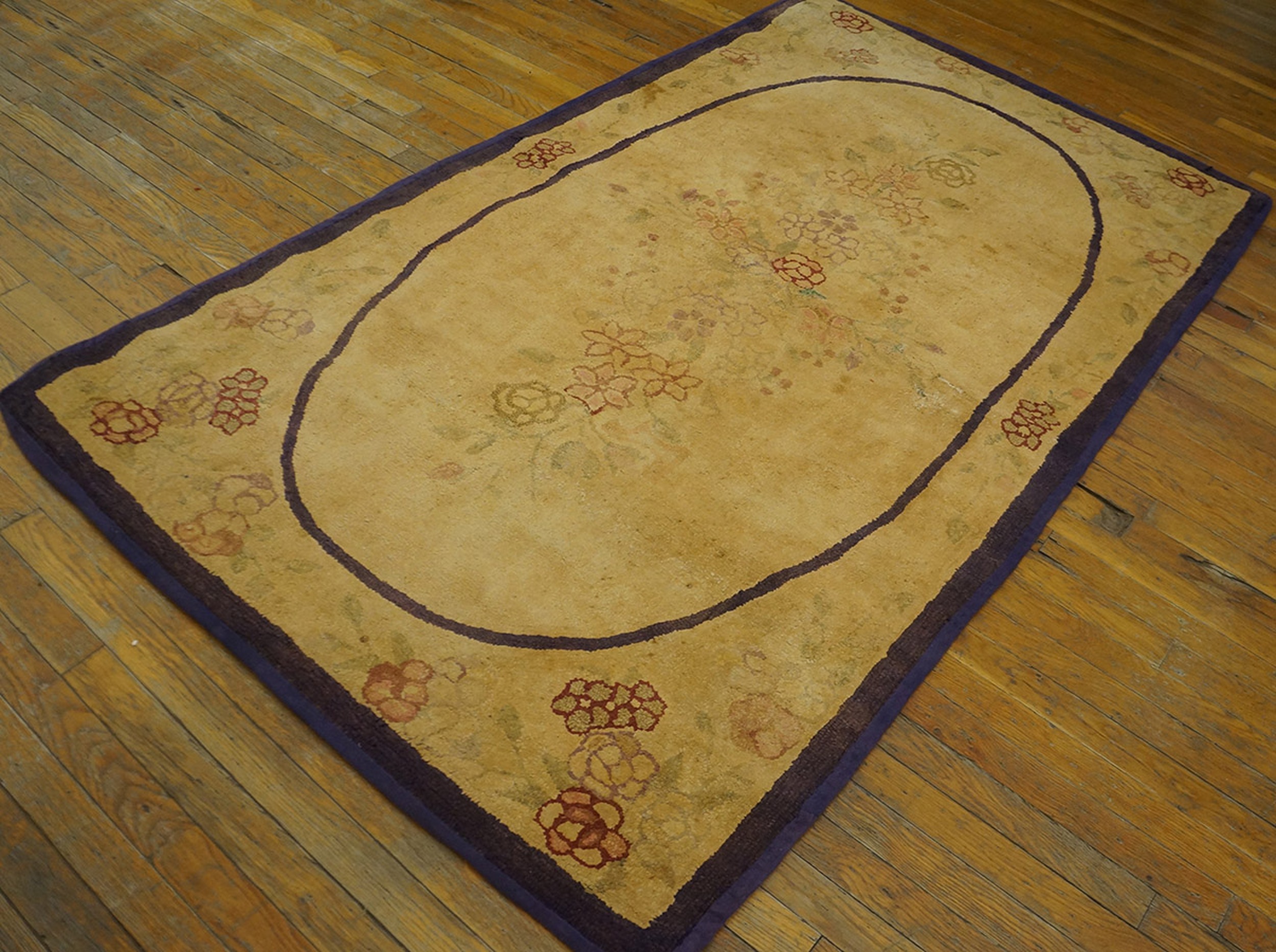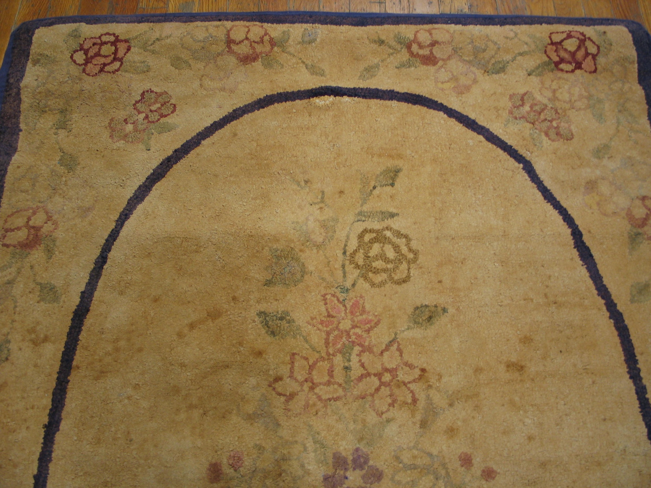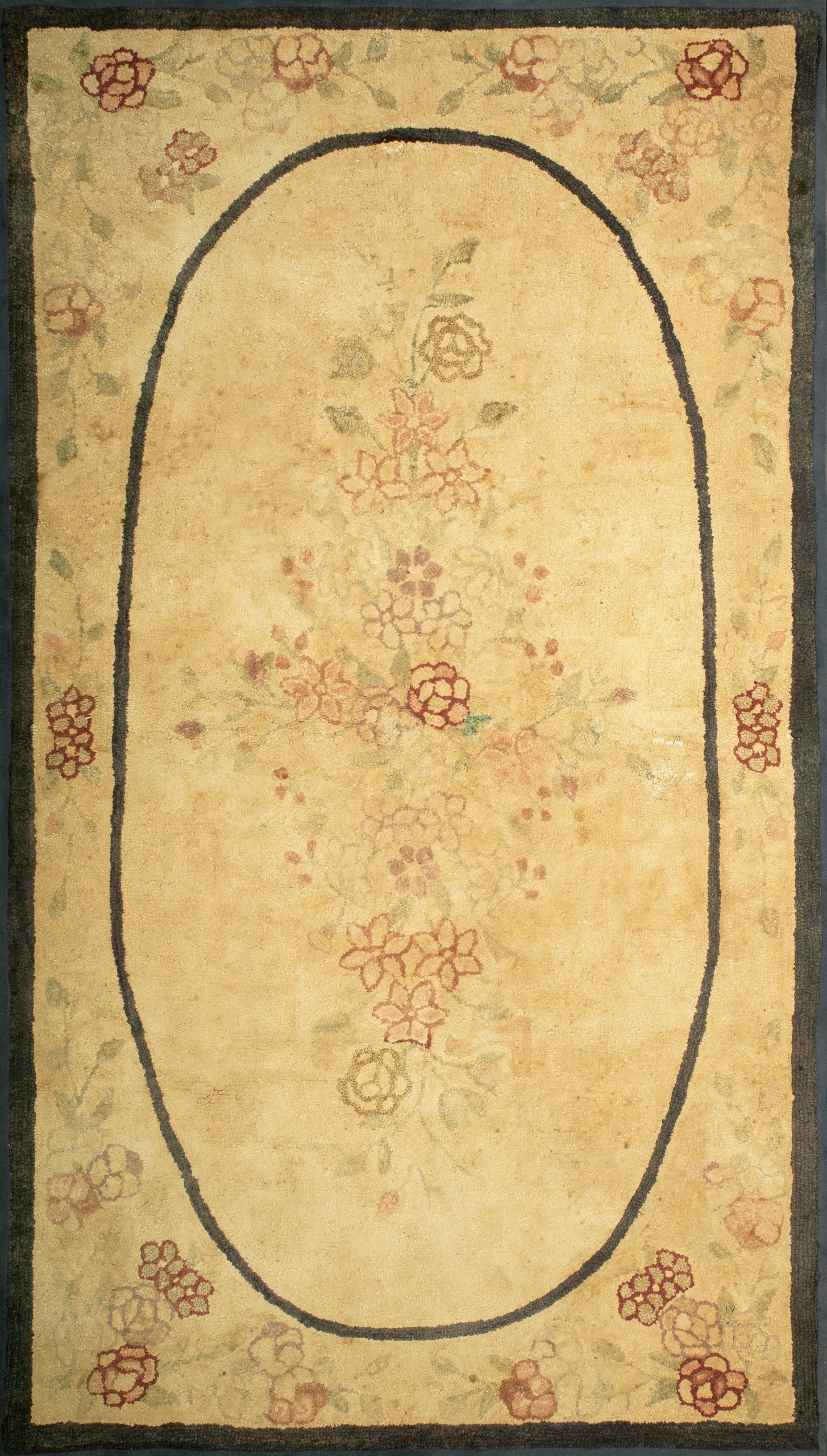 The borders act as a simple architectural frame, often featuring a darker, “mottled” edge that “locks in” the airy lightness of the ivory center. The small size makes it an incredibly versatile textile, perfect for adding a layer of historical soul to a bedside, an entryway, or even being displayed on a wall as a piece of textile art. To possess this early 20th-century antique American floral folk art design rug is to hold a piece of North American heritage—a hand-wrought sanctuary of historical gravity and sun-drenched, botanical grace.