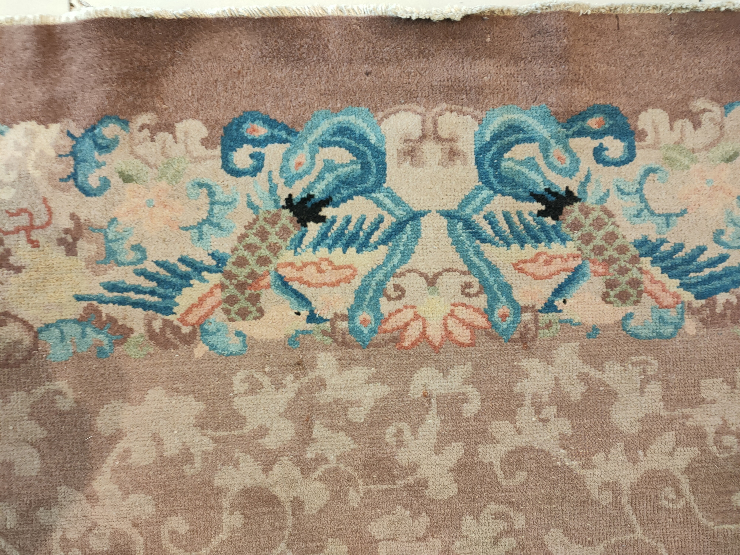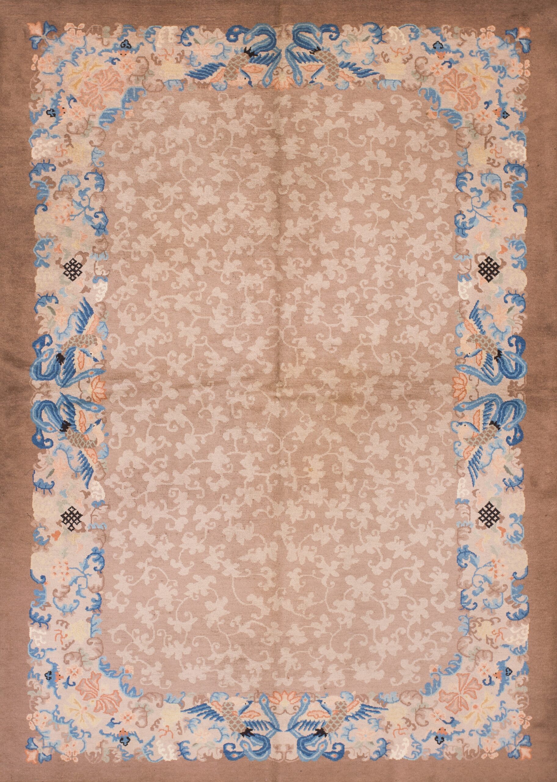 Unlike many contemporary designs that feature a central medallion, this piece utilizes an allover design of meandering vines and stylized blossoms in the field. This subtle backdrop allows the elaborate border—detailed with vibrant sky blues, soft pinks, and stylized mythical birds—to command attention, creating a harmonious balance between restraint and exuberance.