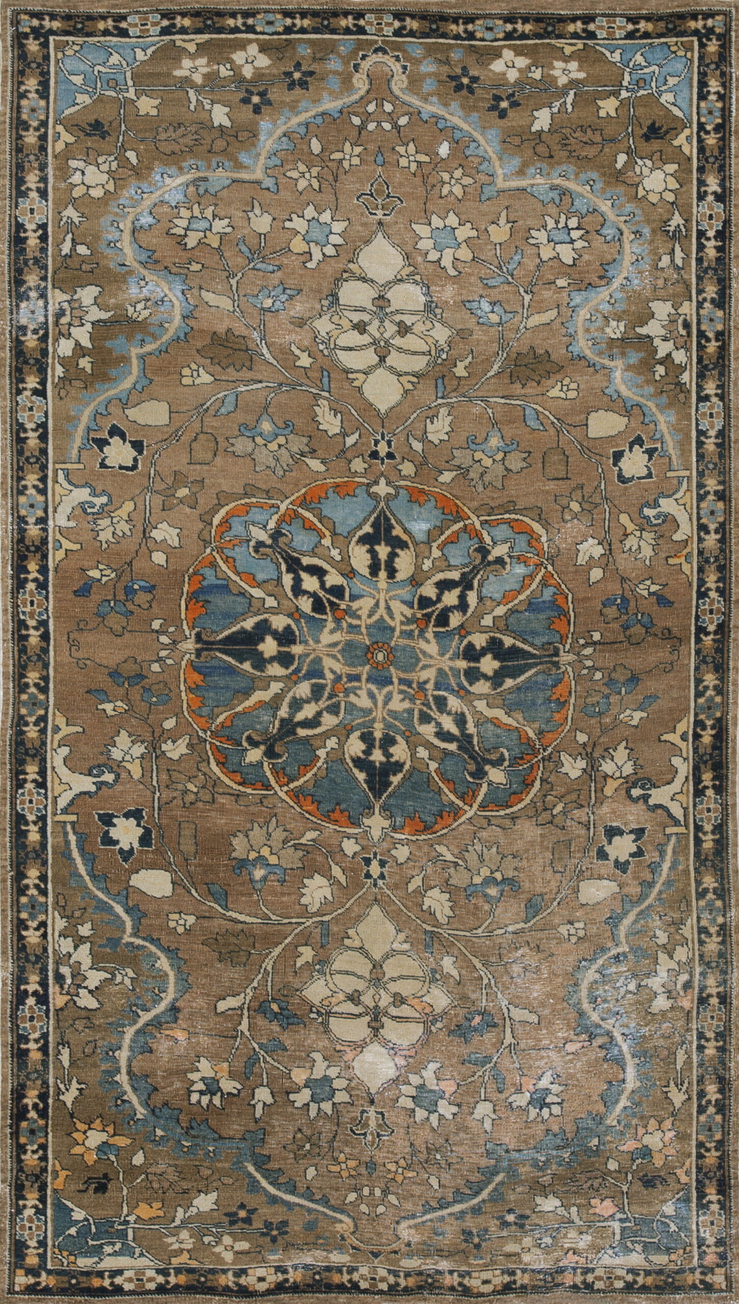 The central design features an elegant, stylized medallion rendered in deep blues and ivory, anchored by gracefully scrolling vines and palmettes. The overall composition is a masterclass in controlled density, showcasing traditional Persian floral rugs patterns that emphasize movement and balance within the structure.