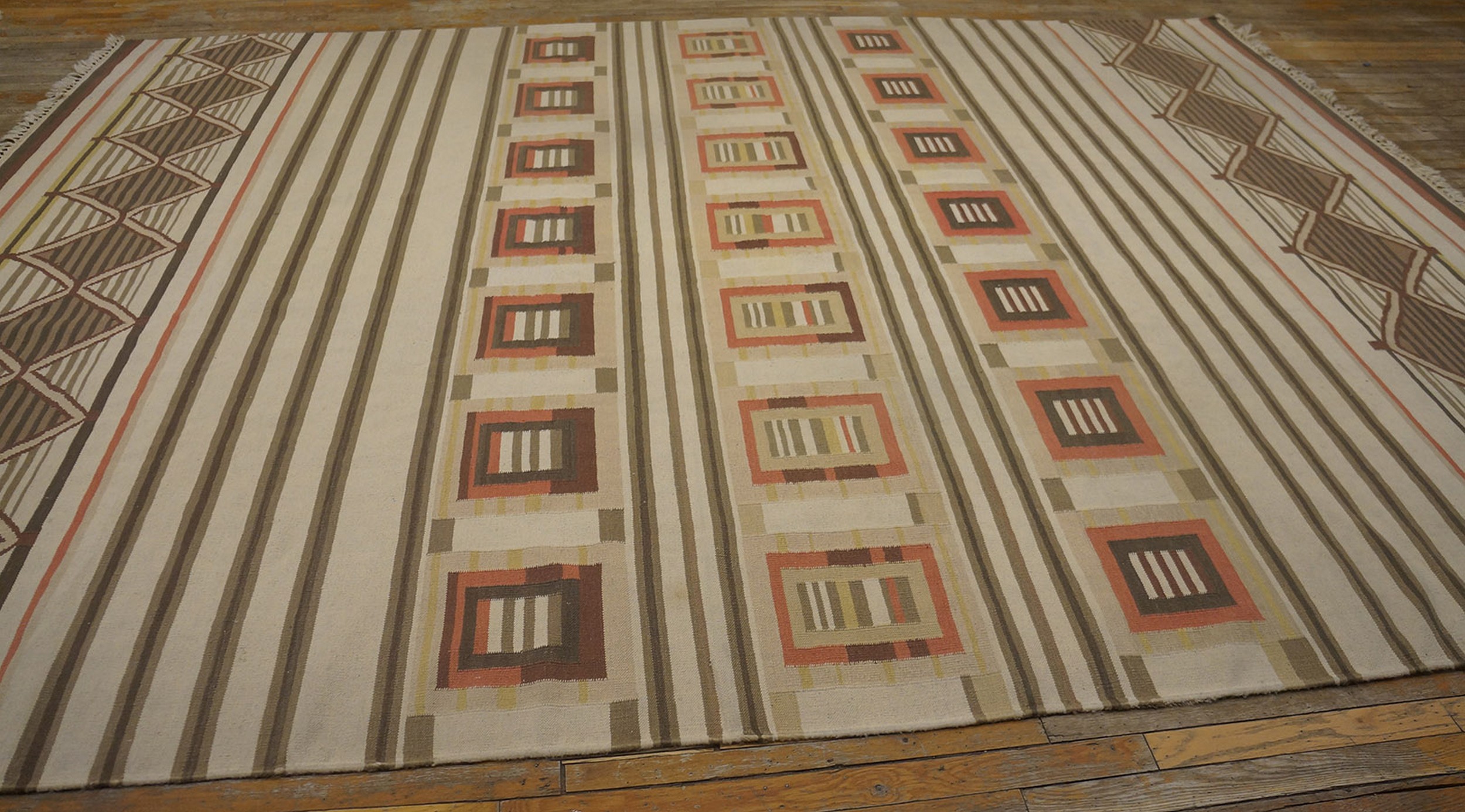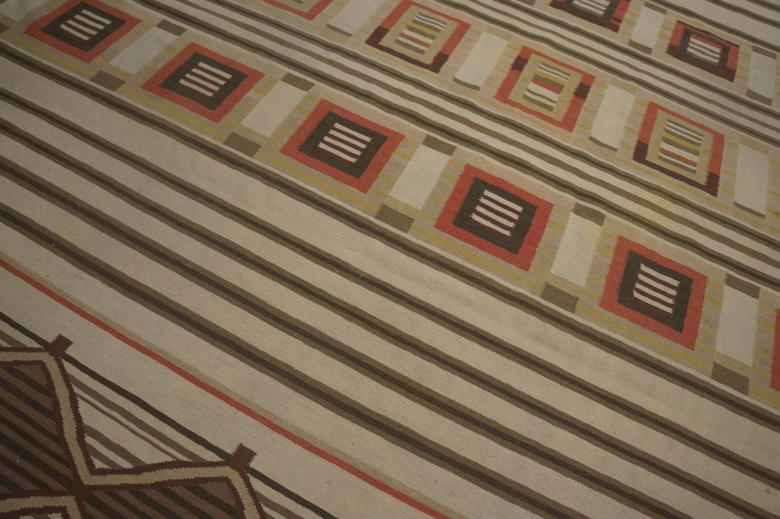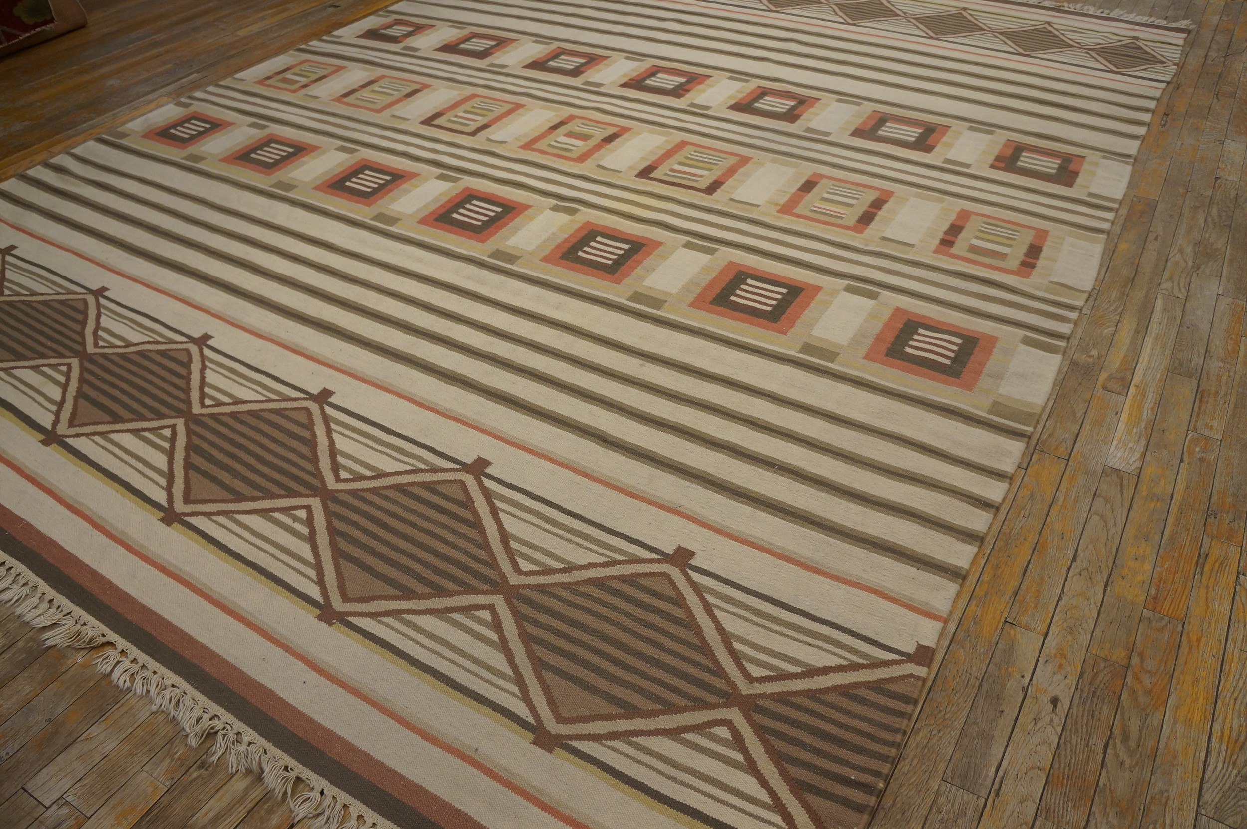 As a flat weave kilim, this rug offers a durable and versatile floor covering, ideal for high-traffic areas where texture and pattern are prioritized over pile depth. Its substantial dimensions classify it among room size rugs, ensuring it can anchor a primary living space or dining area with understated elegance.