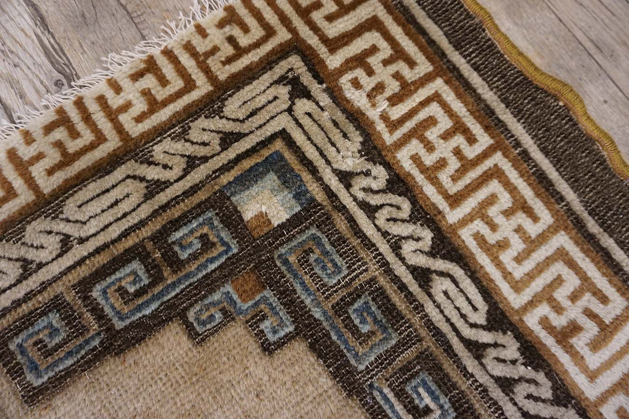 Given its intimate scale and highly detailed execution, this piece functions perfectly as one of the highly collectible small scatter size rugs. Such formats were often woven for specific domestic or monastic purposes, requiring meticulous detail and a composition that reads clearly despite the compressed dimensions.