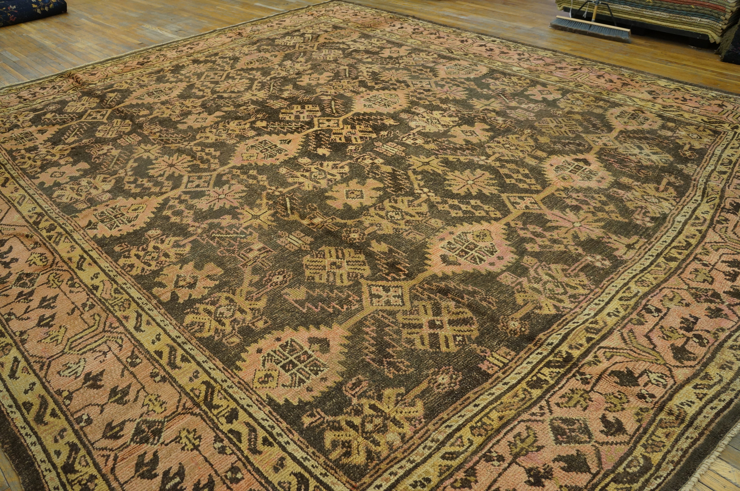 Antique Oushak Room Size Wool Brown Rug, Circa Date: 1920s. This magnificent example of Anatolian weaving tradition showcases the robust, large-scale geometry characteristic of early 20th-century antique rugs. The craftsmanship reflects the enduring quality and distinctive aesthetic associated with the Oushak region.