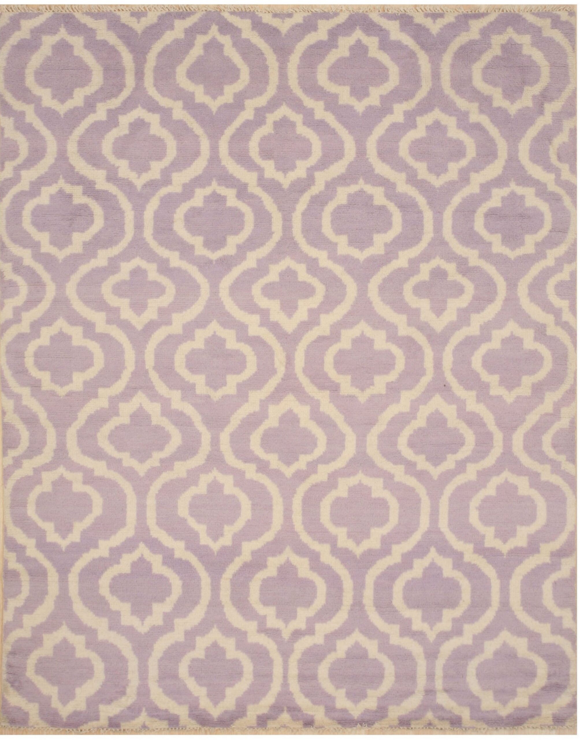 The repeating quatrefoil motif, rendered in a soft, creamy ivory against a textured lavender field, creates a dynamic yet harmonious visual rhythm. This large-scale geometric pattern is highly sought after in contemporary design, making it a perfect addition to our collection of new area rugs.