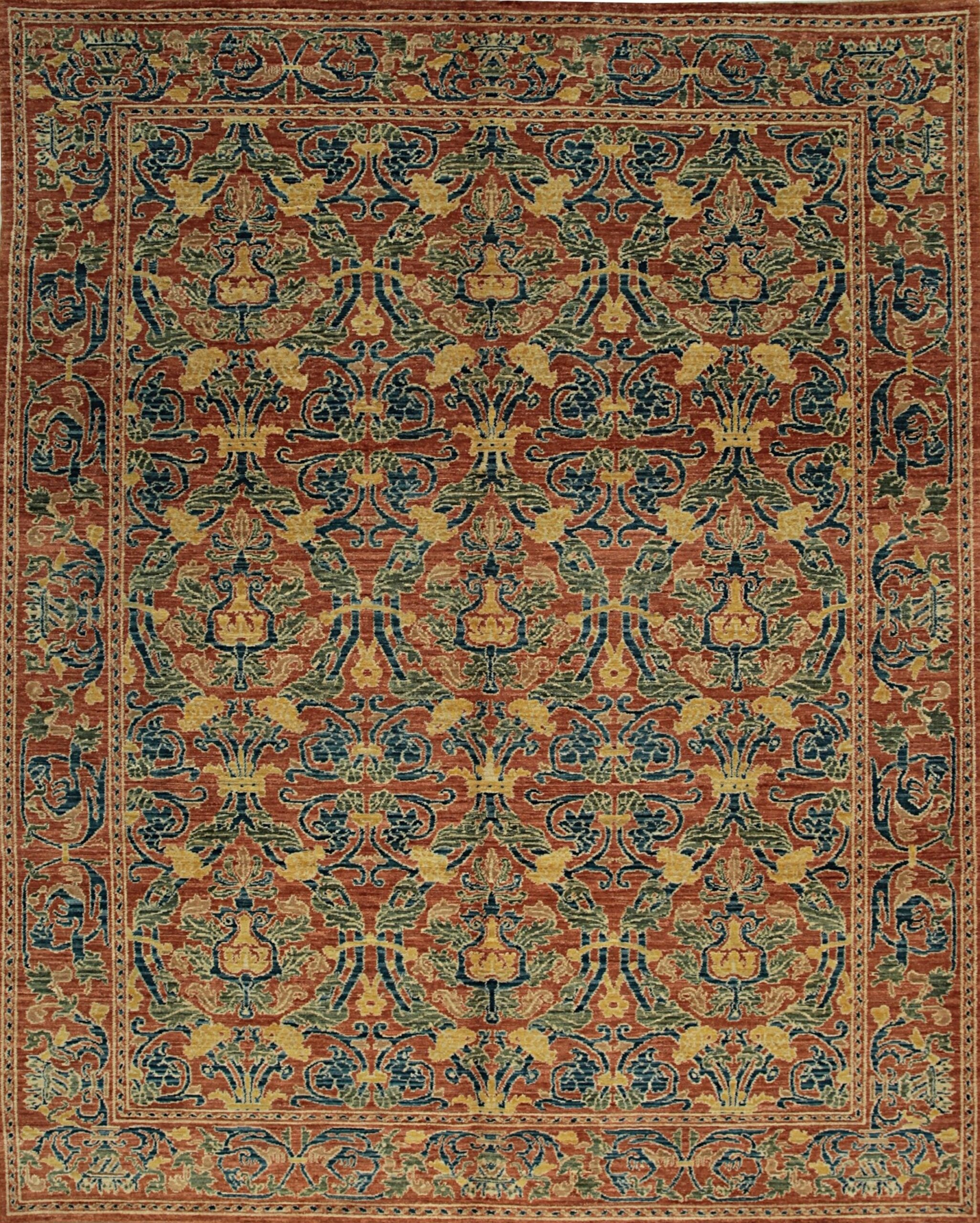 Featuring an intricate repeat of stylized palmettes, scrolling acanthus leaves, and classical urn forms, the design maintains a formal rhythm suitable for grand interiors. The substantial scale of the pattern ensures that the rug retains its visual impact even when viewed as a room size floor covering, anchoring a large space with traditional elegance.